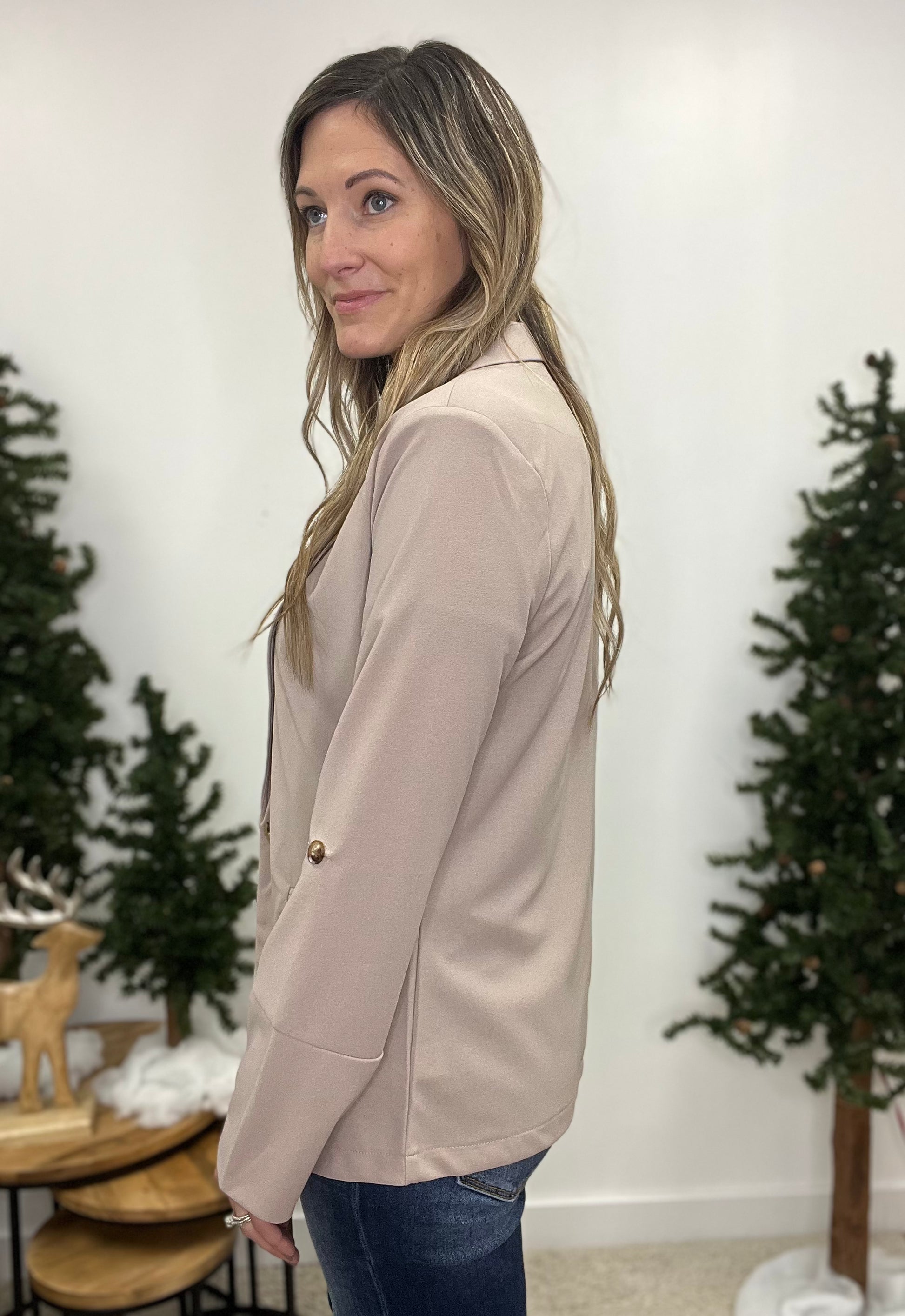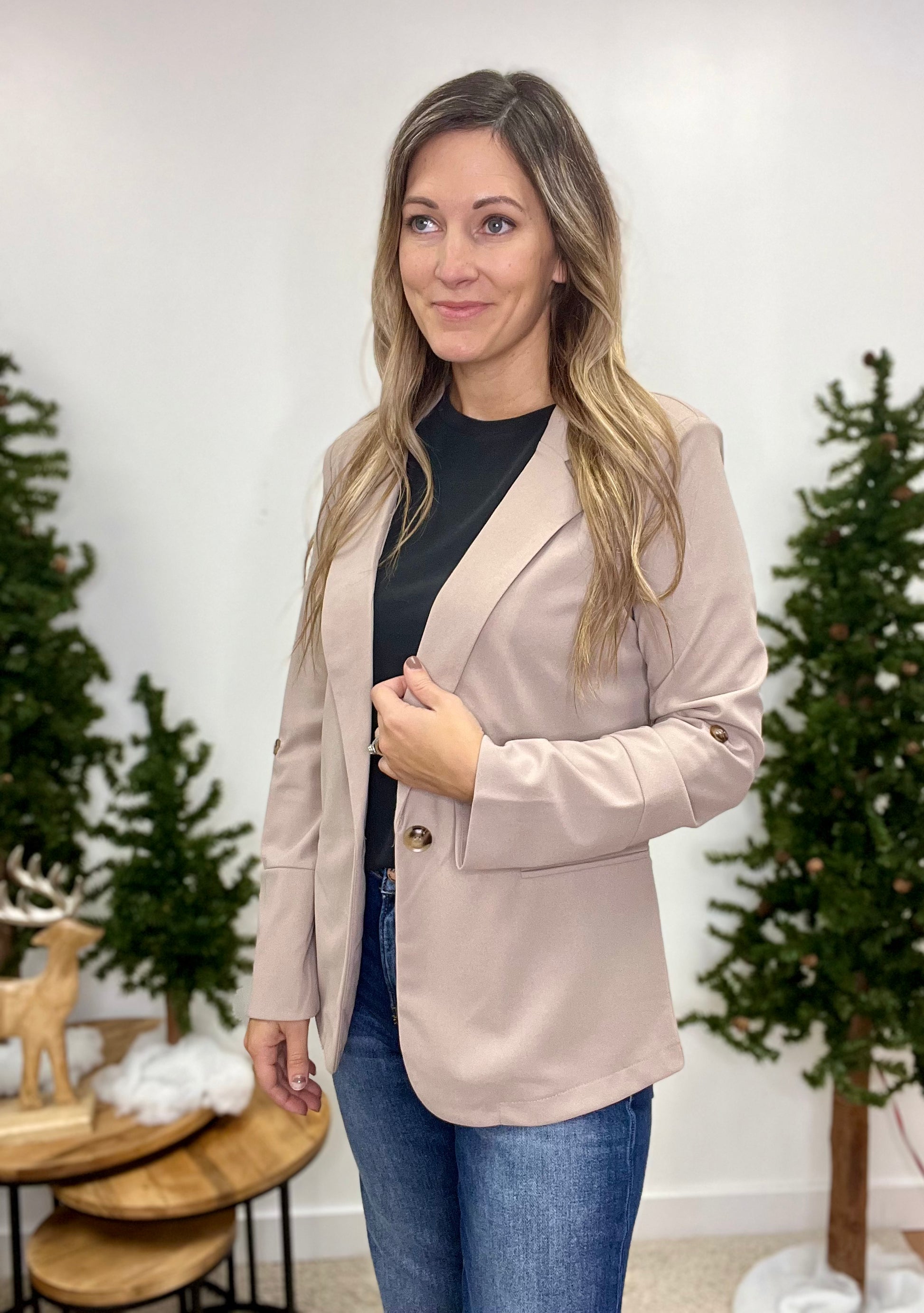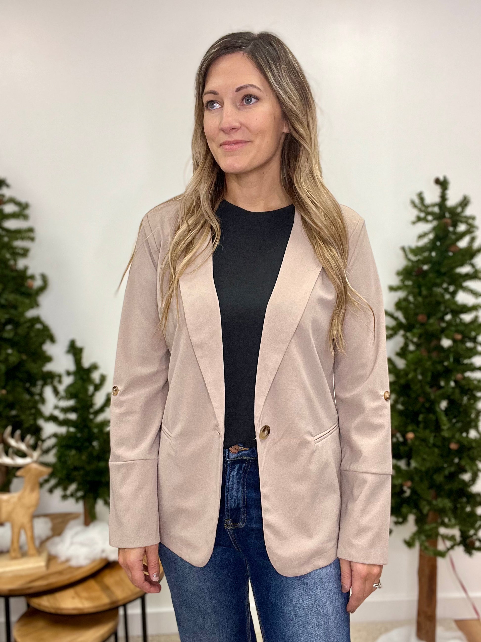 This Khaki Colored Full Length Blazer Features a Single Button Closure on the Front and A Non Functional Pocket Detail. This Blazer Also Features a Button For Rolling The Sleeve. This Blazer Can Make Any Outfit Look Classy!