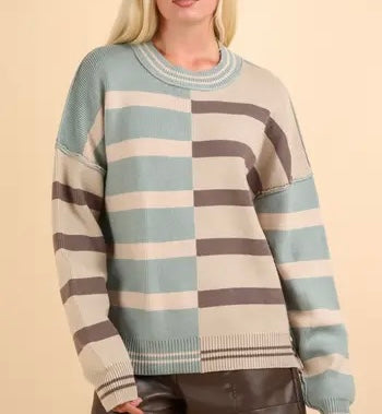 A cozy and stylish color block sweater designed for curvy figures. Featuring a round neckline and a mix of gray, light blue, and cream stripes, this sweater offers a modern yet relaxed vibe. The raw hem detail adds a touch of edge, making it a perfect choice for laid-back days.