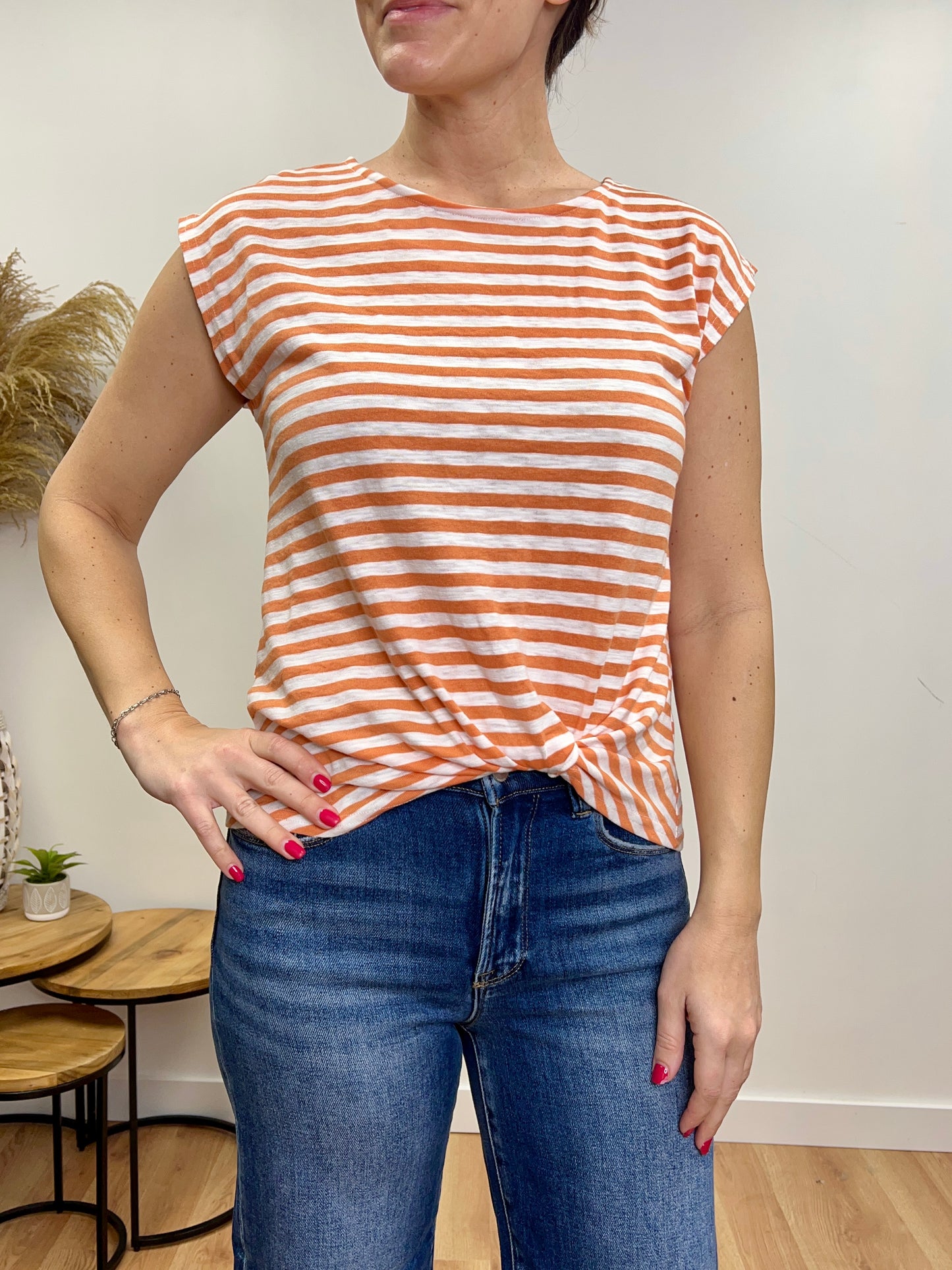 Stay effortlessly stylish in this wide neck, cap sleeve knit top featuring a subtle front twist hem for a flattering touch. Made from soft, slubbed fabric with classic stripes, it’s the perfect blend of casual comfort and modern detail. Pair it with your favorite denim or shorts for an easy, everyday look.