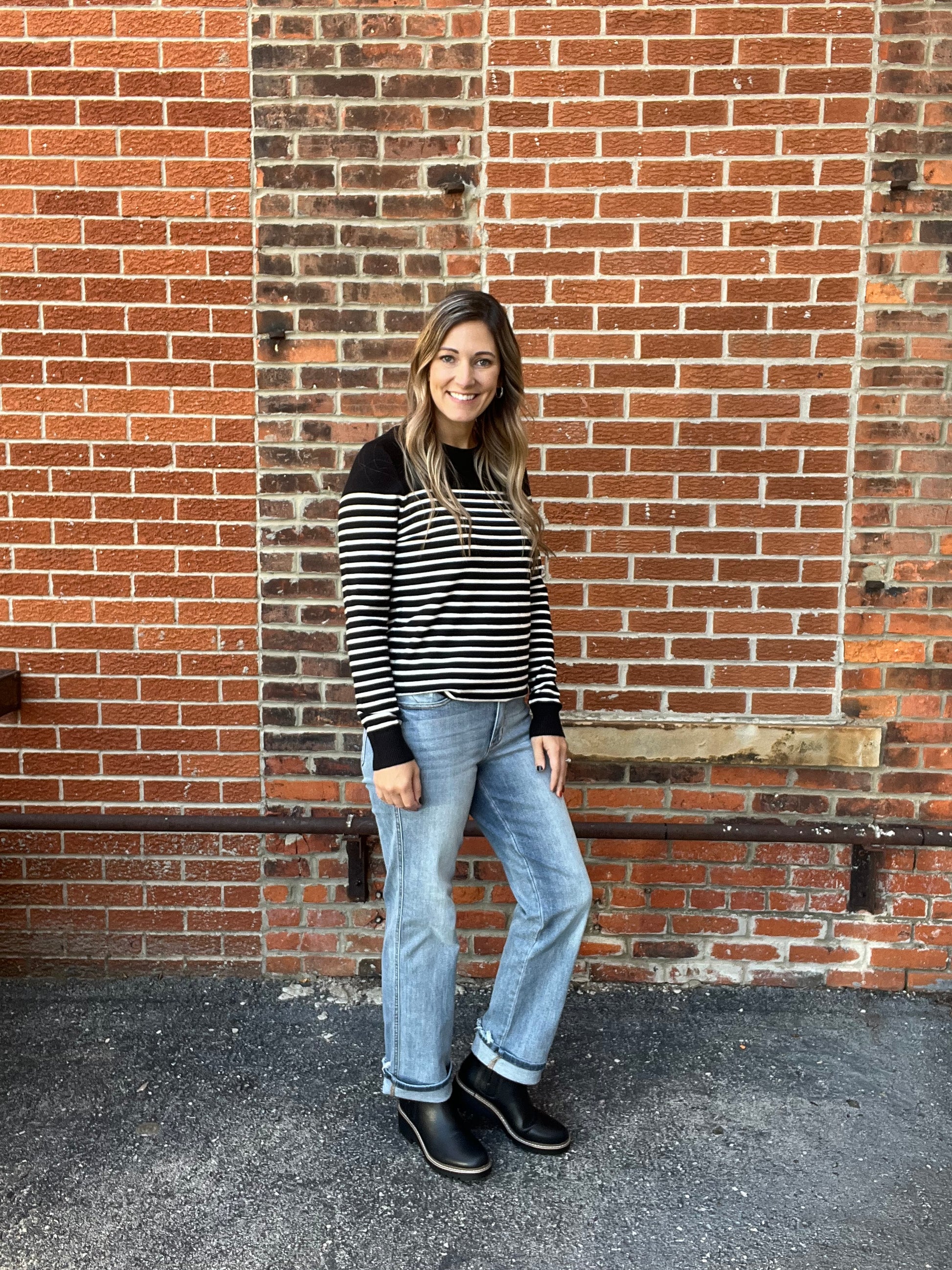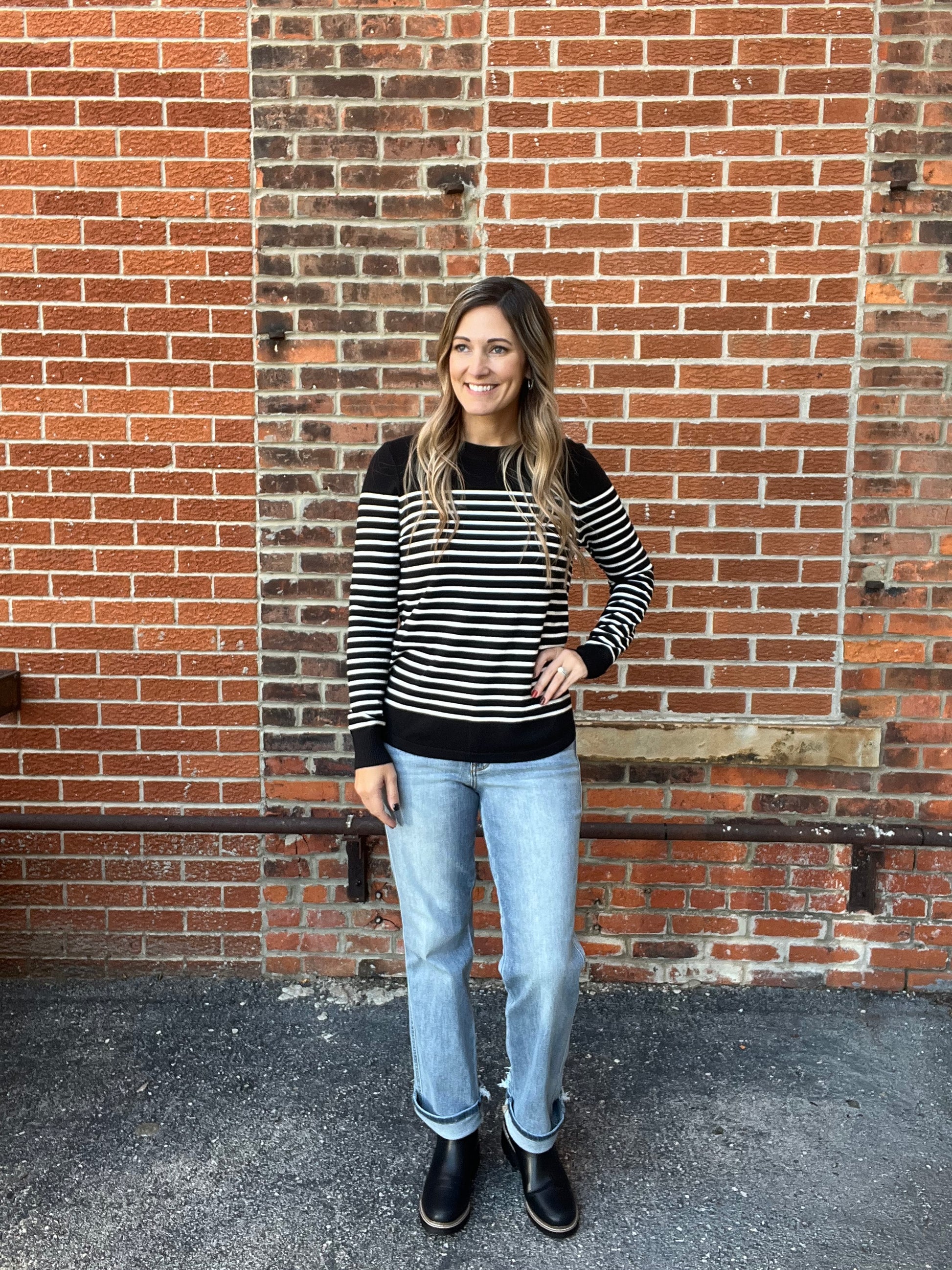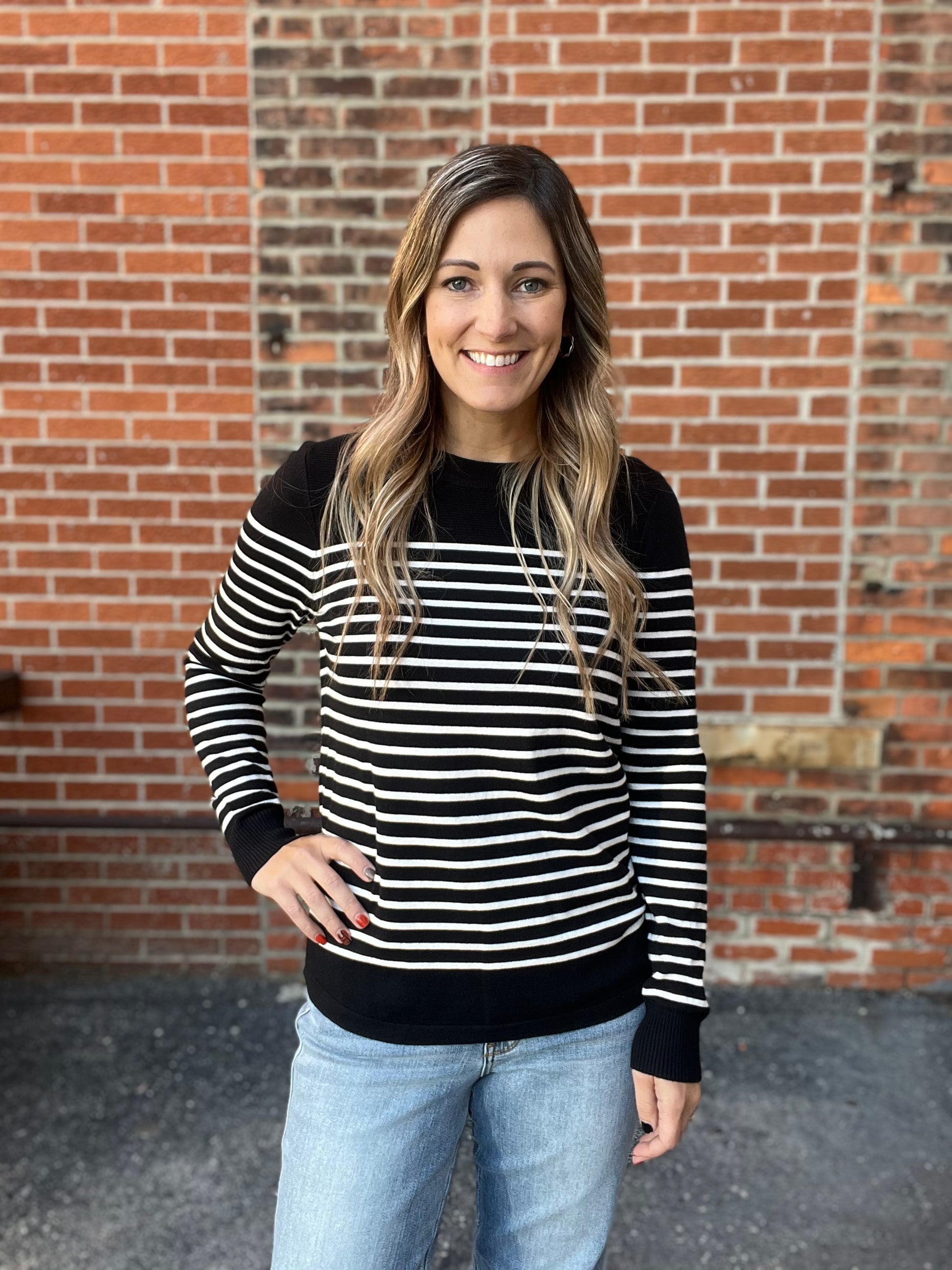 This sleek black and white striped sweater is crafted from a thin, lightweight fabric, making it perfect for layering or wearing on its own. Featuring a classic crew neck, it offers a timeless and versatile look suitable for any occasion.