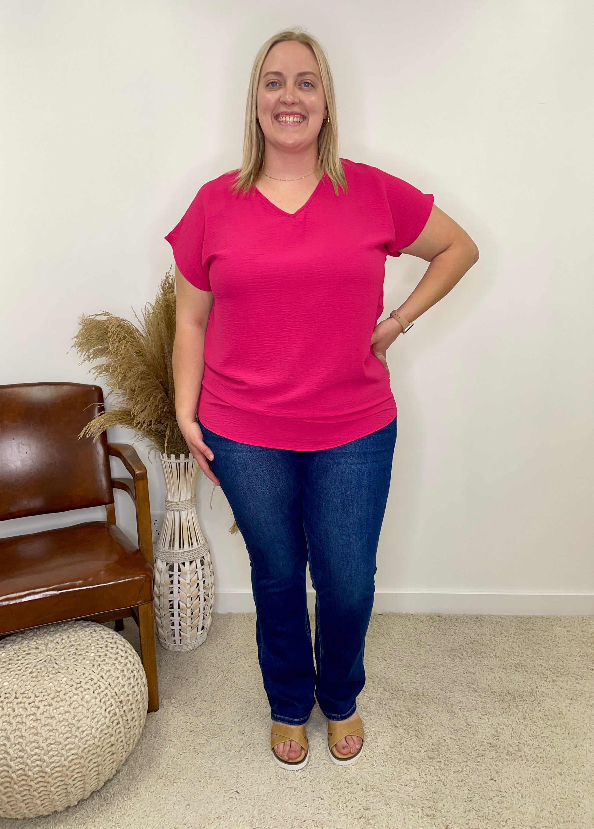 The Jaida Curvy Top is a V Neck Flowy Short Sleeve Top. This Top is a Silky Gauze Material and Very Comfortable. The Fuchsia Color Would Add A Bright Pop Of Color To Your Wardrobe. This Top Is Perfect For All Day Wear and Can Be Dressed Up with Some Accessories or Simple Dressed Casual