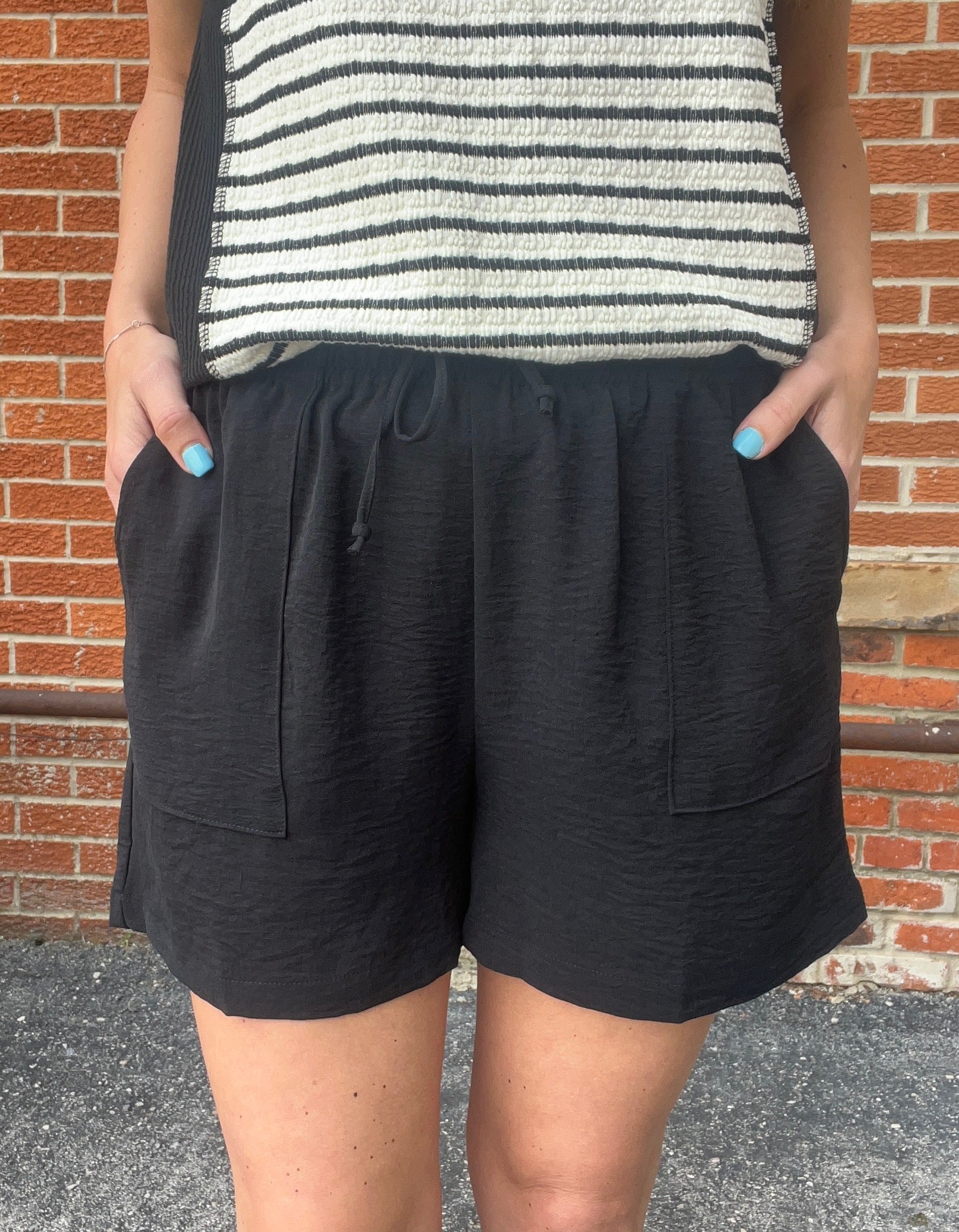 These black shorts are casual and comfortable, made from a soft, lightweight fabric that’s perfect for lounging or warm weather wear. They feature an elastic waistband with a functional drawstring, allowing you to adjust the fit to your liking. Large front patch pockets add both style and practicality. These relaxed fit shorts are ideal for a laid back day or running errands in comfort.
