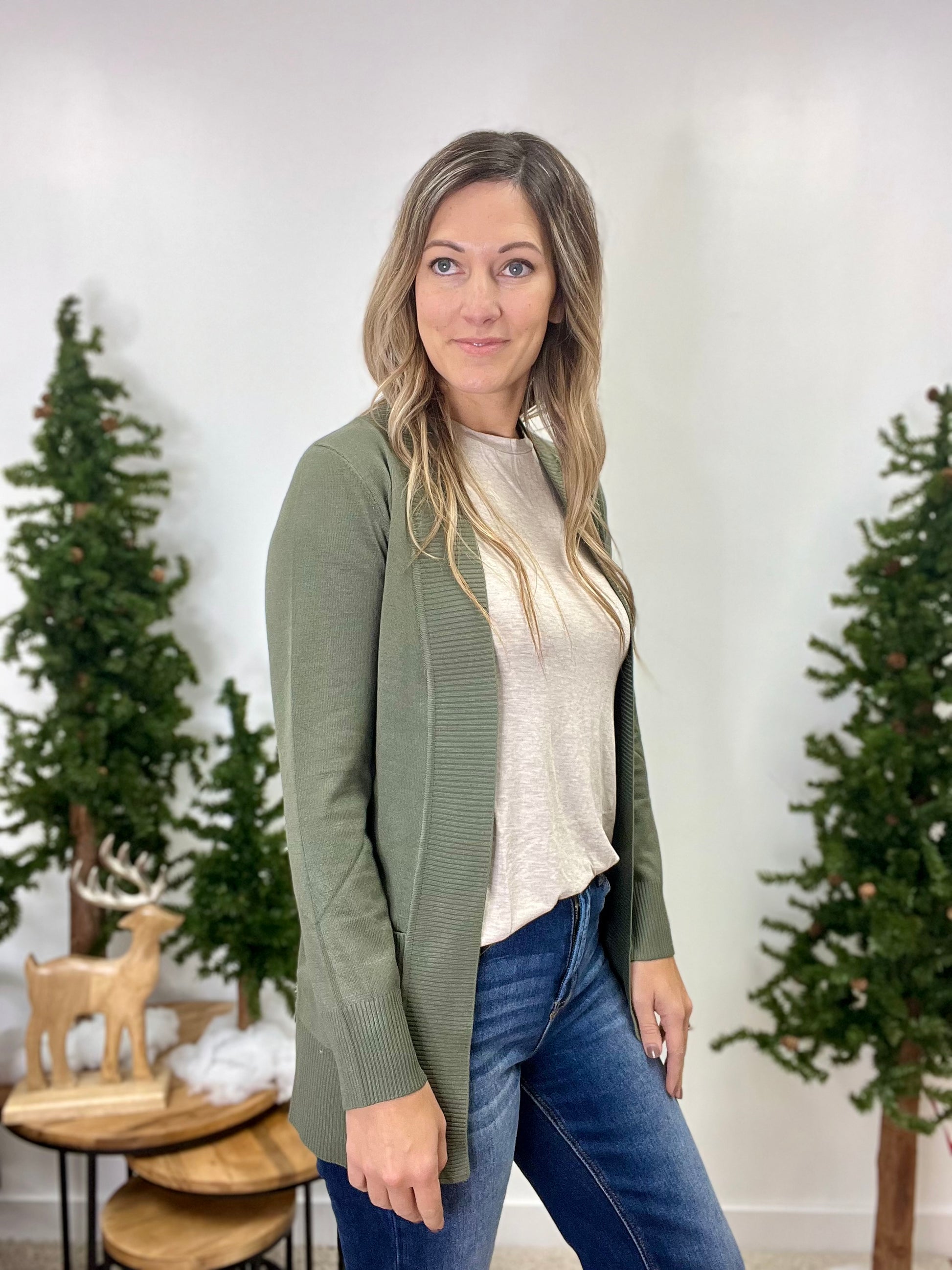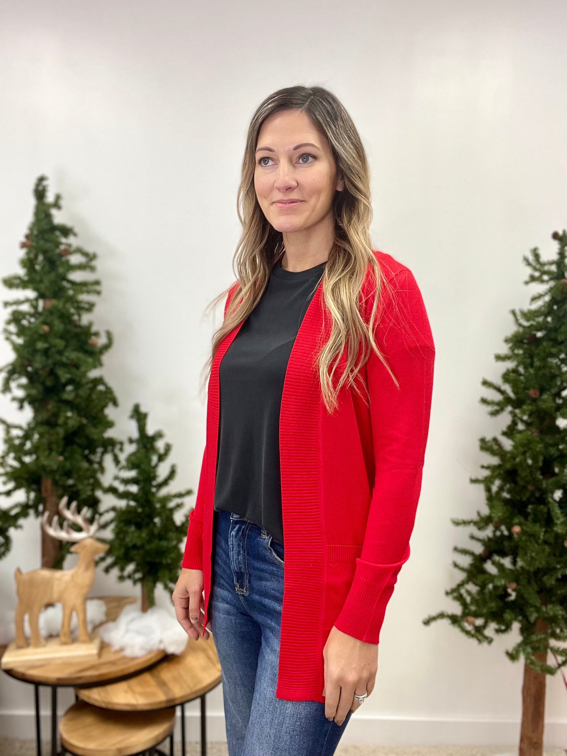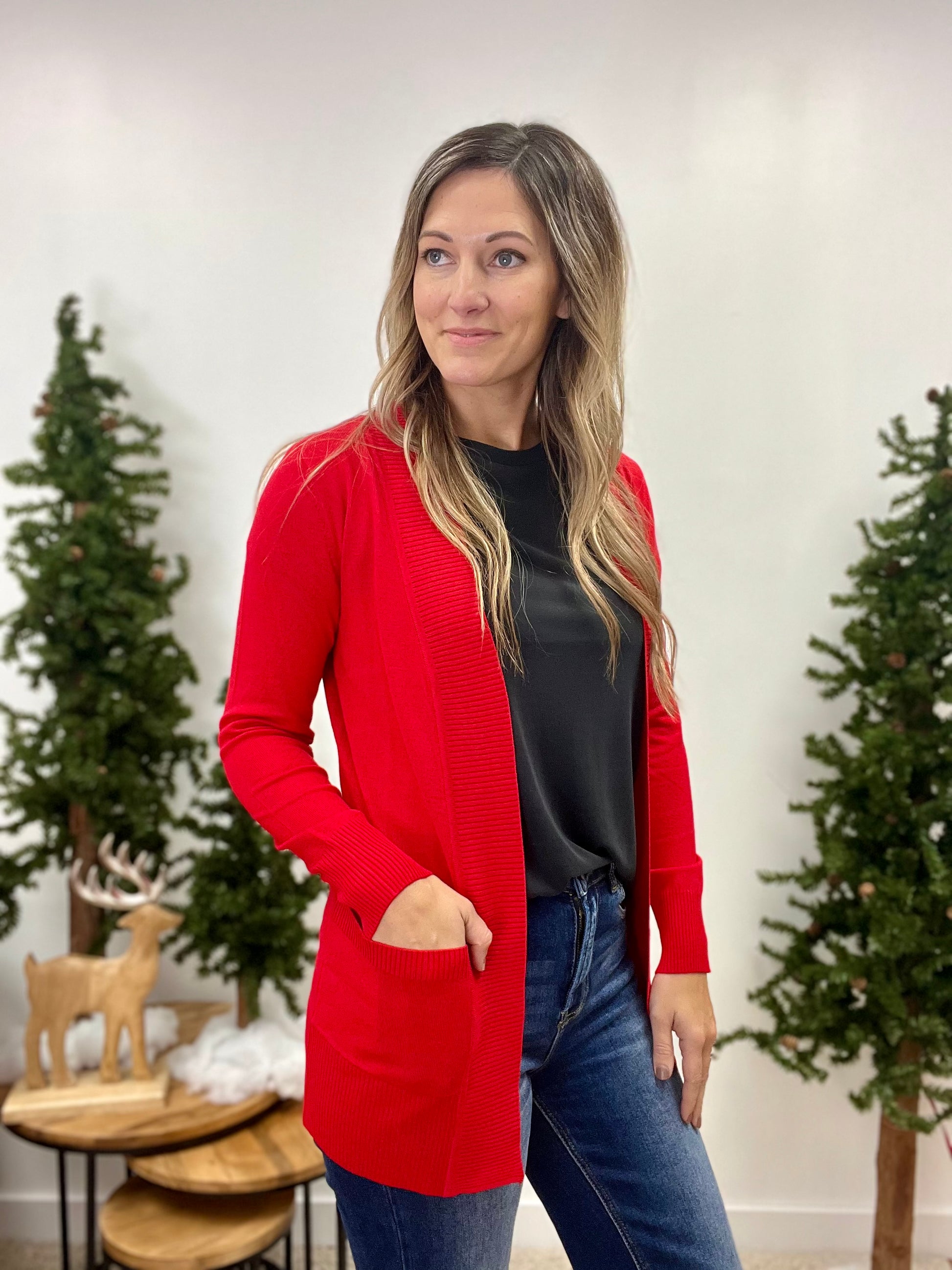 The perfect holiday open-front cardigan is cozy yet lightweight, ideal for layering in all kinds of weather. It should be made from a soft, breathable fabric like a cotton or cashmere blend, giving it a luxurious feel without being too heavy. Look for a relaxed fit with draped sides, maybe with subtle ribbing along the hem and cuffs for added texture and style. A slightly longer length, hitting mid-thigh, makes it easy to throw over dresses, jeans, or leggings. Neutral colors like cream, navy, or soft gray keep it versatile, while pockets add a practical touch. Perfect for evenings by the fire or strolling through festive markets!