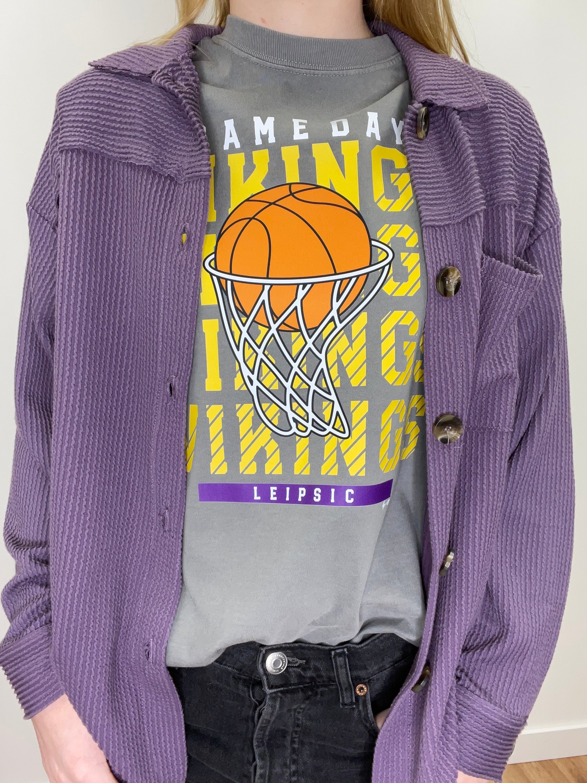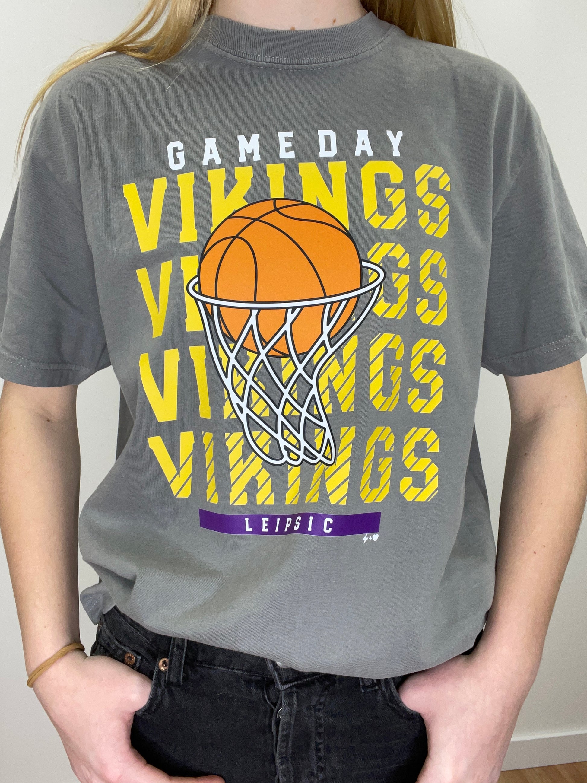 A versatile grey Viking game day tee designed for sports enthusiasts. The graphic features a bold basketball and hoop design, accompanied by Viking-themed elements that celebrate team spirit and athleticism.