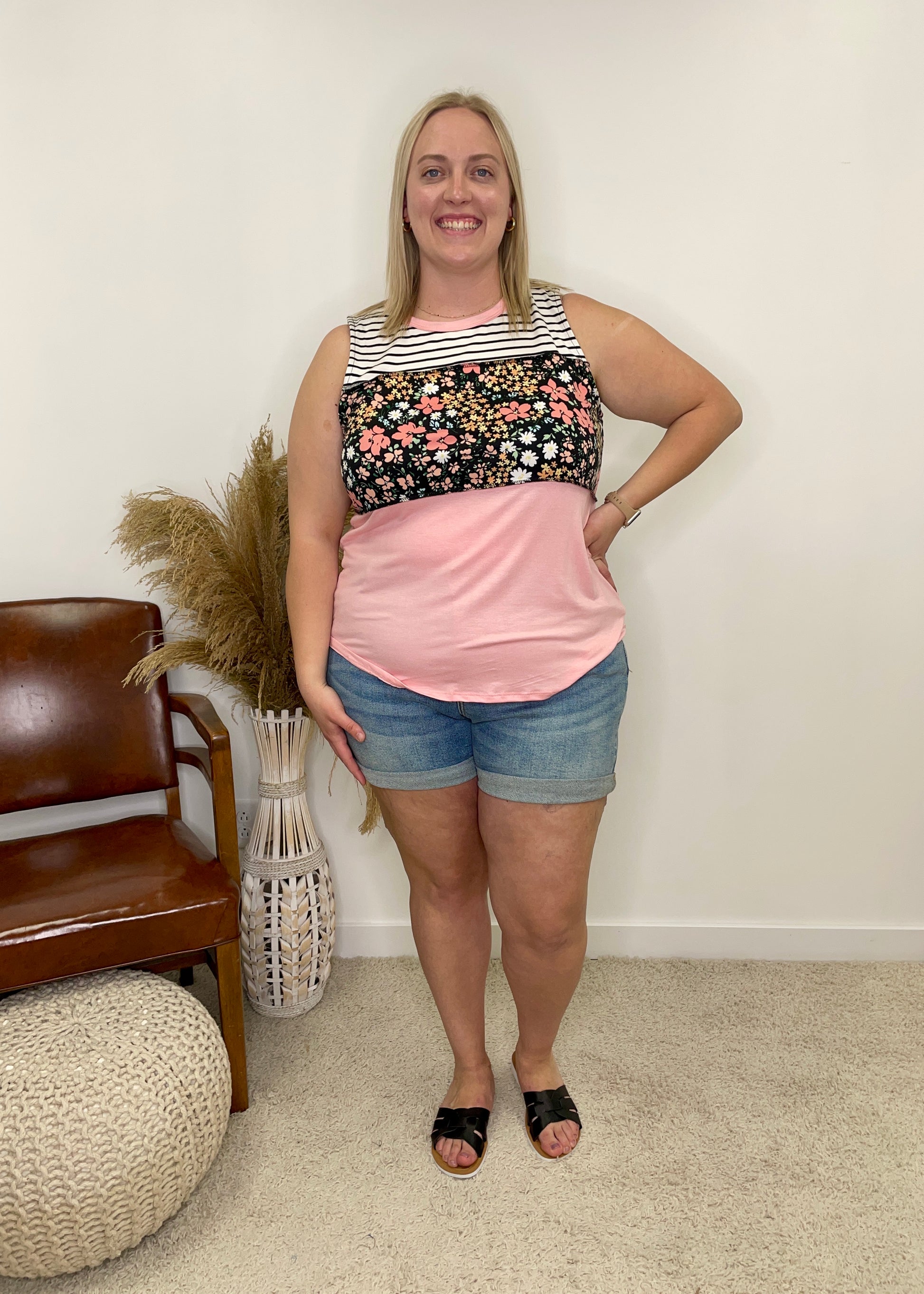 This Top Features A Striped Pattern, Along With a Floral Print and a Solid Light Pink Color Block. This Fun Top Could Make Any Outfit Colorful and Fun. The JoJo Tank is Buttery Soft and Flowy