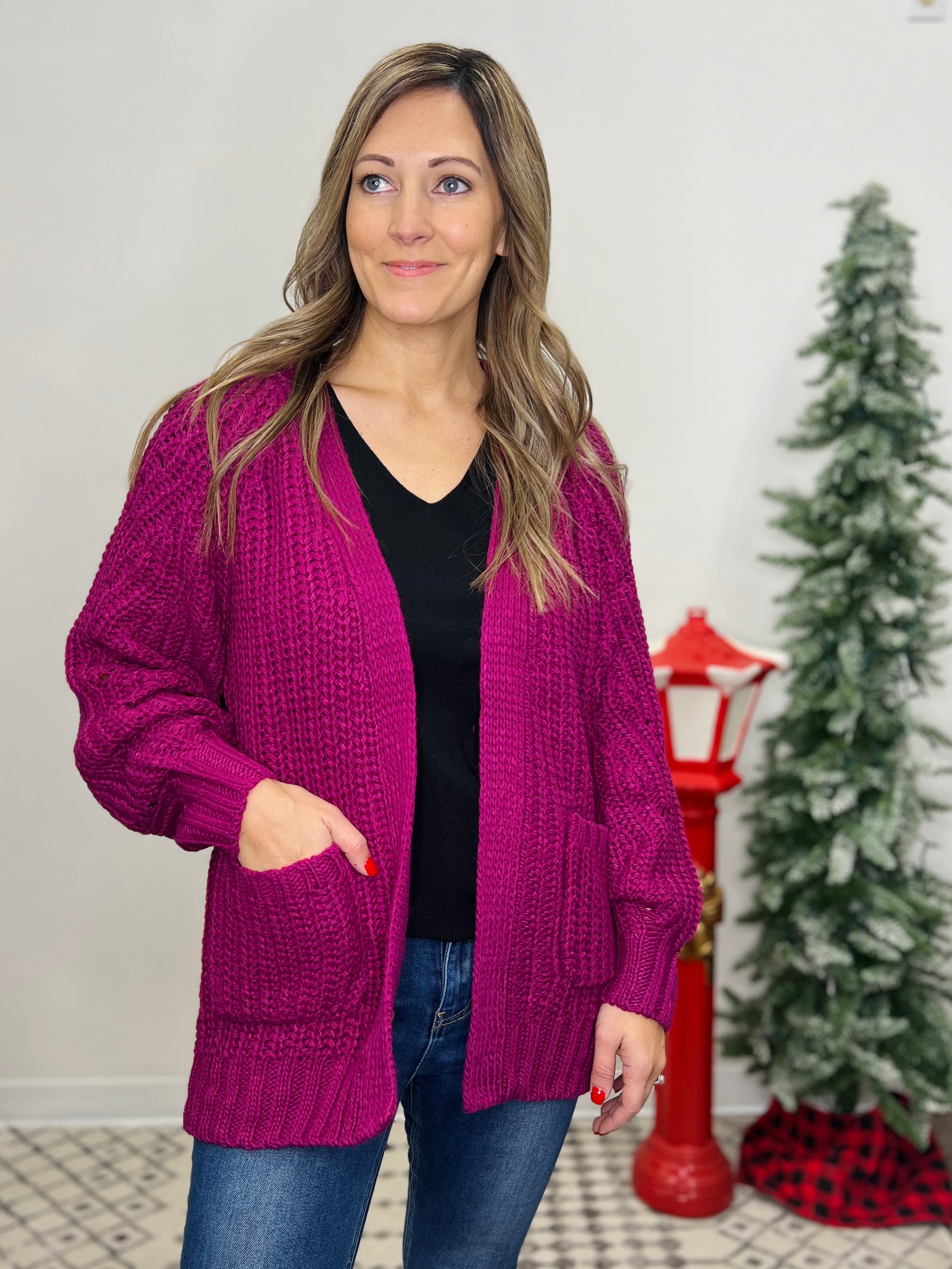 This thick open-front cardigan is designed for ultimate comfort and warmth. It features a cozy knit texture that adds a stylish, tactile element to the garment. The cardigan includes practical front pockets, perfect for keeping your hands warm or holding small essentials. Its open-front design makes it easy to layer over any outfit, adding both functionality and a chic, relaxed look. This versatile piece is ideal for cooler weather, offering both style and practicality.