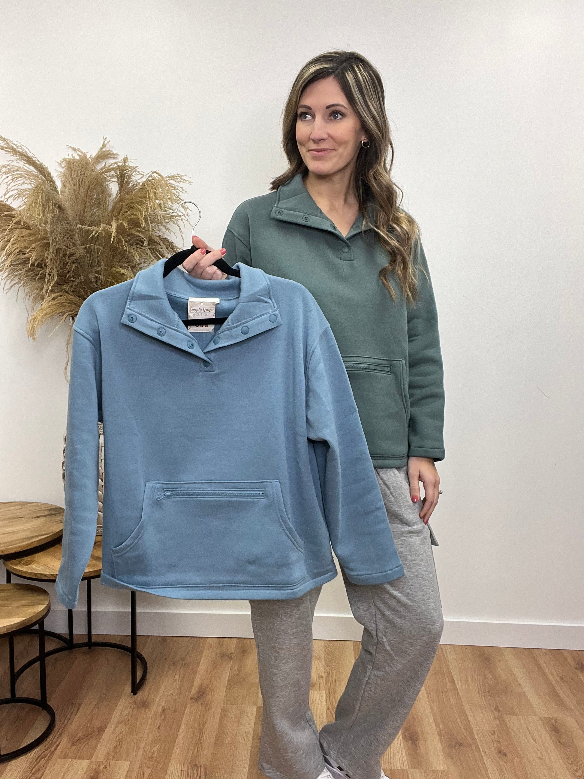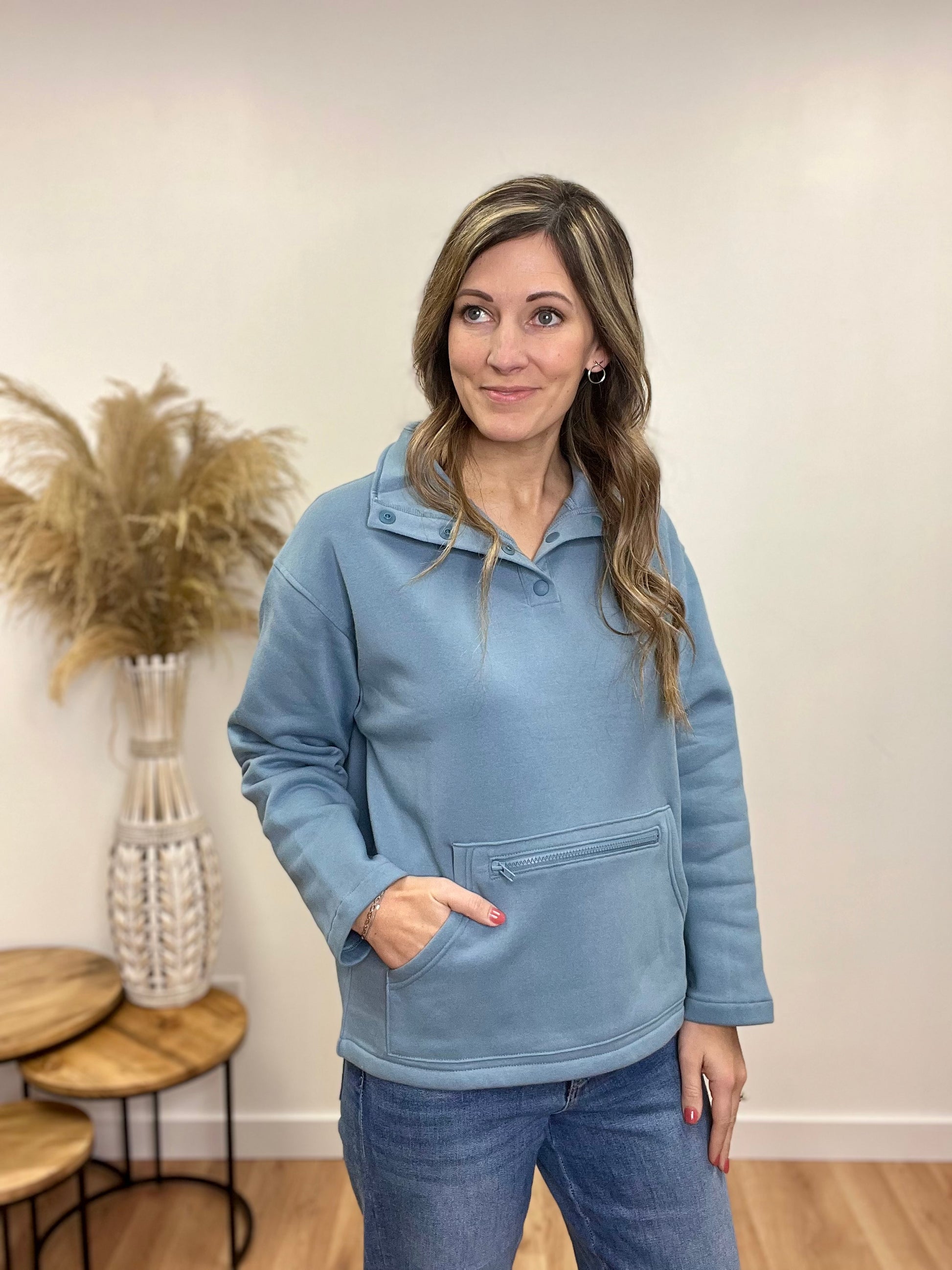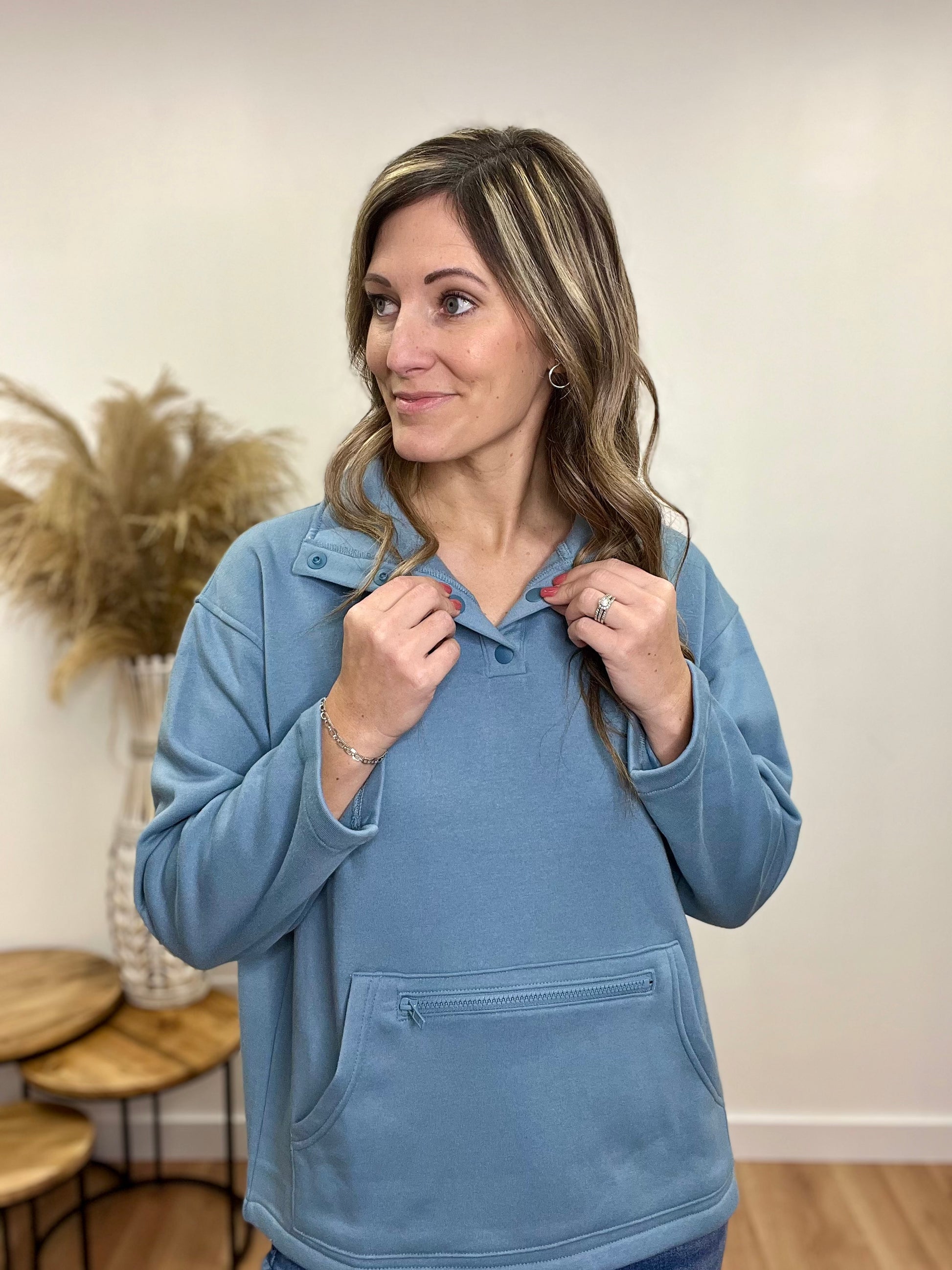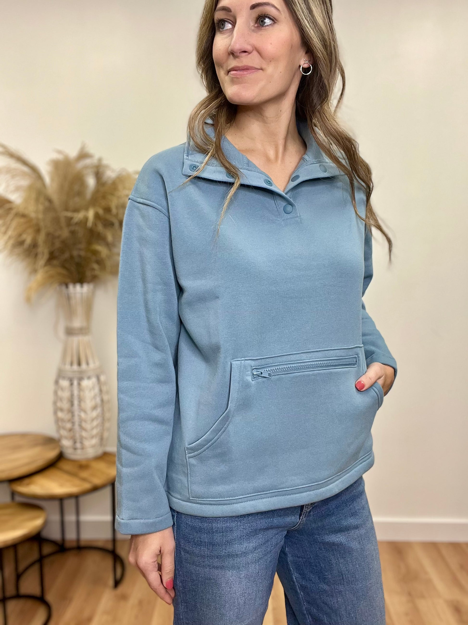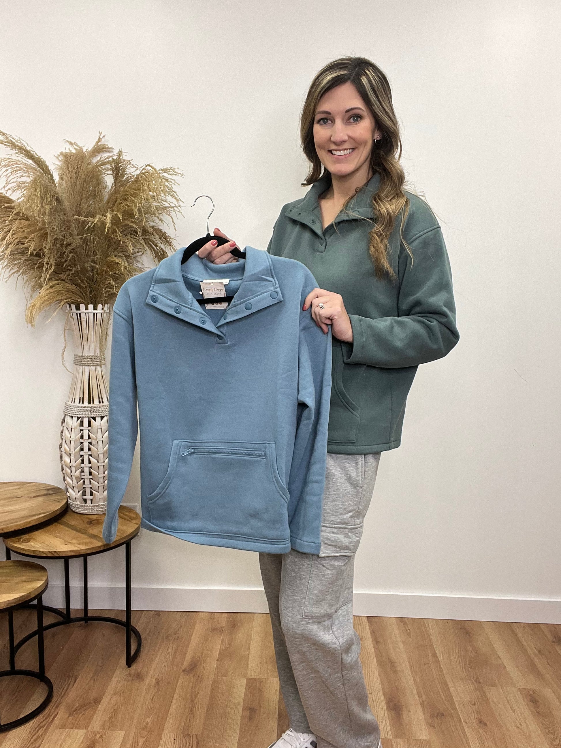 Stay cozy and functional with our Quarter Snap Top featuring a Kangaroo Pocket. Designed with a modern twist, this top includes a unique single zipper on top of the pocket, offering secure storage for your essentials. The quarter snap neckline adds versatility and style, allowing for adjustable coverage and a laid-back vibe.