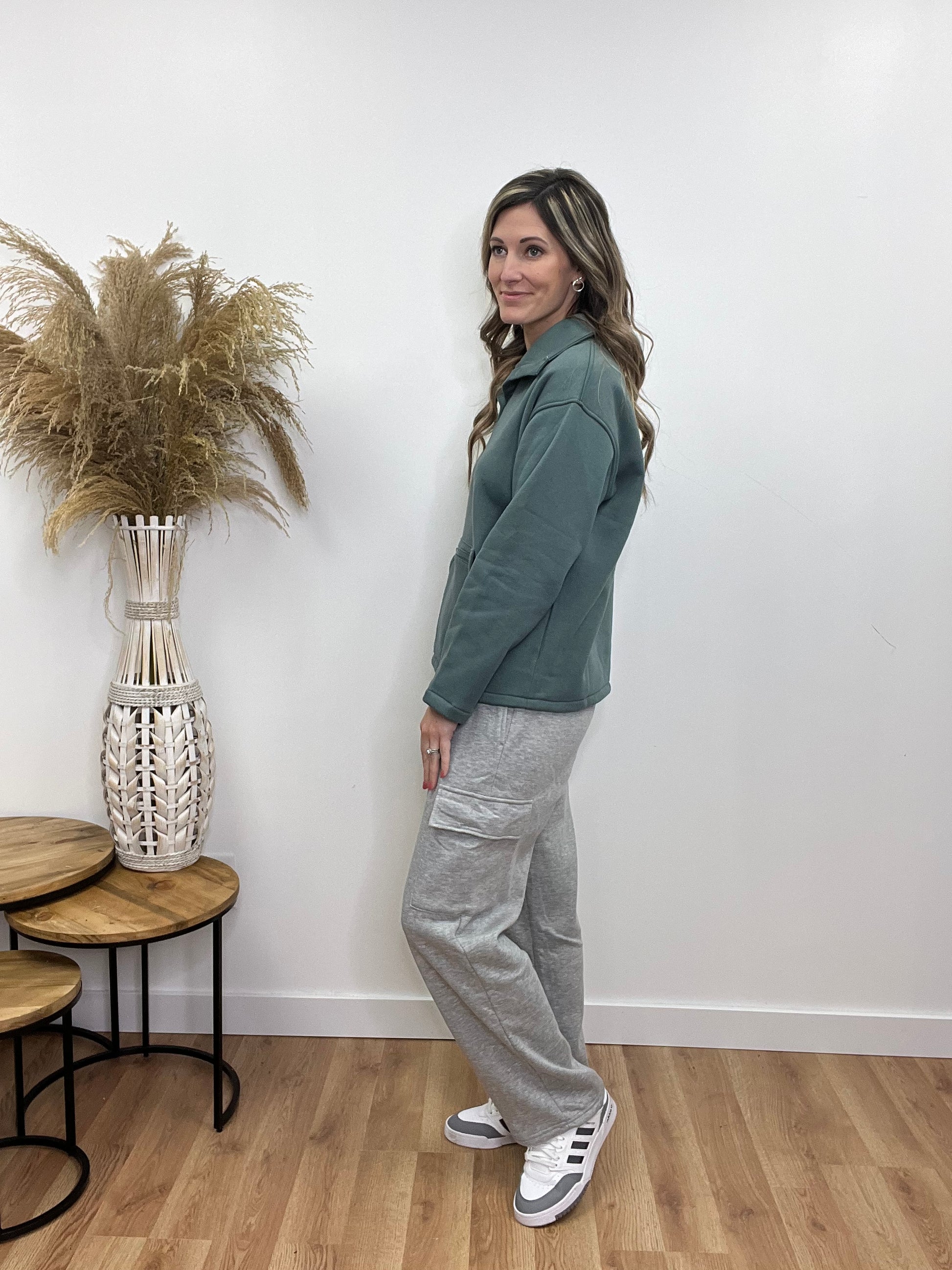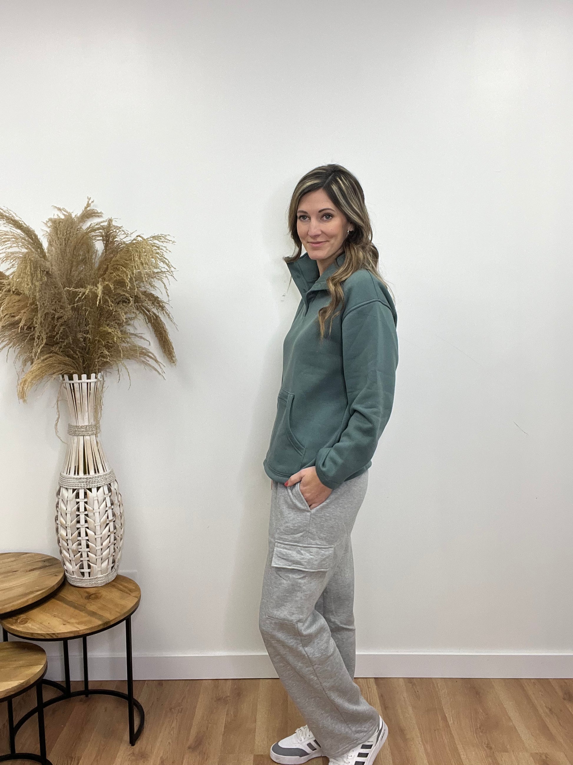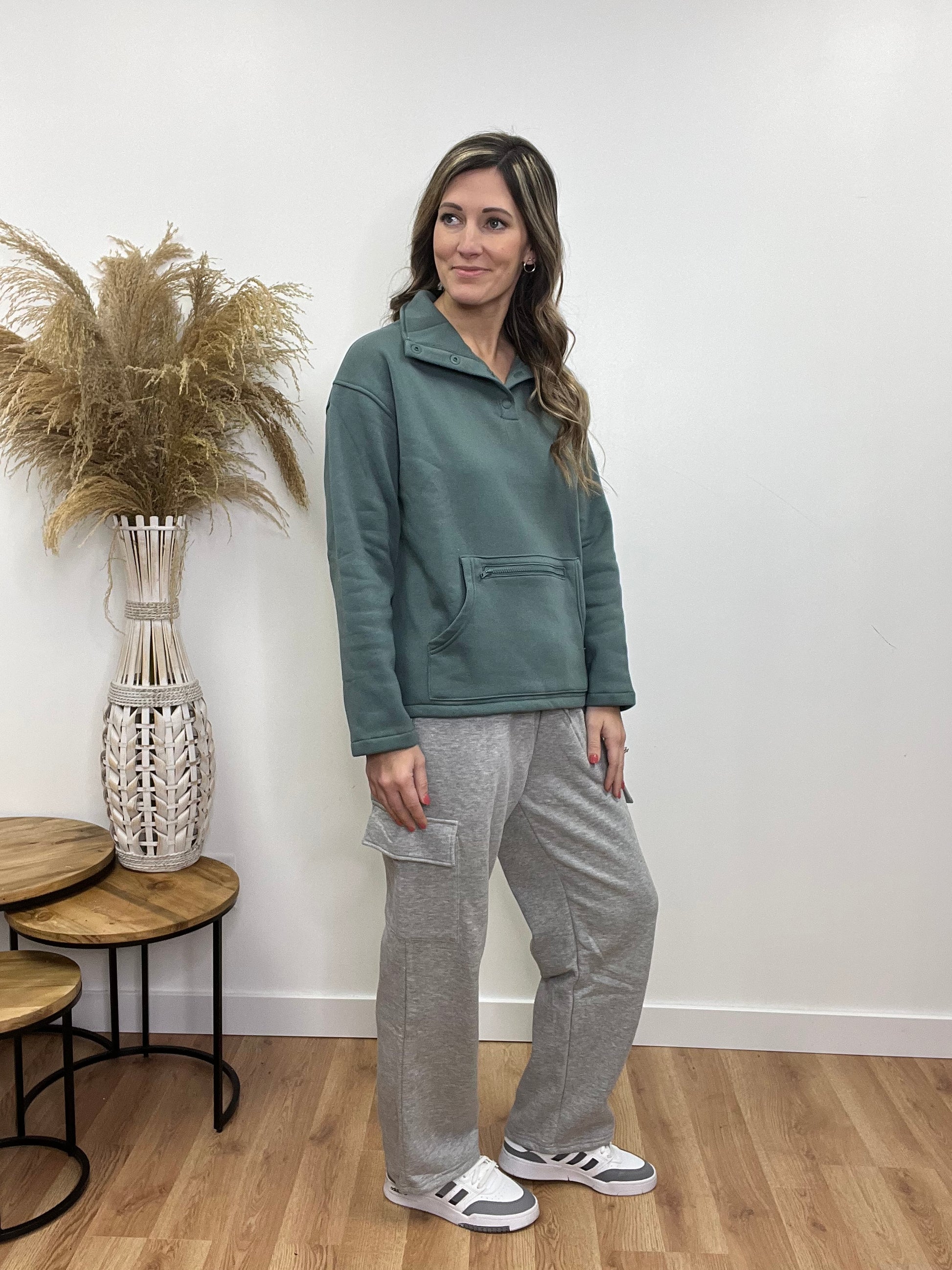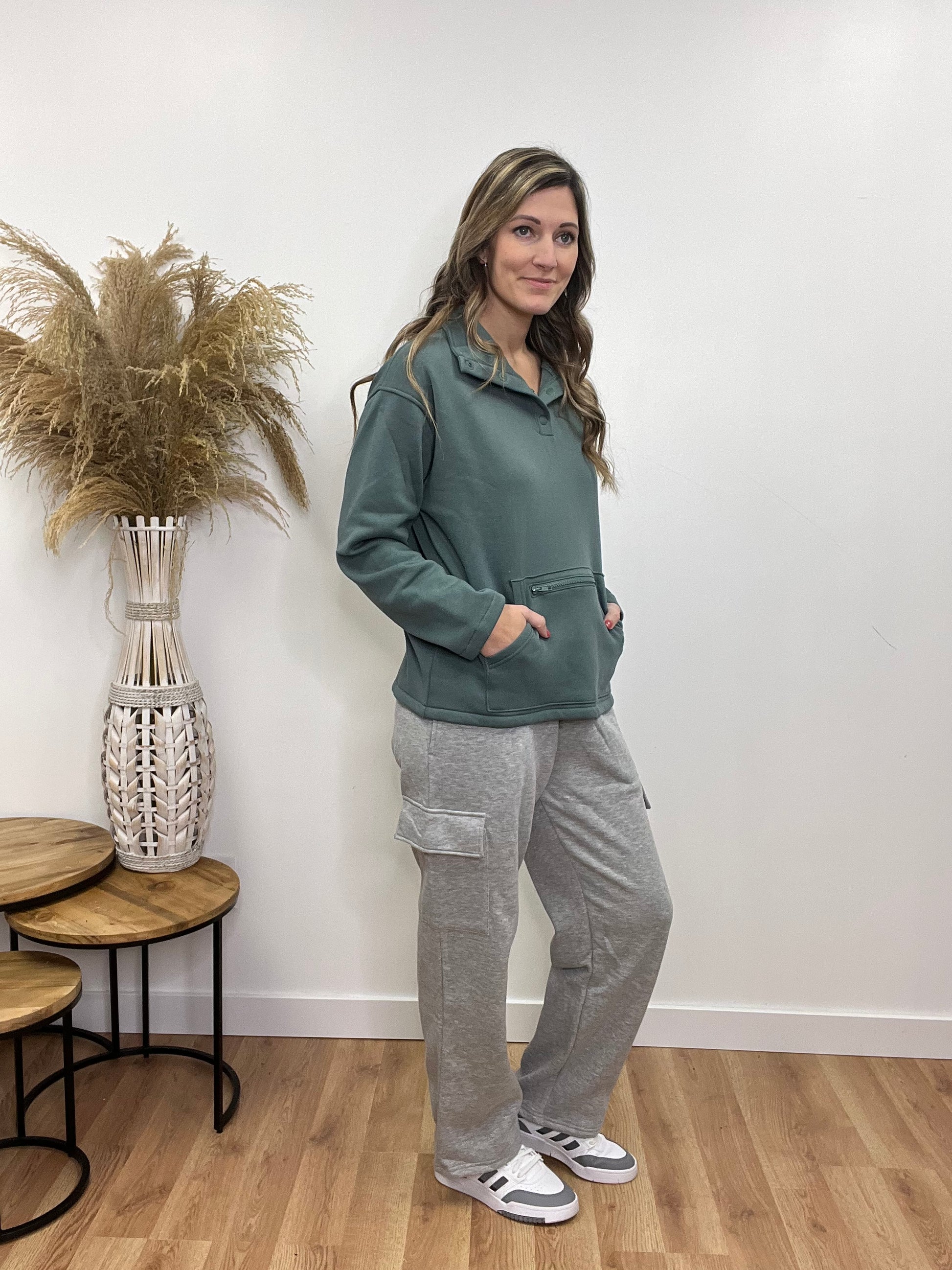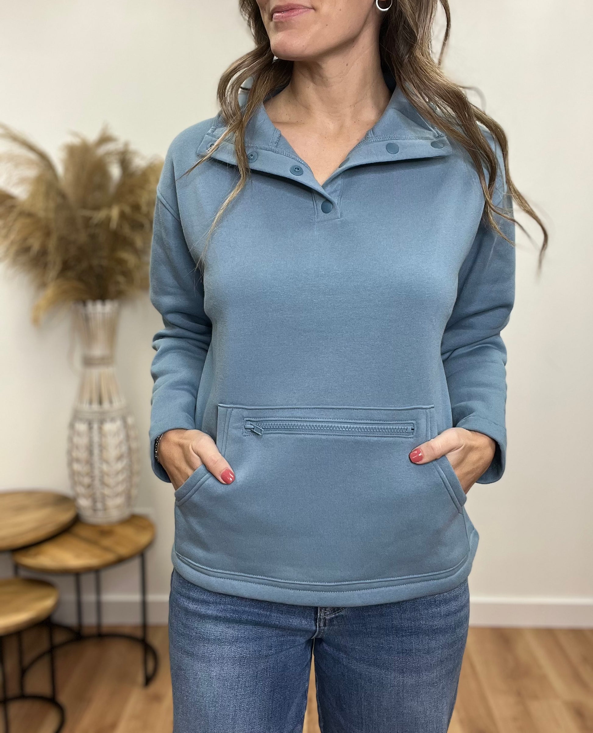 Stay cozy and functional with our Quarter Snap Top featuring a Kangaroo Pocket. Designed with a modern twist, this top includes a unique single zipper on top of the pocket, offering secure storage for your essentials. The quarter snap neckline adds versatility and style, allowing for adjustable coverage and a laid-back vibe.