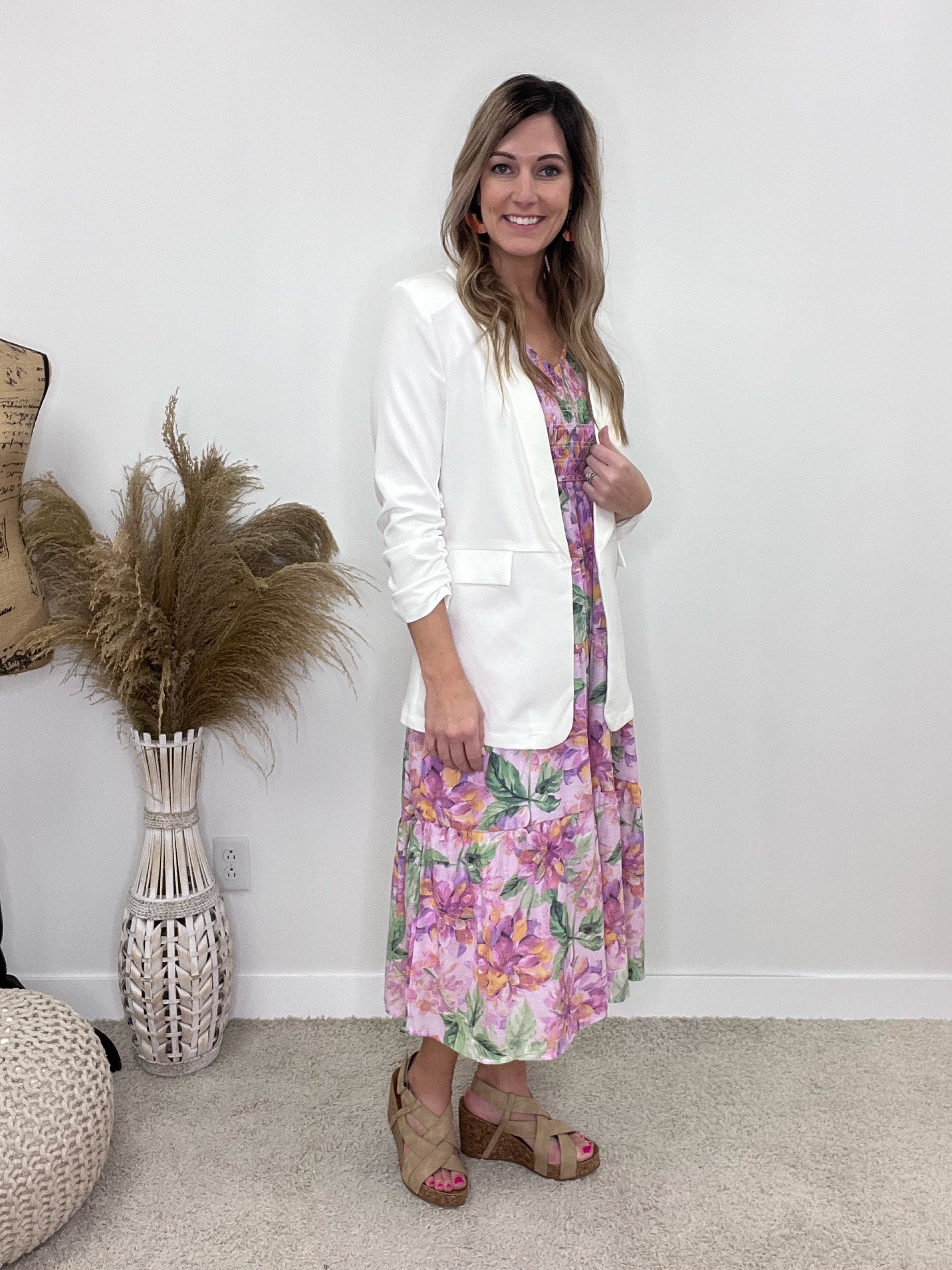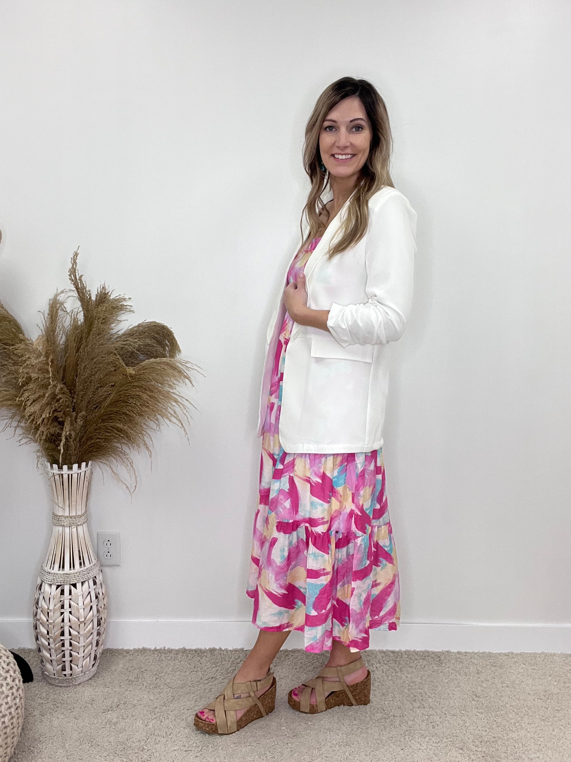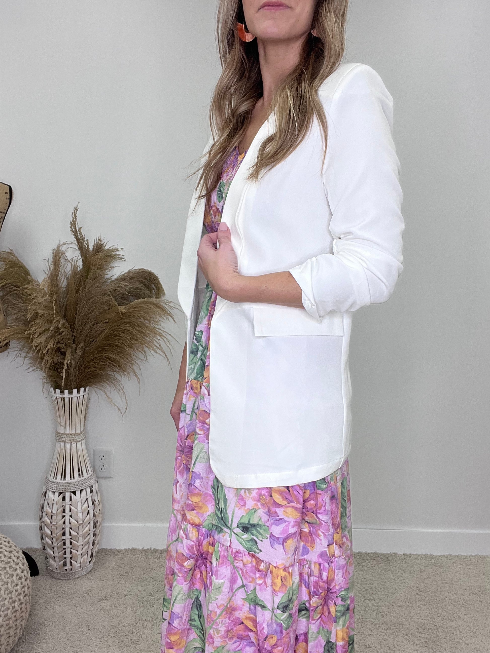 Ruched Sleeve Blazer With Shoulder Pads And Two Front Pockets. Has A 3/4 Length Scrunched Sleeve