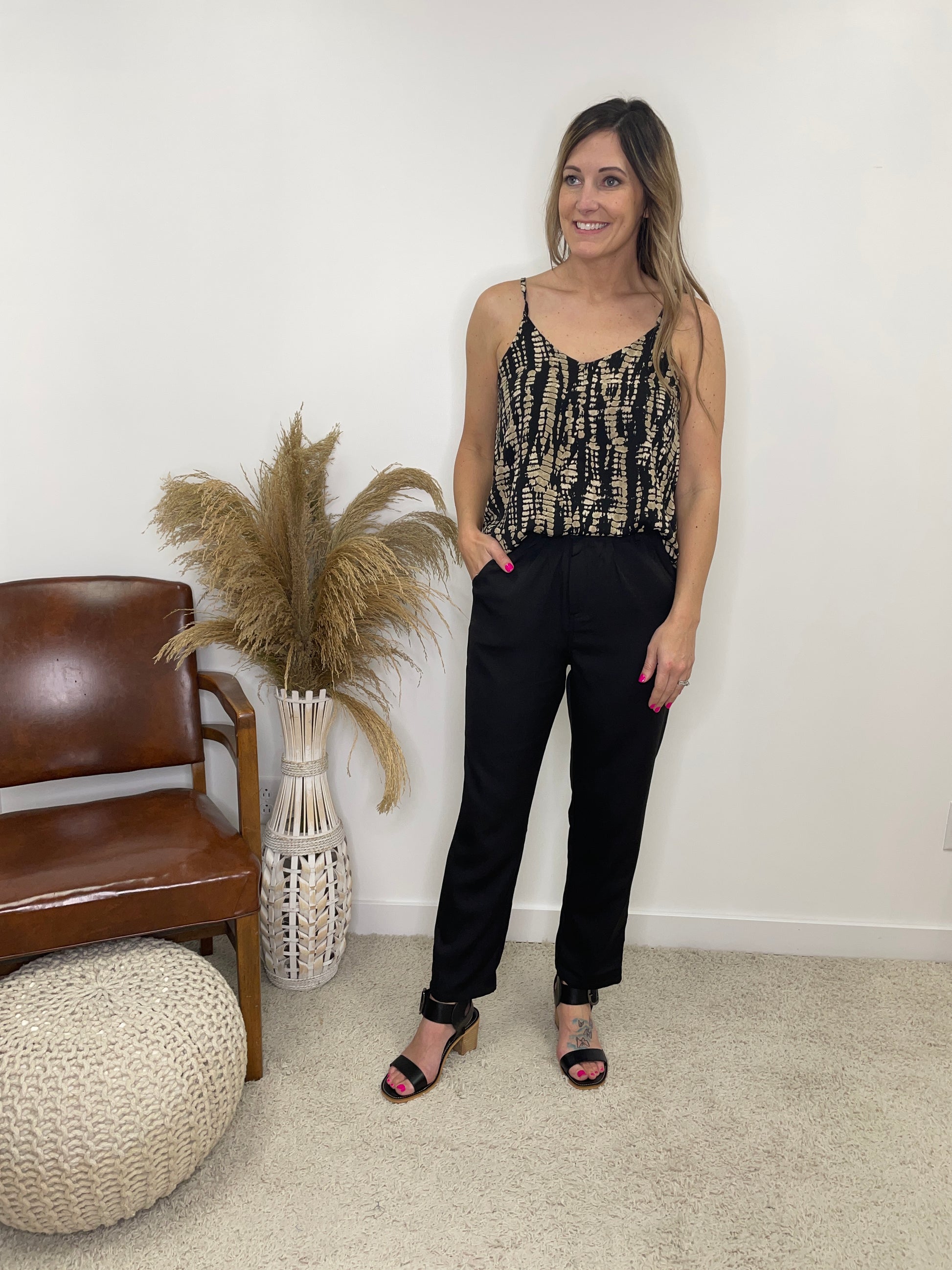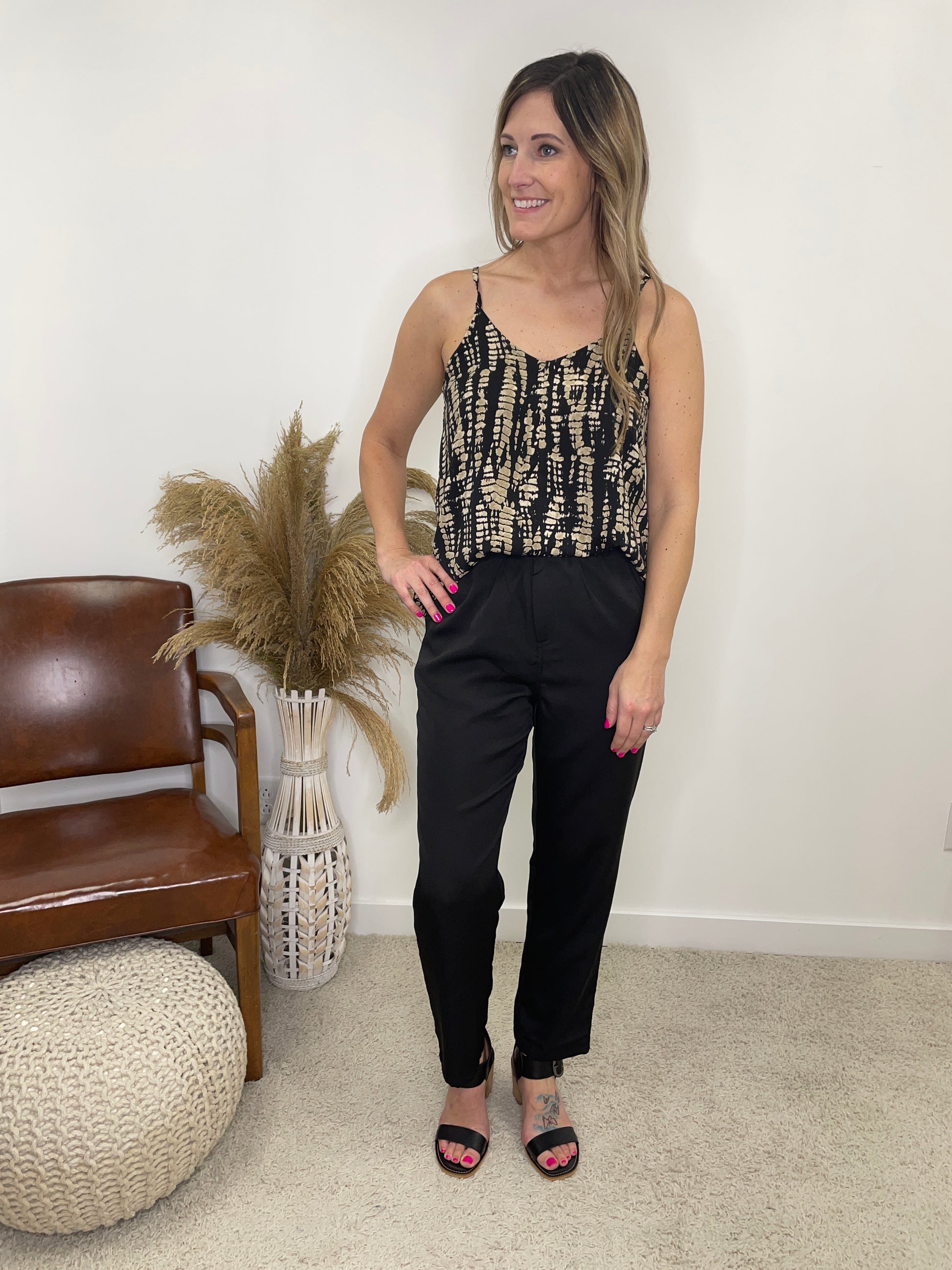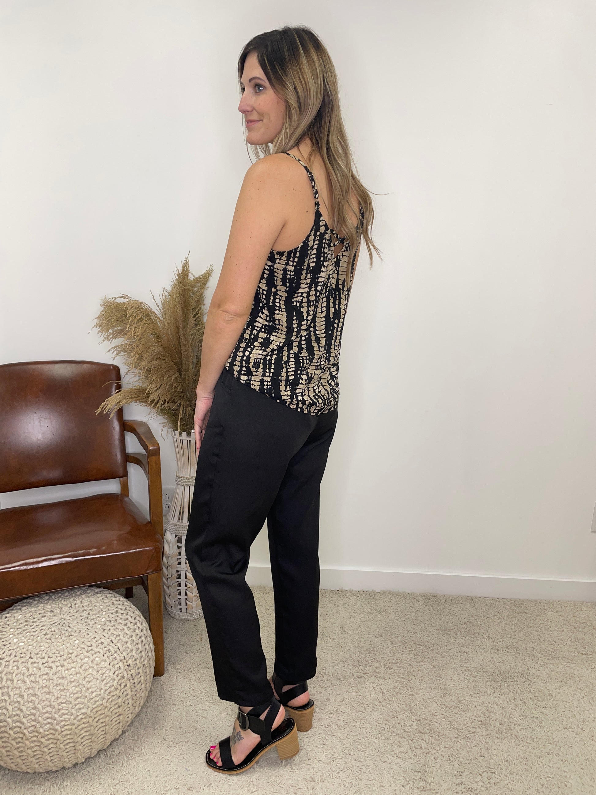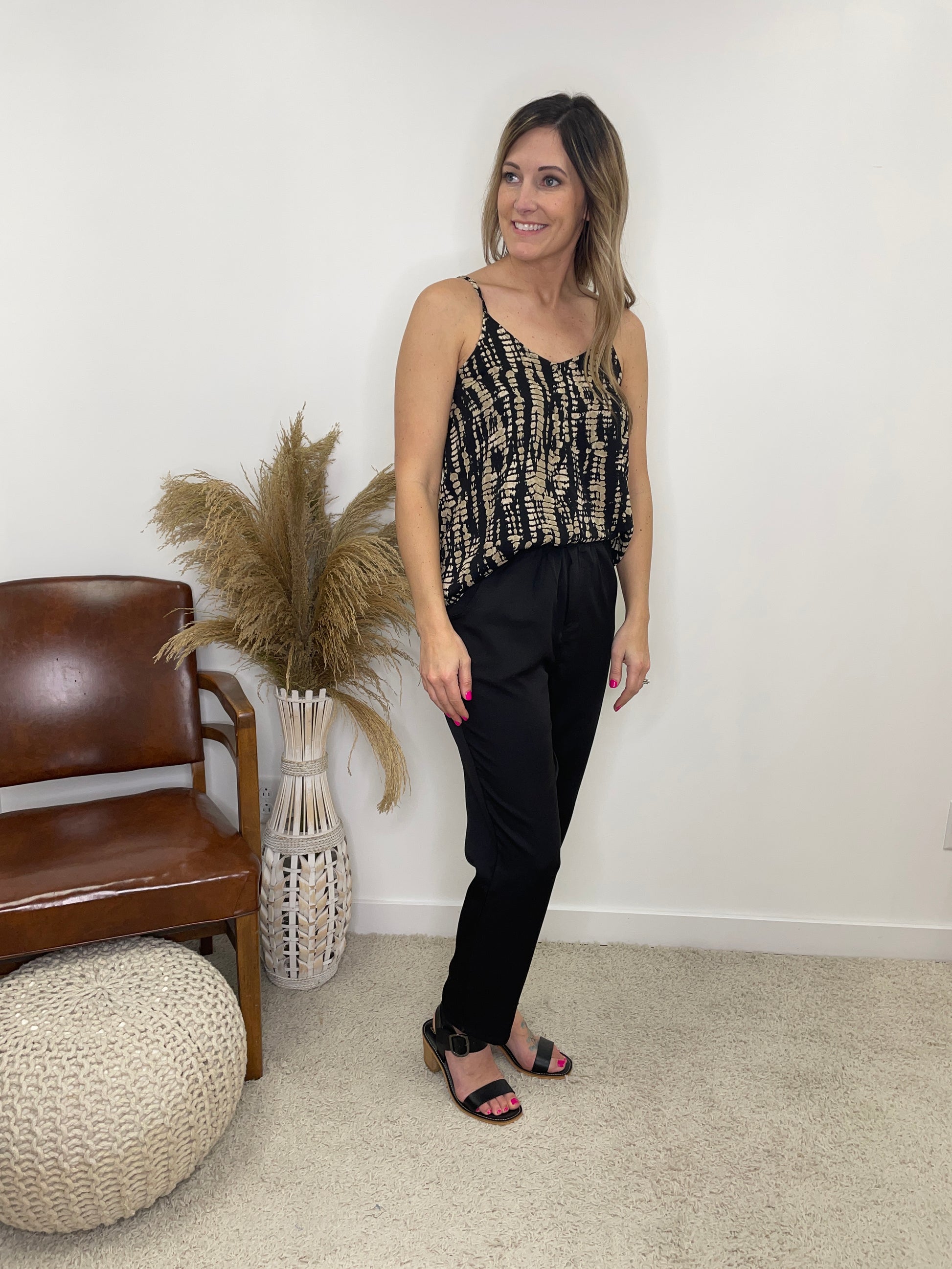 The Double Criss Cross Back Adds A Simple Detail To This Fun Print. This Tank Also Features Adjustable Straps, V Neckline, Criss Cross Back Detail And A Unique Print.