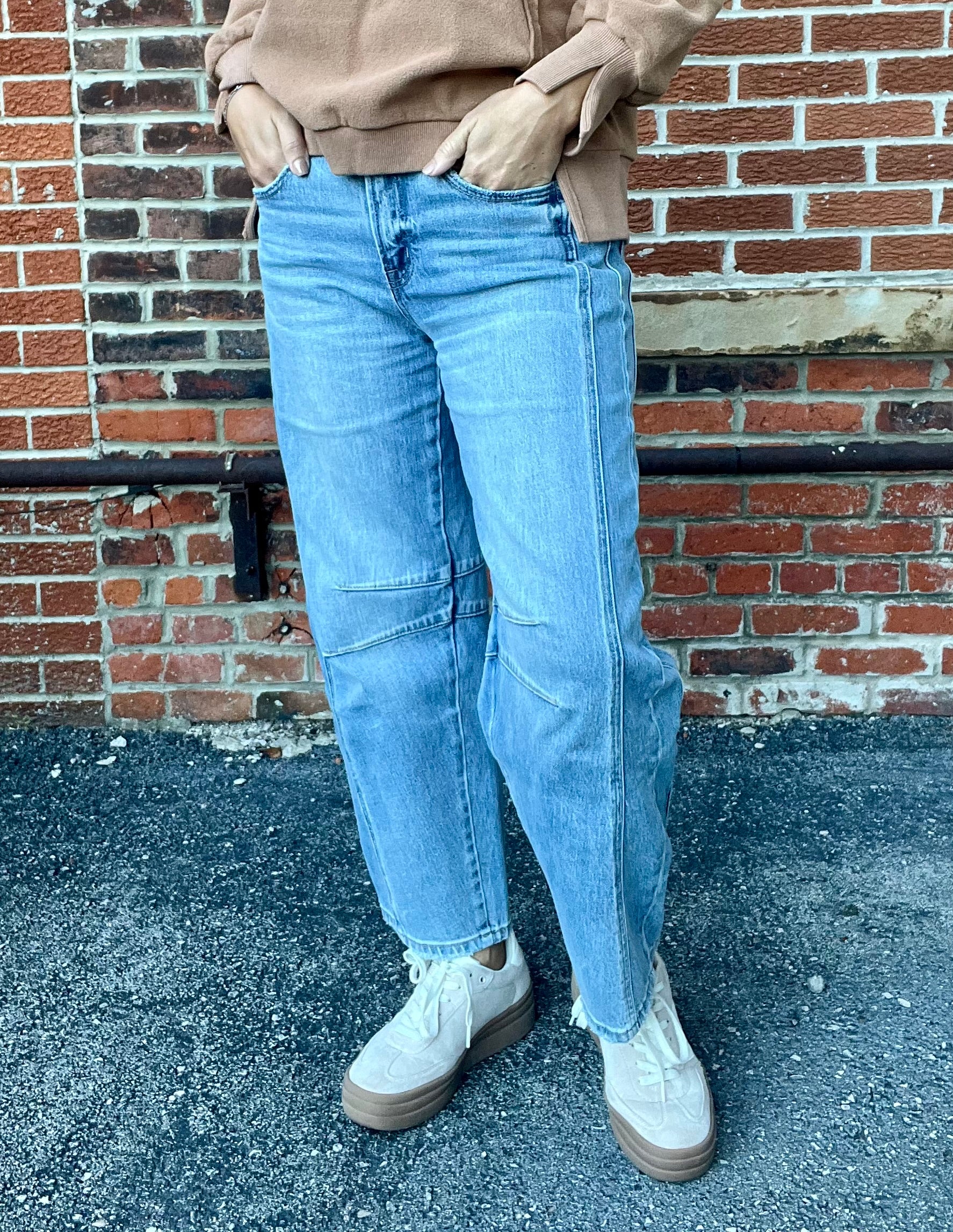 Step into style with these chic barrel leg jeans, crafted with a flattering high rise fit and light stretch for comfort. Designed without distressing, they keep a clean, polished look while still feeling modern. The unique side detail sets them apart, adding a subtle statement to your everyday denim. Perfect for pairing with tees, sweaters, or blouses, these jeans are a fun must have for effortless style.