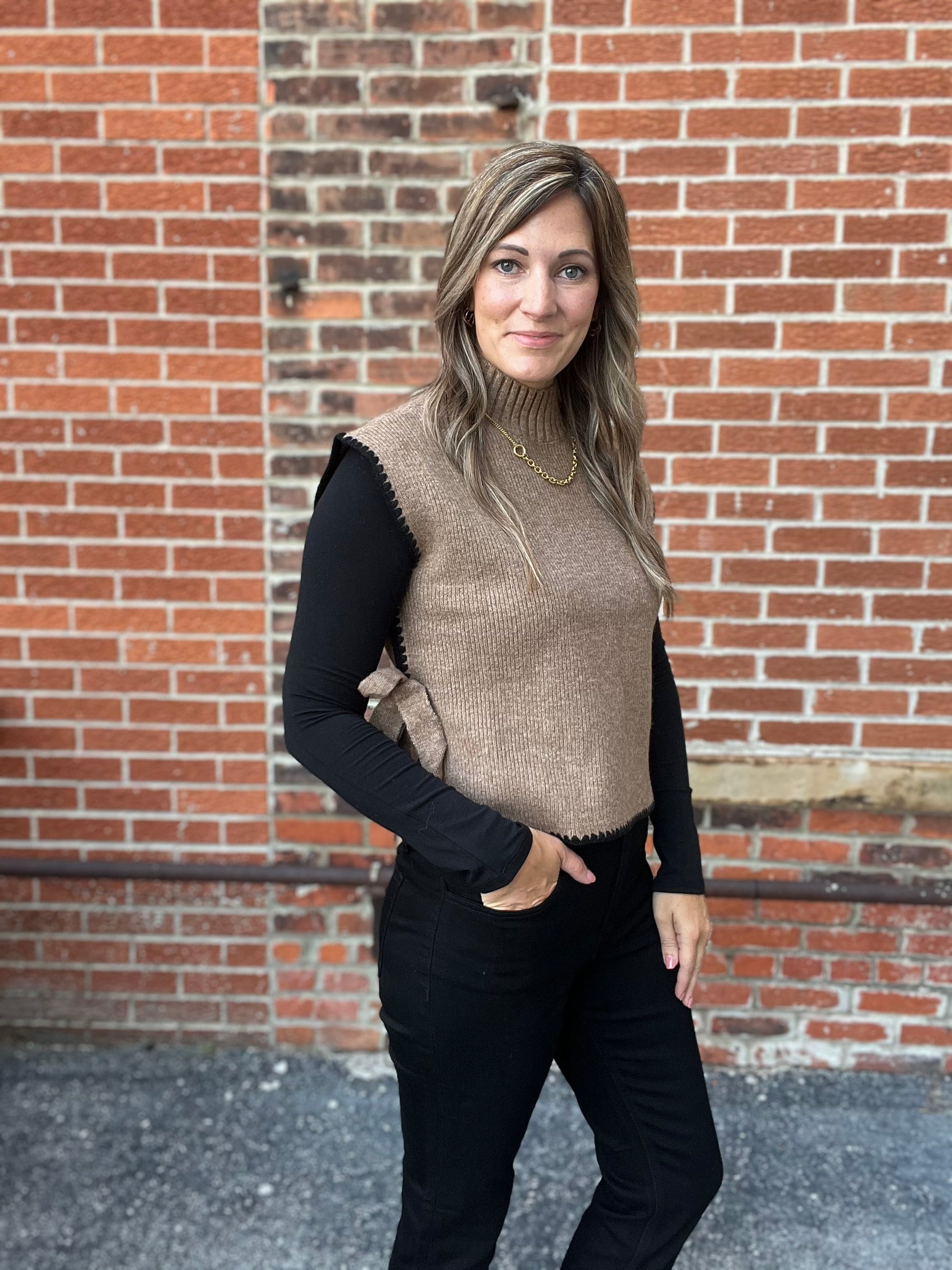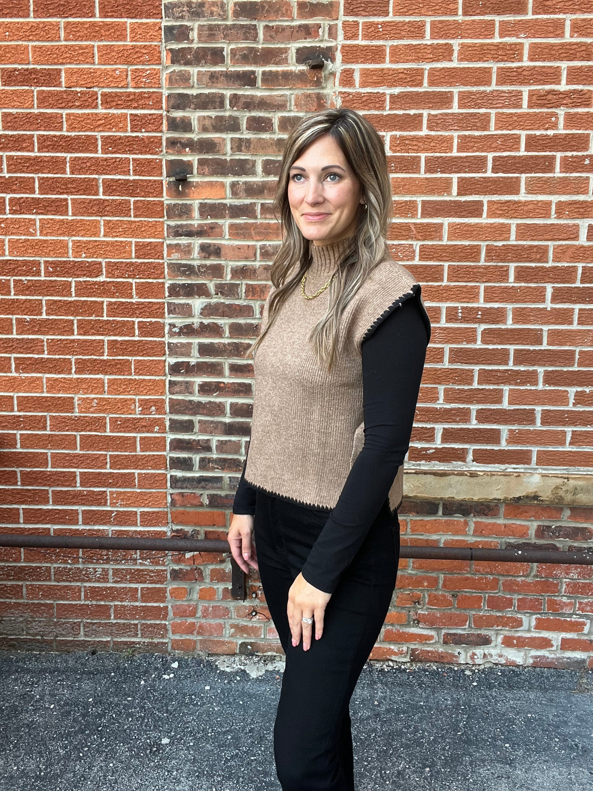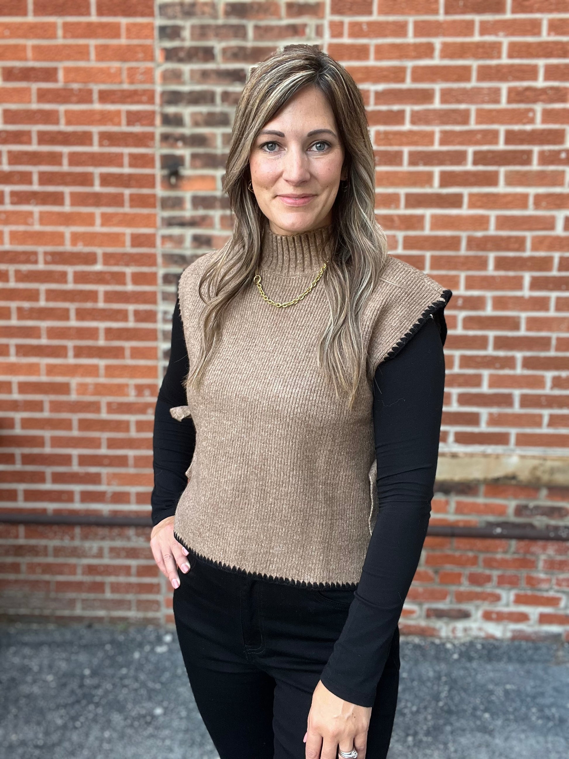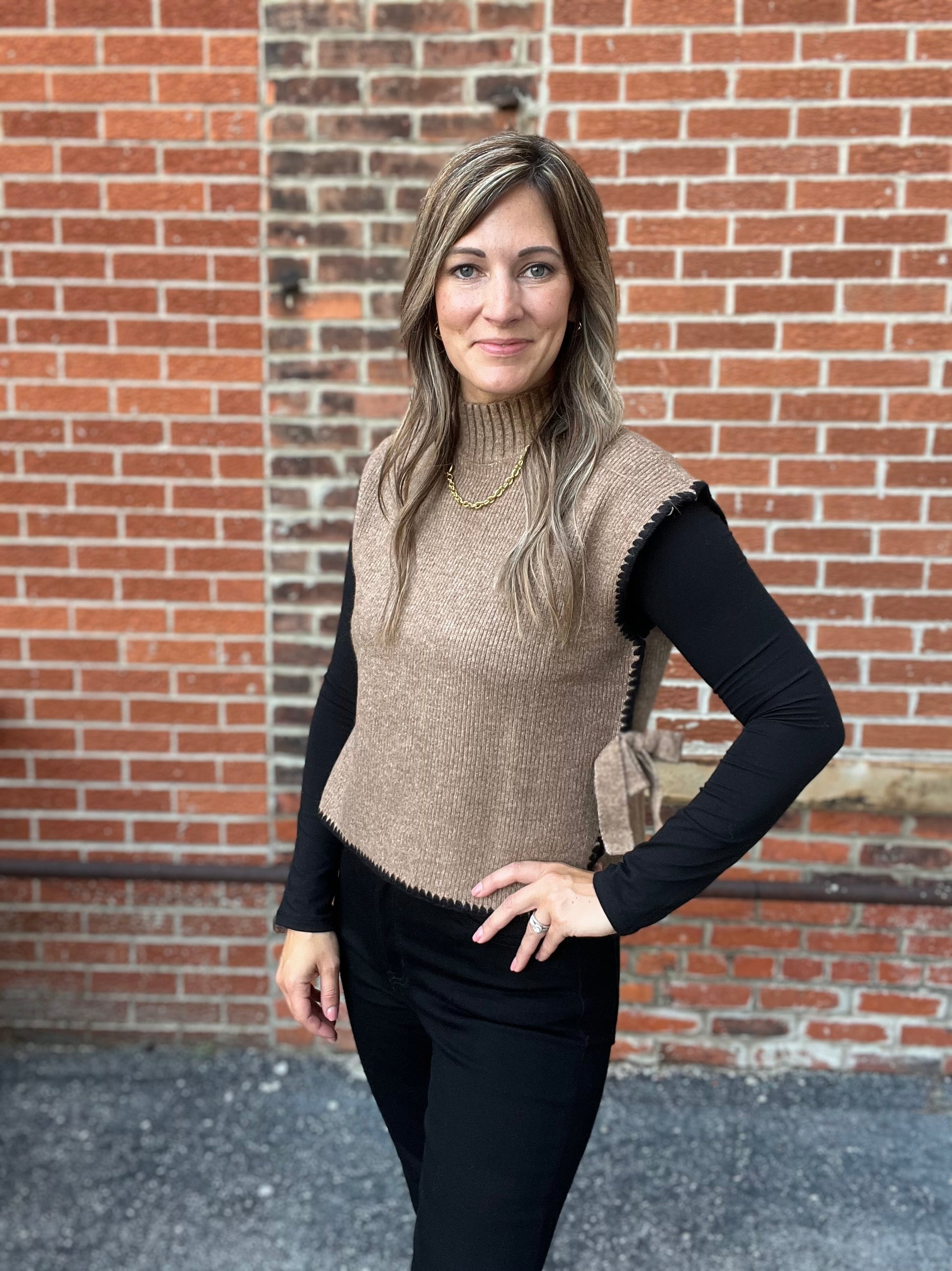 This mock neck sweater features a playful contrast stitch design and side tie detail for a flattering, adjustable fit. The soft knit fabric offers all day comfort, while the unique stitching adds a modern, eye catching touch. Perfect for pairing with your favorite jeans or layered skirts for effortless style.