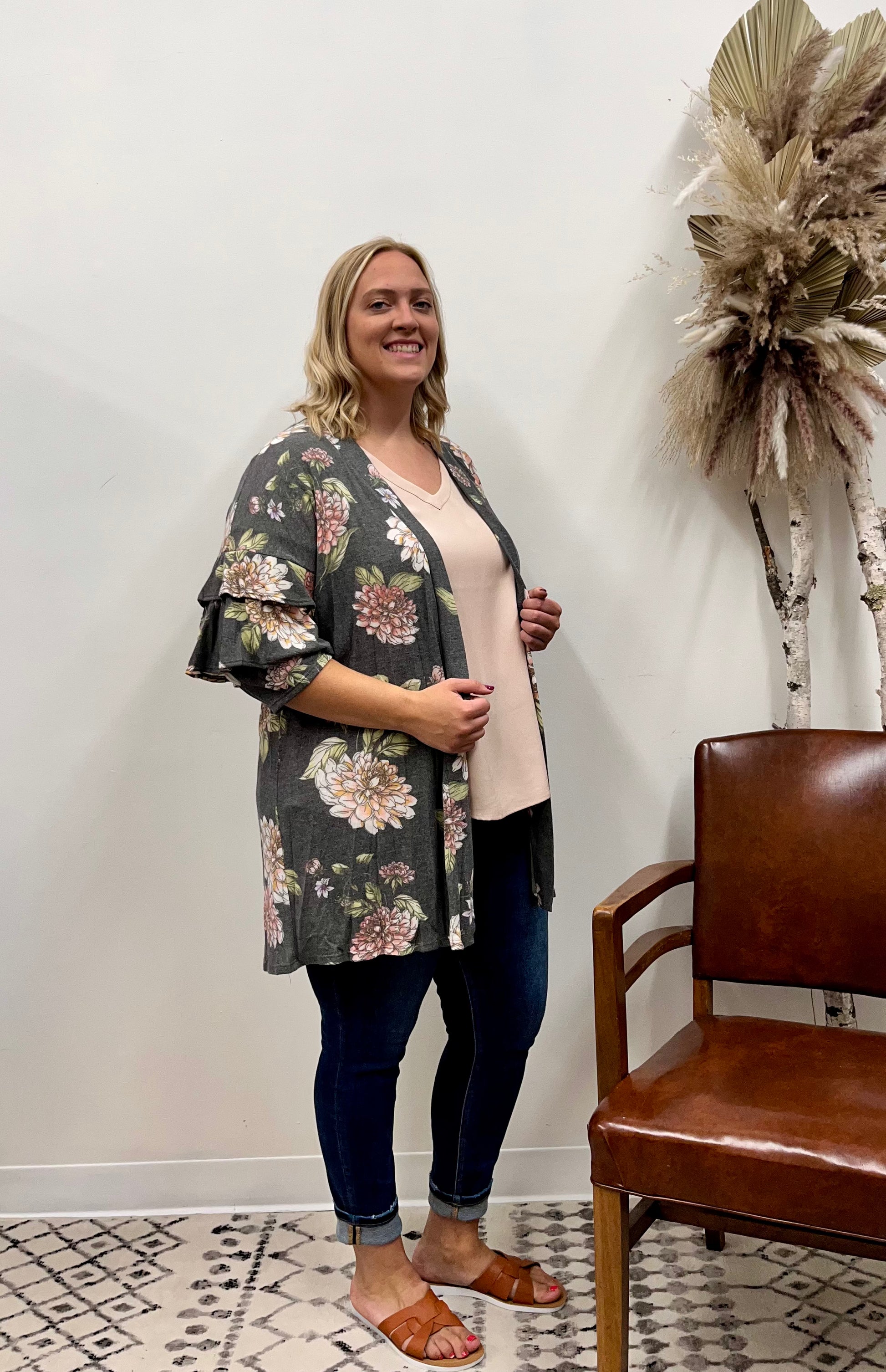 Curvy Lightweight Knit Cardigan with 3/4 Length Tiered Ruffle Sleeve