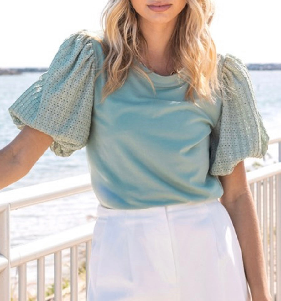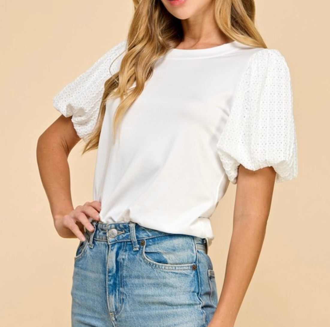 A stylish twist on a classic, this solid top features contrast textured puff sleeves for added flair and dimension. Runs true to size for a comfortable, flattering fit.