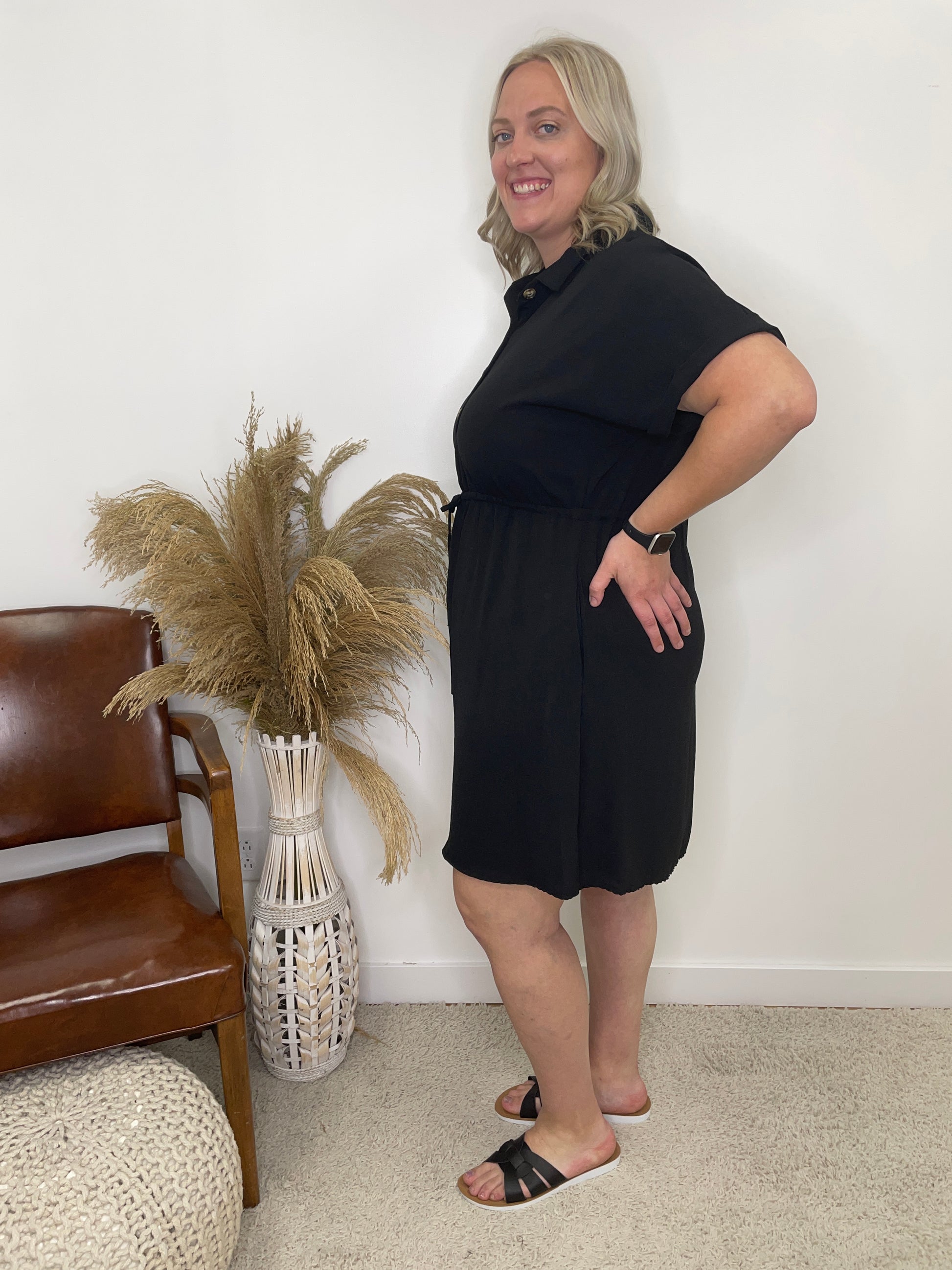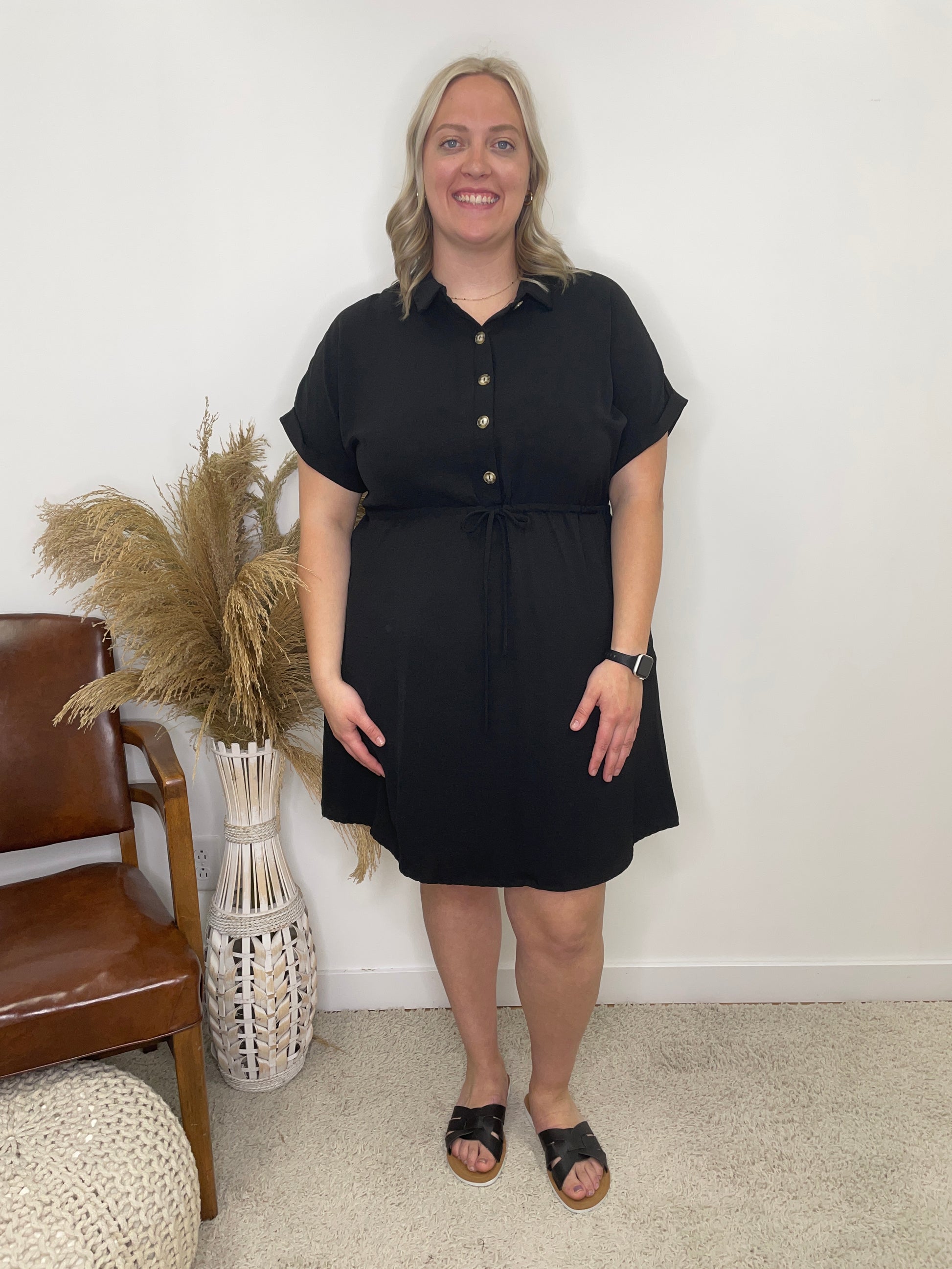 This Curvy Beautiful Black Lightweight Mid Length Dress Features A Functional Button Up Detail and a Draw String Cinch Waist Option. This Dress is Comfortable and Easy to Move In