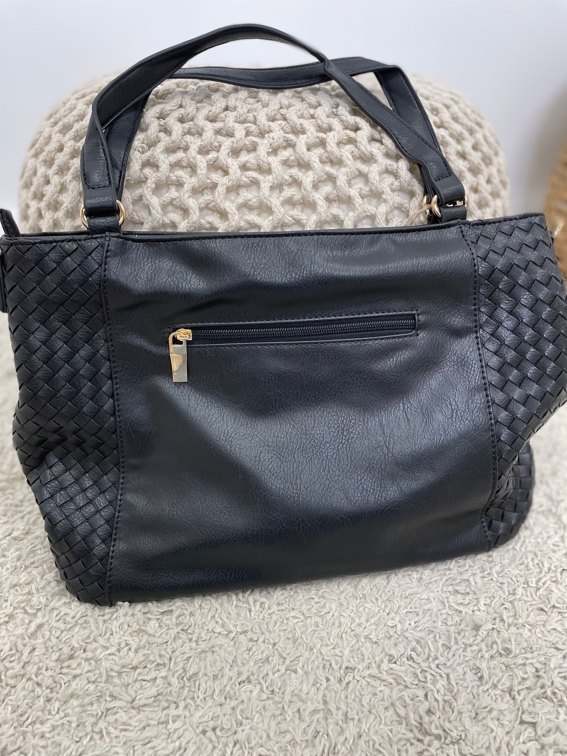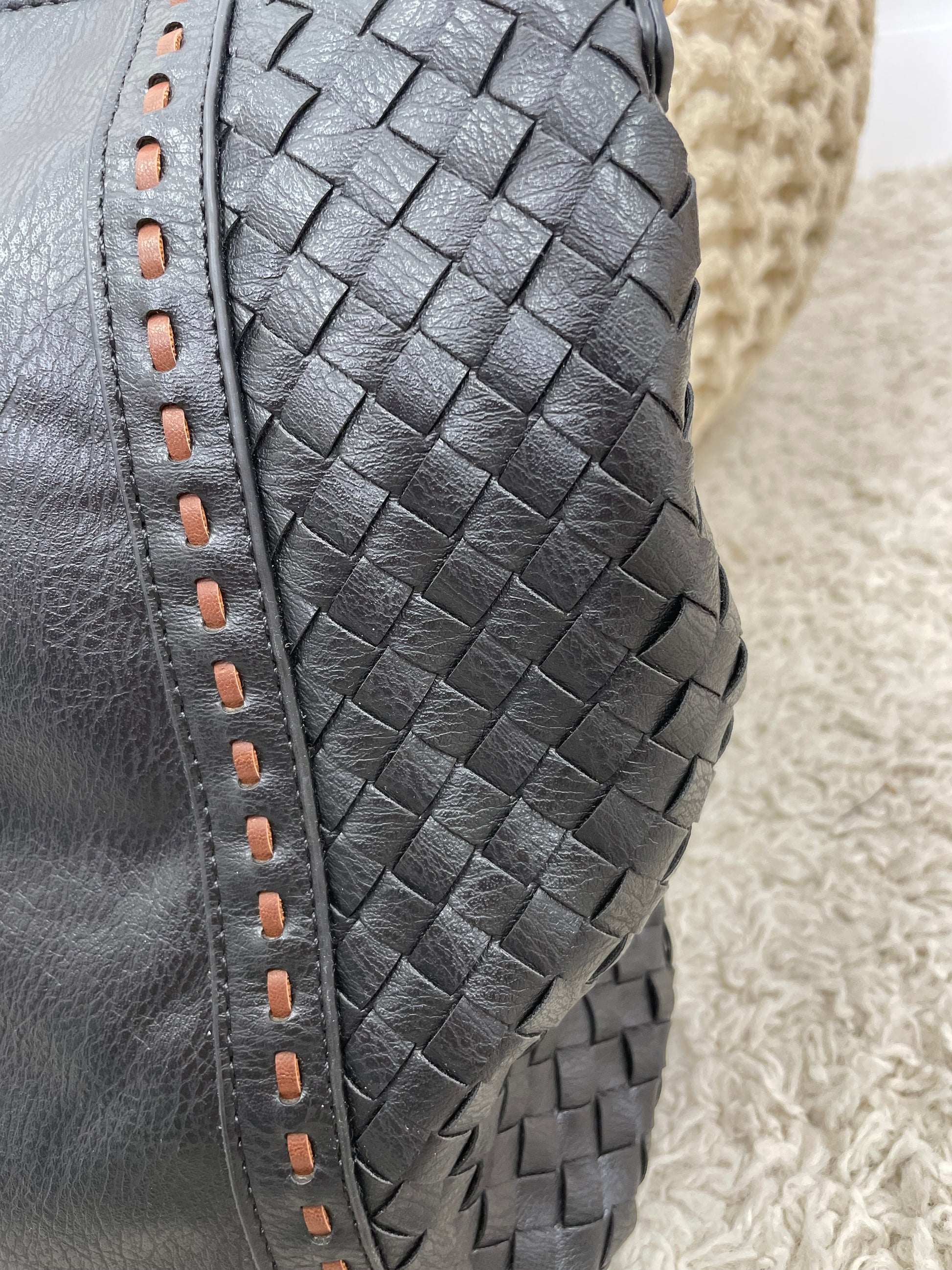 Soft Vegan Leather Hobo Tote Bag With Big Pouch Zipper Closure. This Bag Has Multiple Inside Storage Pockets, One Small Outside Easily Accessible Pocket And Woven Outside Detail. This Bag Can Be Used As A Hand Bag Or Over The ShoulderÂ