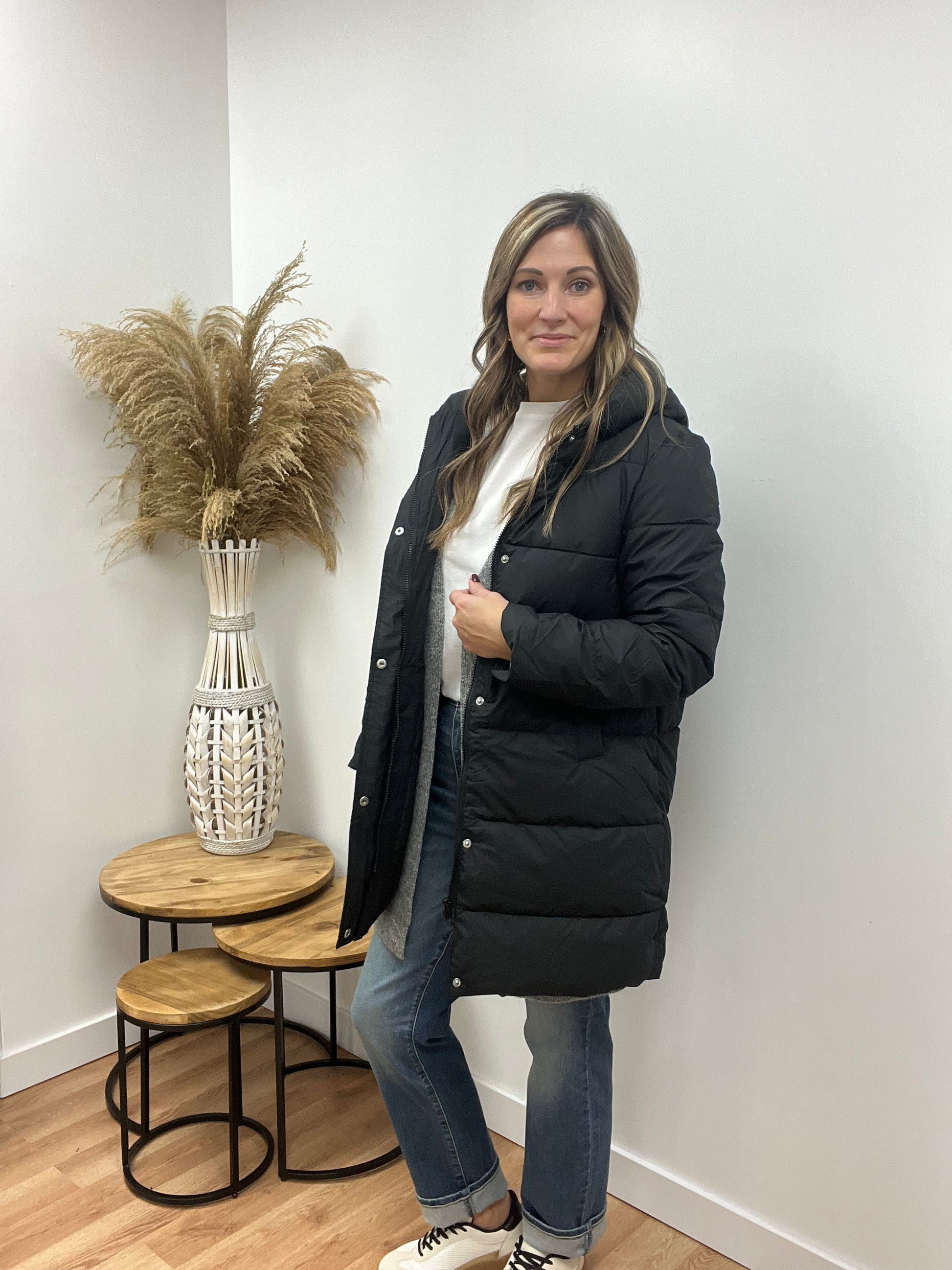 Olive and black hooded puffer coat designed for warmth and style. Features a front zipper with button closure and two convenient pockets, making it perfect for chilly days while keeping a sleek, modern look.