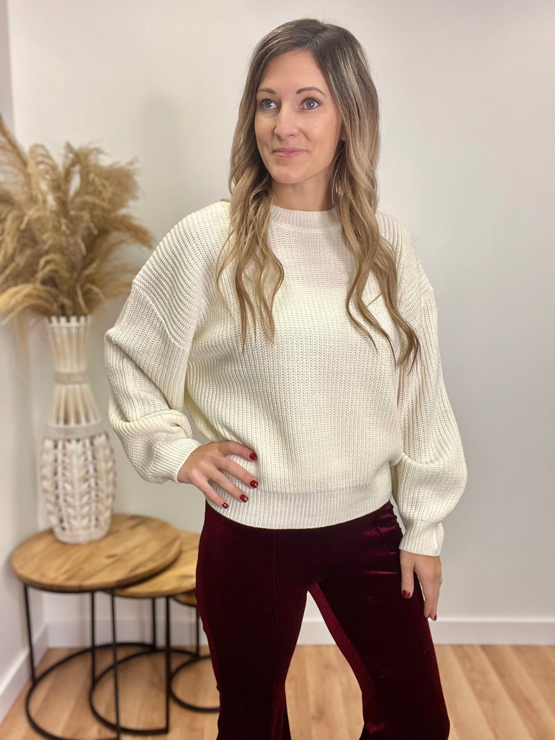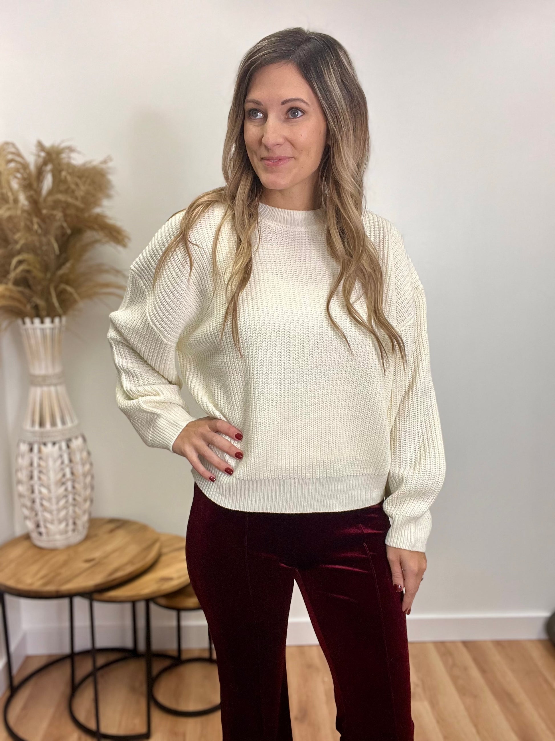 This cozy cream knit sweater is a perfect blend of comfort and style. It features a ribbed neck for added texture, while the ribbed cuffs on the sleeves provide structure and warmth. The ribbed, fitted bottom creates a flattering silhouette that sits comfortably at the waist, making it ideal for pairing with your favorite jeans or skirts. Soft and versatile, this sweater is a timeless staple for cooler weather, bringing effortless elegance to any outfit.