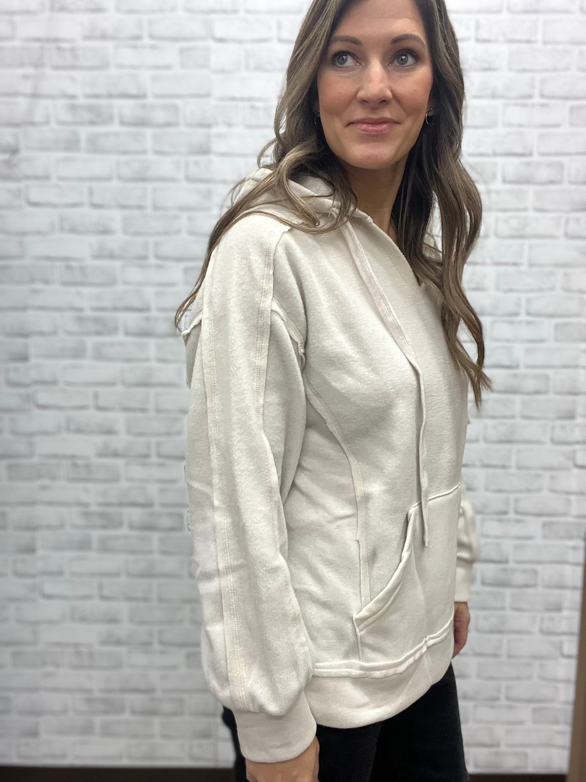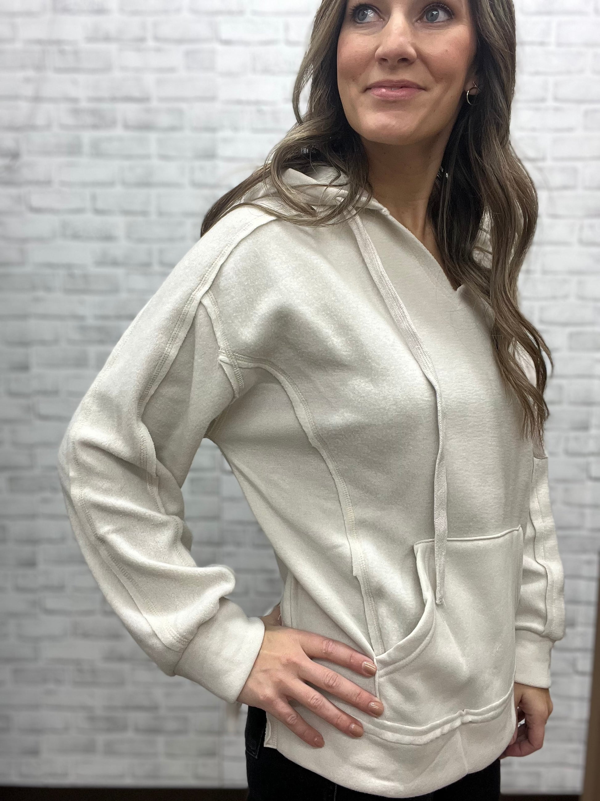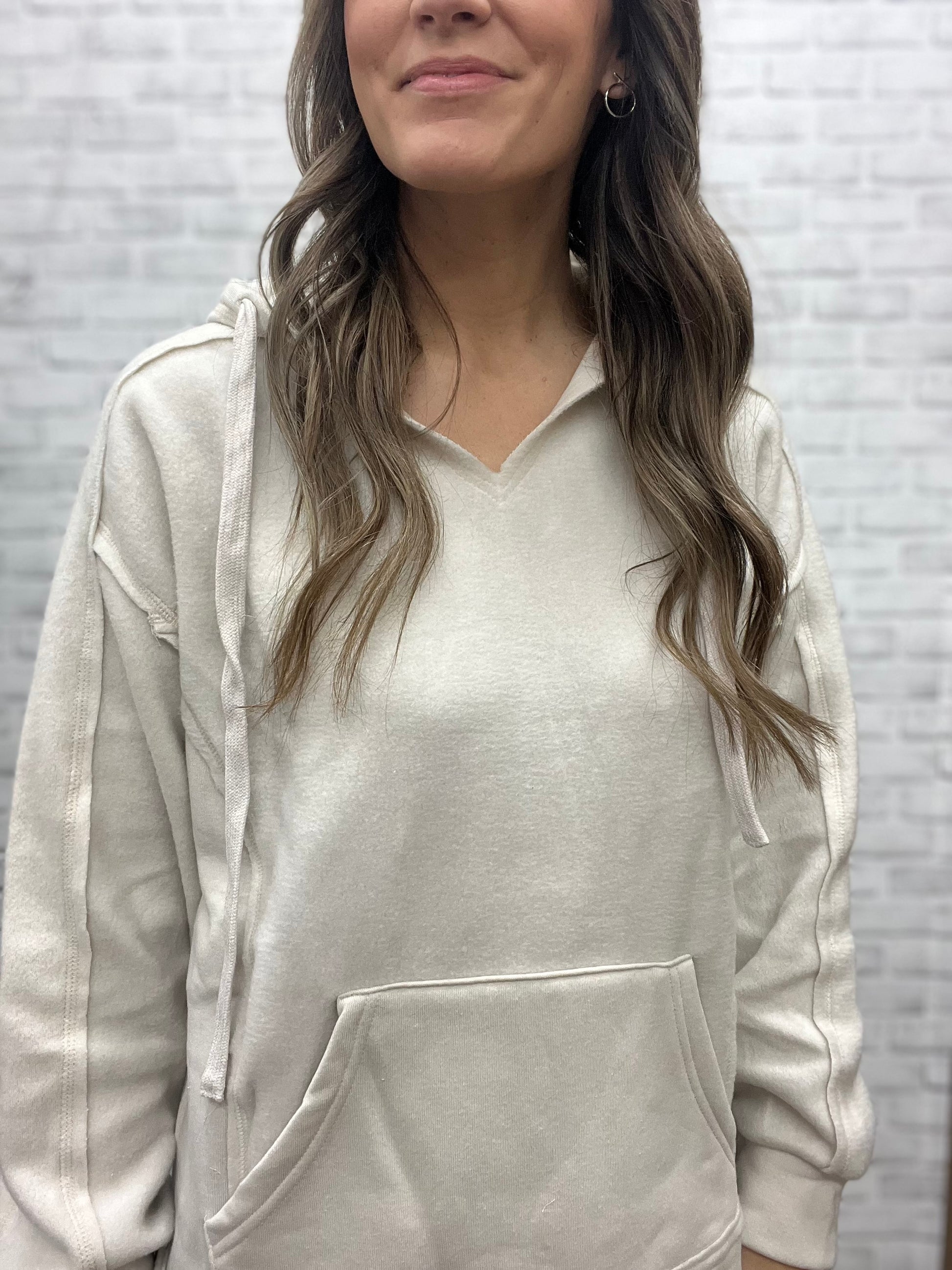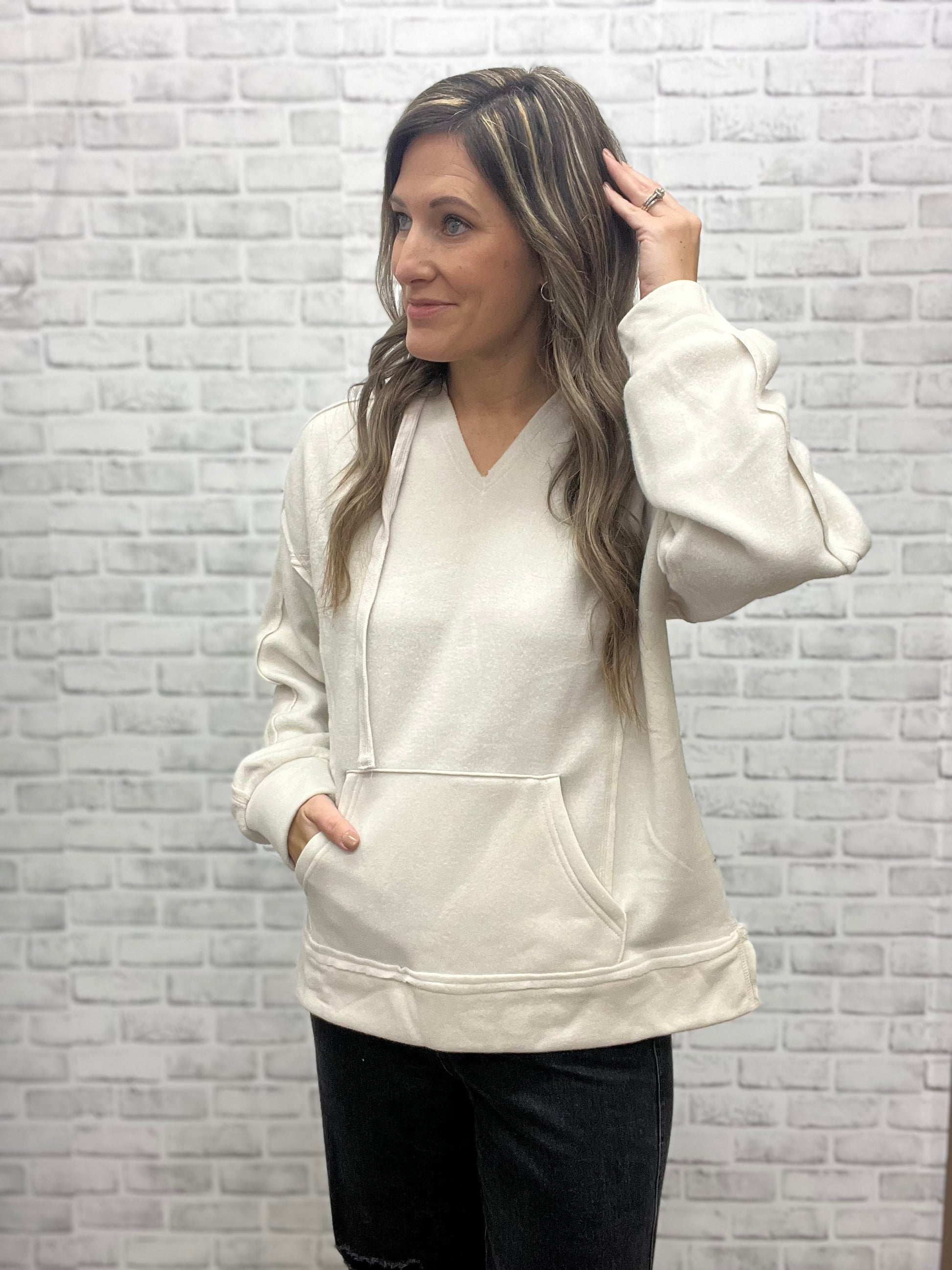 Cozy cream fleece hoodie designed for ultimate comfort and style. Features a unique V-neckline with thick drawstring details, a spacious front pocket for practicality, side slits for added movement, and a raw hem for a casual, lived-in look. Perfect for layering or lounging in effortless chic.