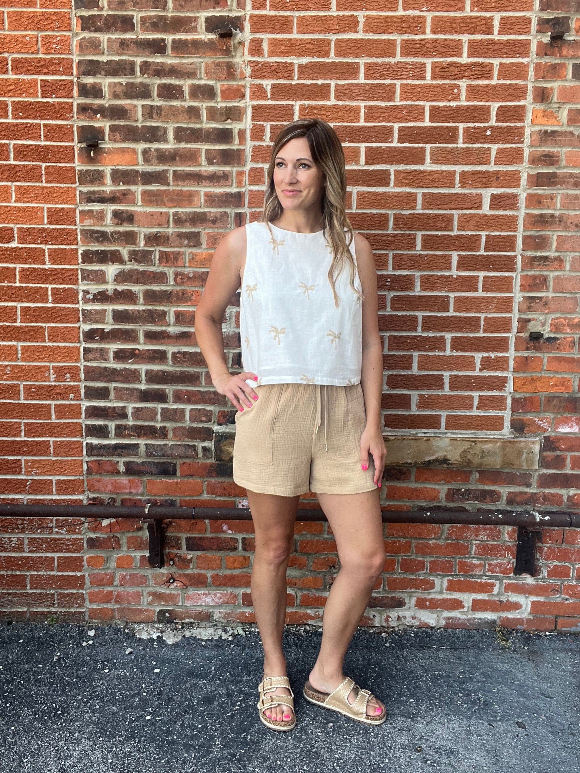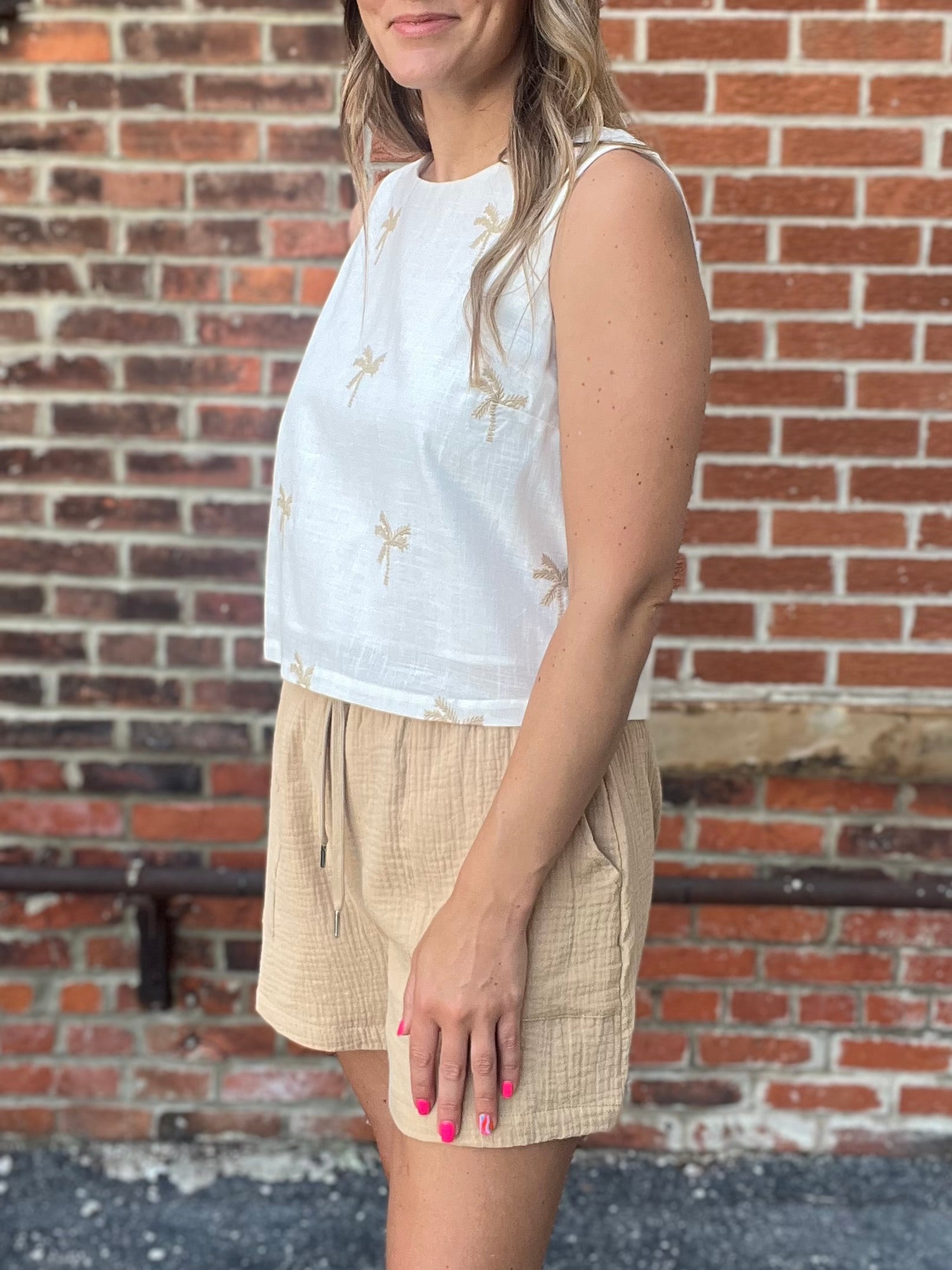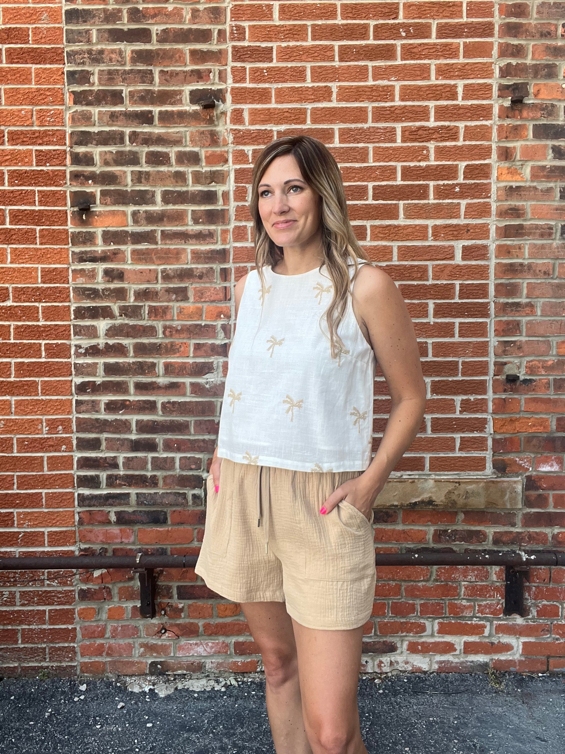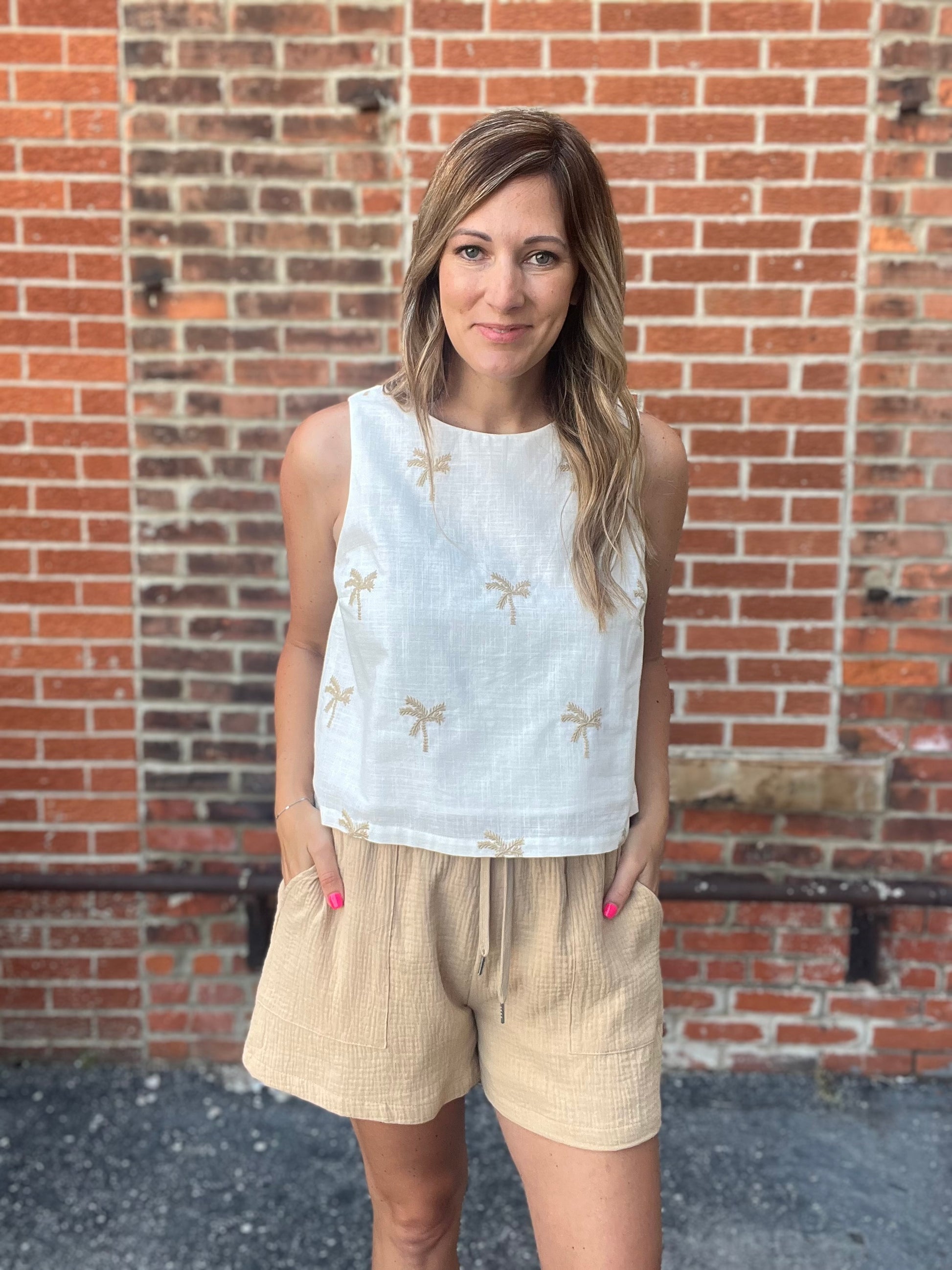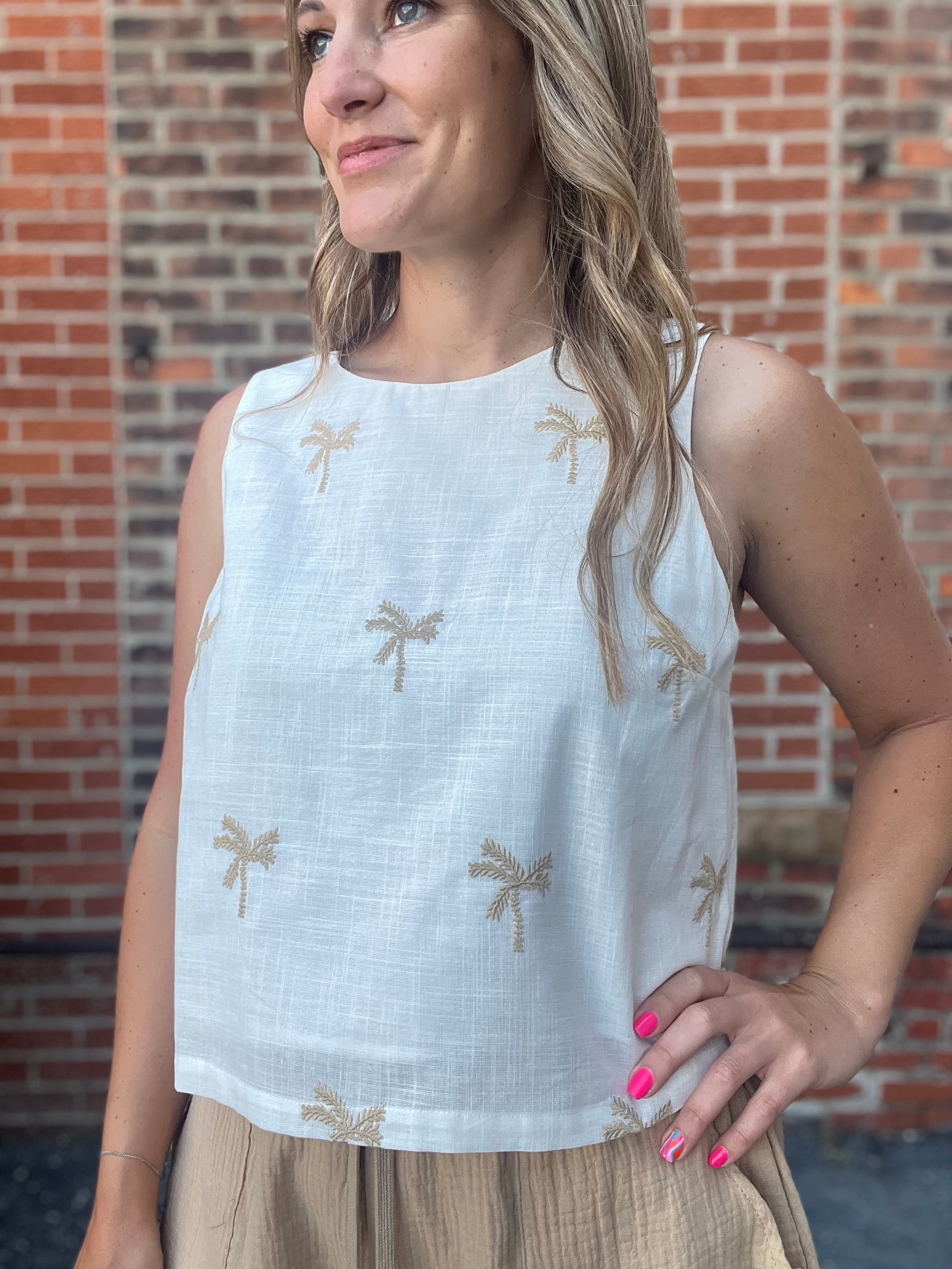 Embrace effortless summer vibes with this white linen tank top, featuring a delicate embroidered palm tree detail. Made from 100% cotton, this lightweight and lined top offers a breezy, comfortable fit, perfect for warm, sunny days!