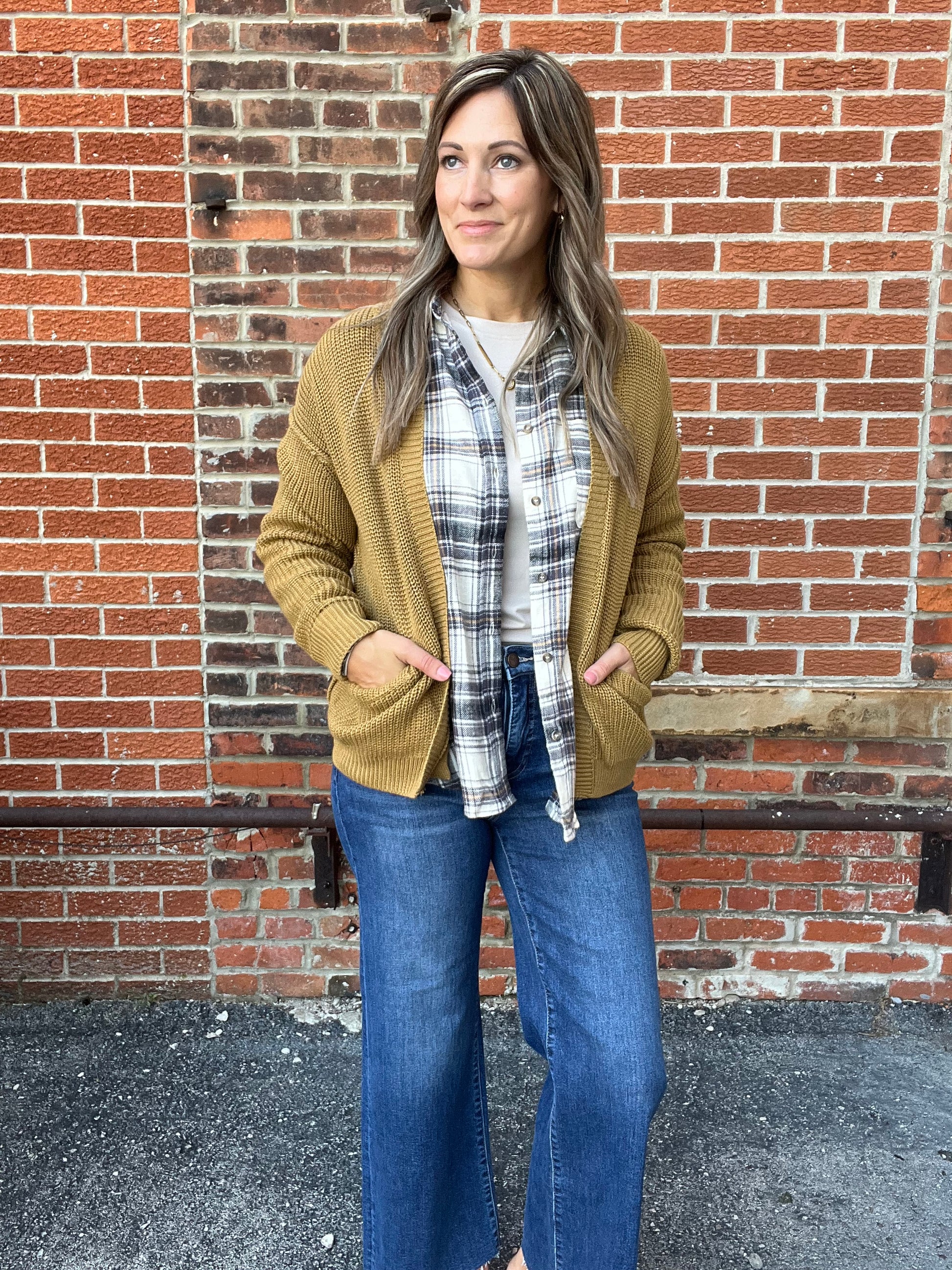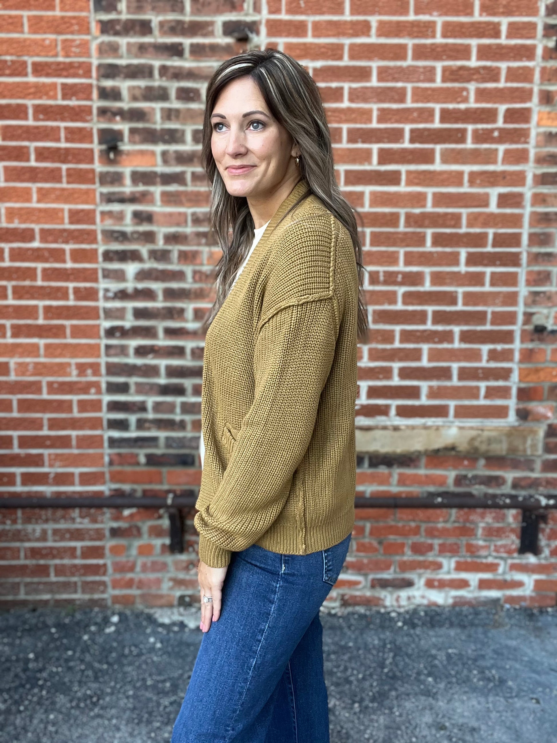 A cozy chunky knit cardigan with roomy front pockets and raw seam detailing at the drop shoulders for a laid-back, lived-in look. Perfect for layering, this relaxed style adds texture and comfort to any outfit.