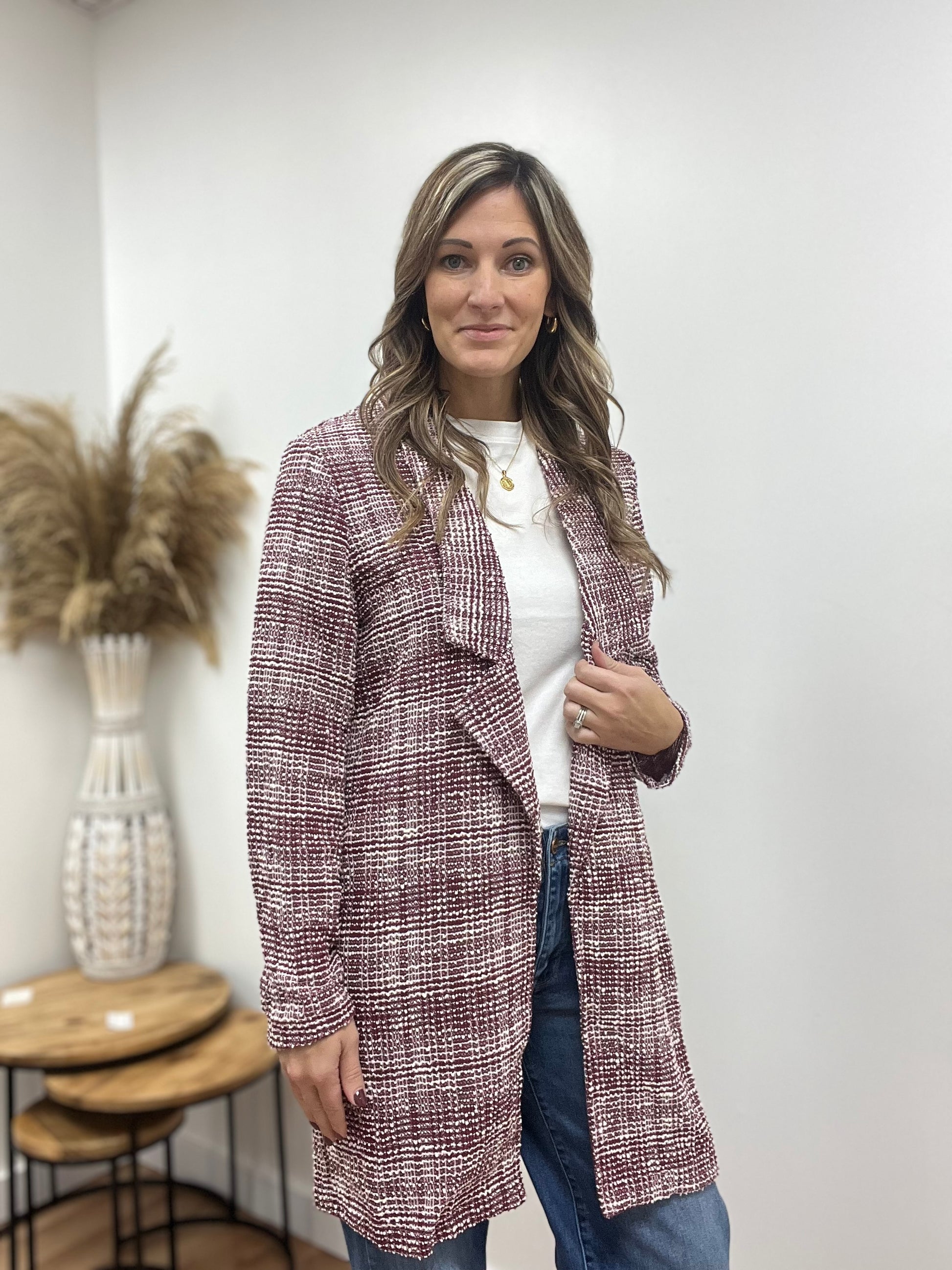 This lightweight, classic-fit midi blazer in a black and white textured tweed. Designed with an open front and mild stretch for effortless comfort and movement, this polished piece blends timeless style with modern versatility—perfect for both casual and professional looks.