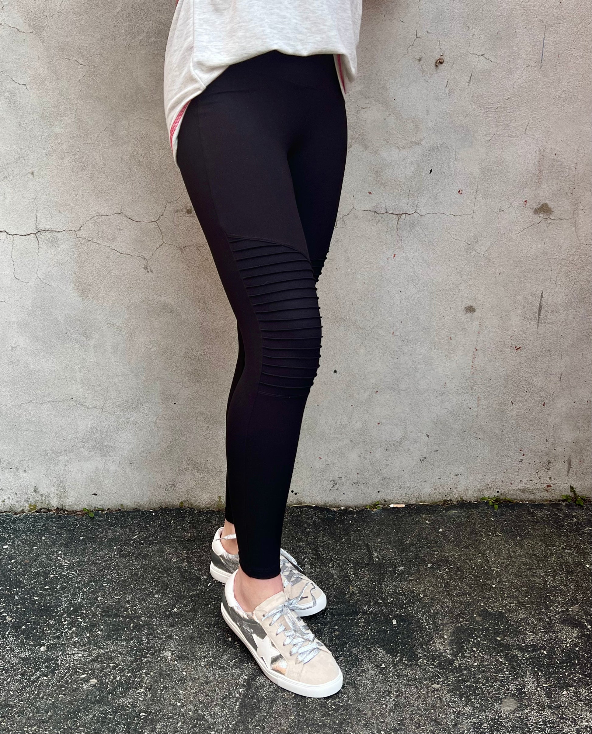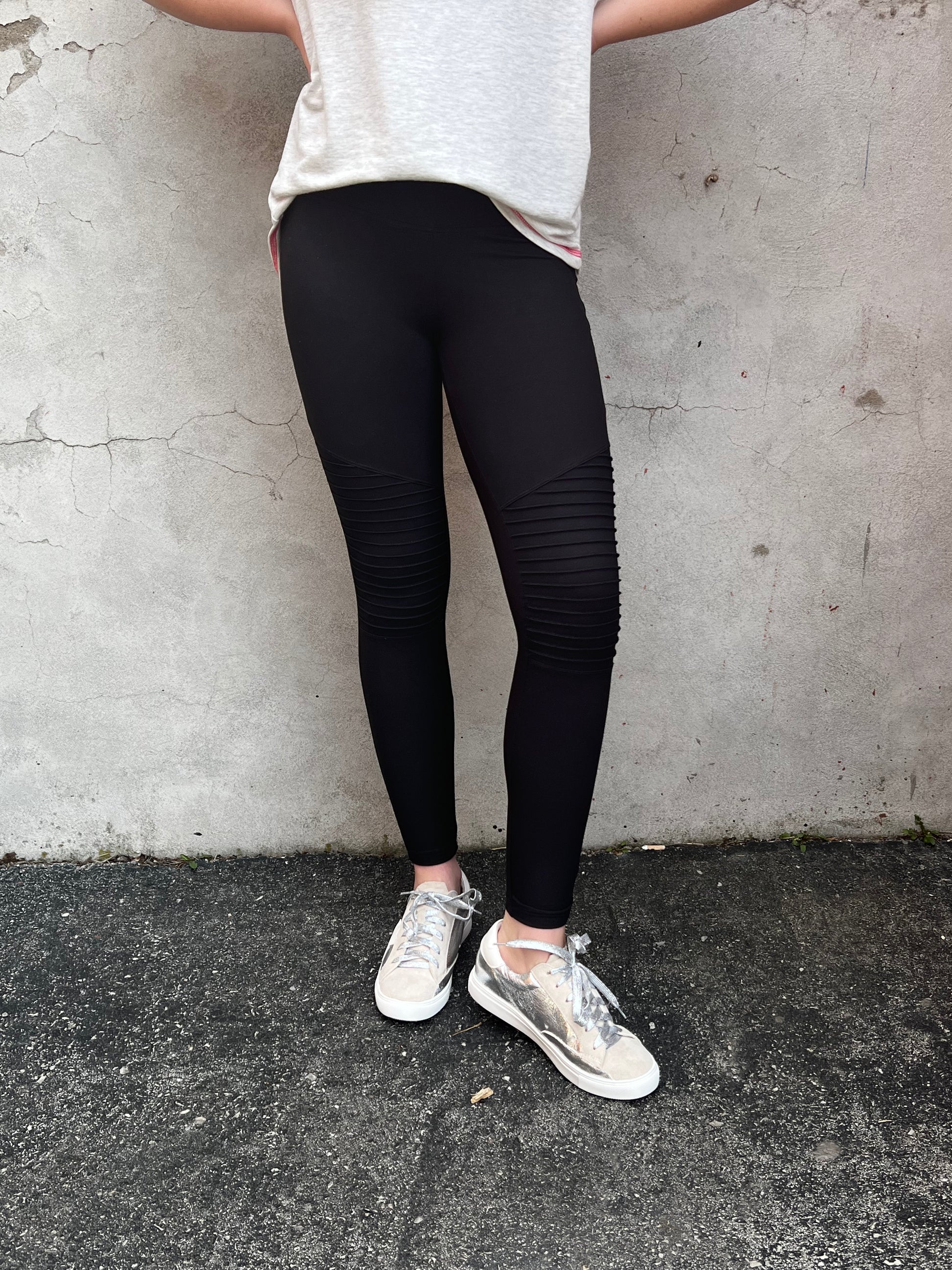 Solid Black Buttery soft Moto Leggings, With Elastic Wide Waist Band.