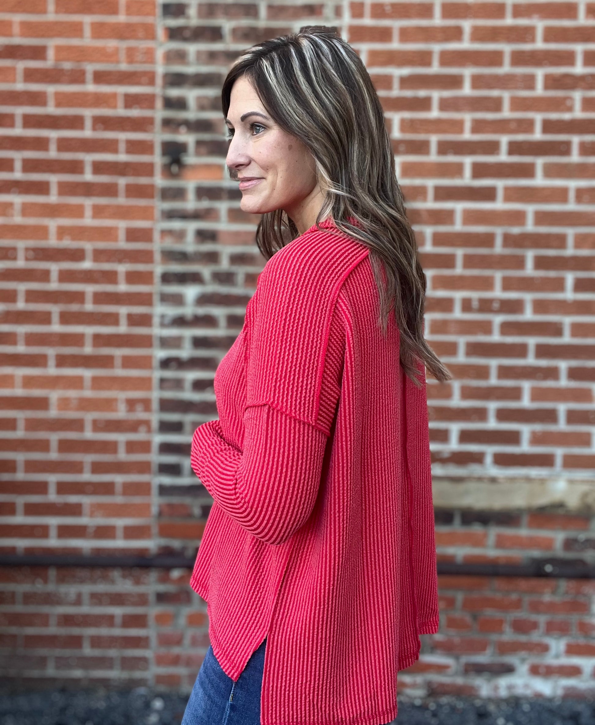 Soft and stylish, this ribbed long sleeve top features exposed seam details that add a touch of edge to a classic look. Designed with a relaxed fit and subtle side slits for easy movement and everyday comfort perfect for pairing with jeans or leggings.
