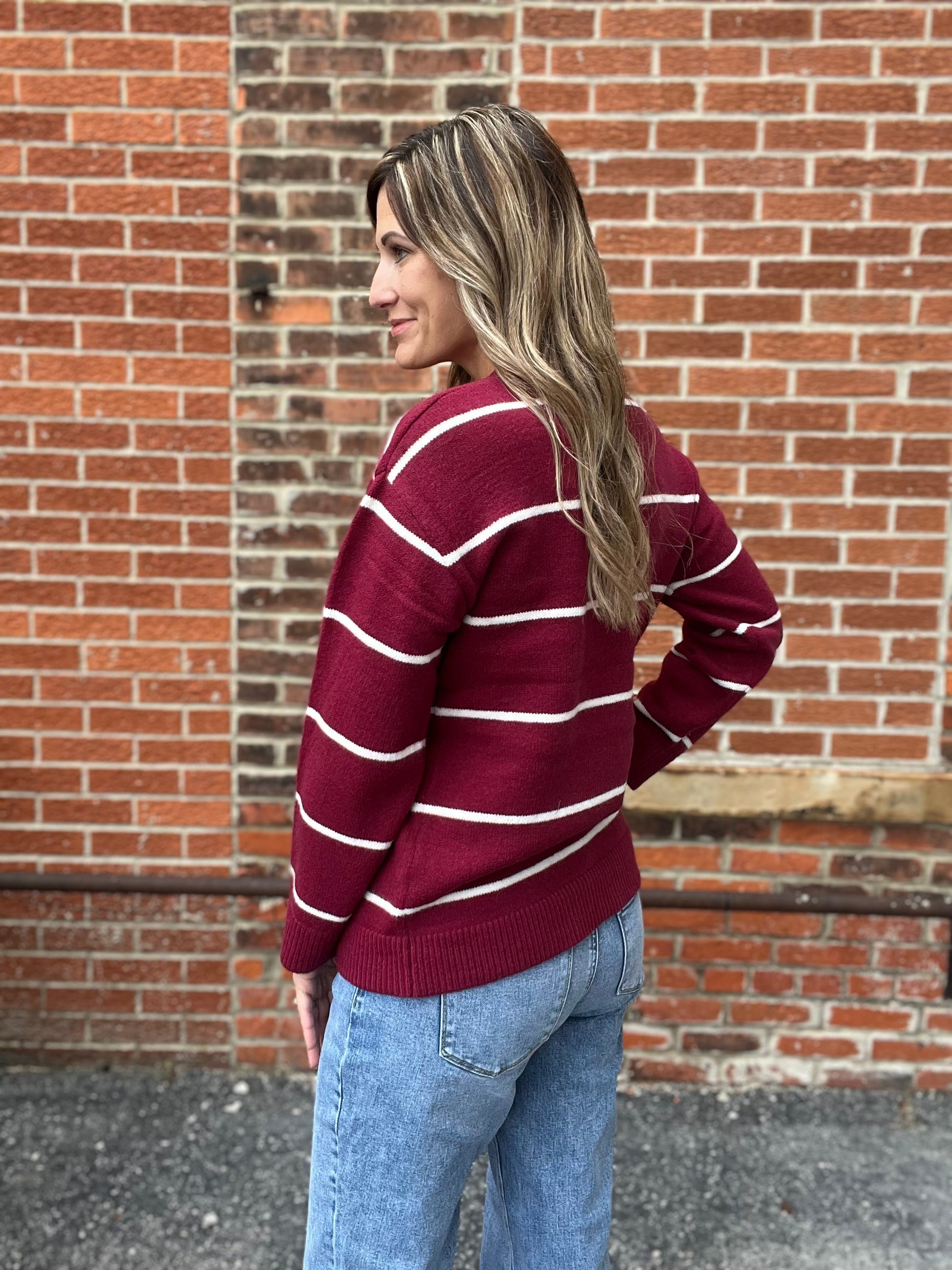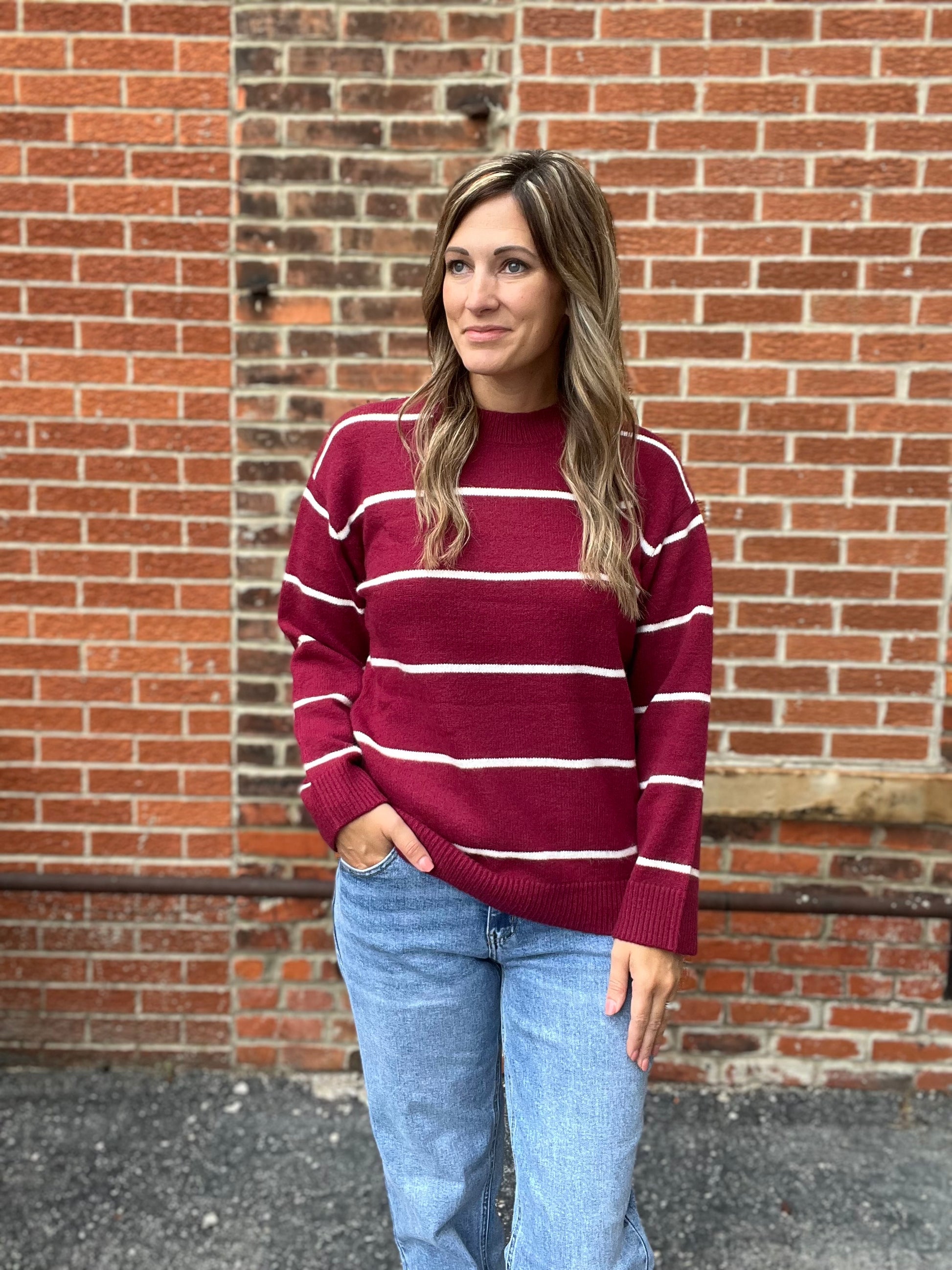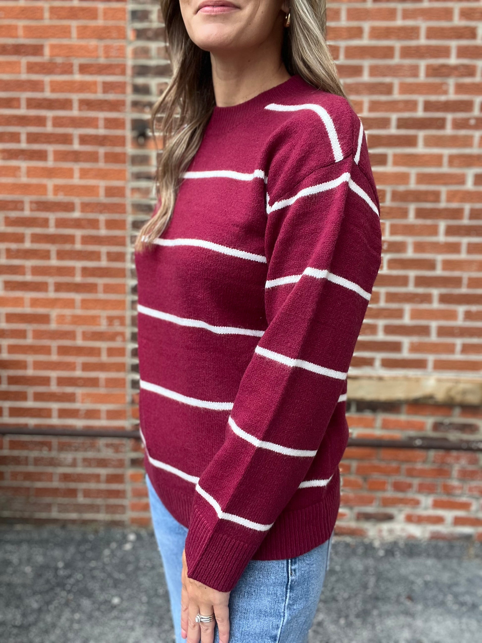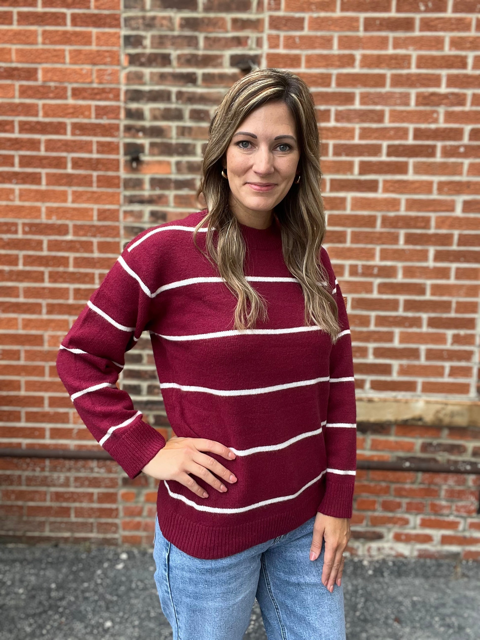 This wine colored sweater features crisp white stripes for a classic, timeless look. Designed with long sleeves and a relaxed fit, it offers cozy comfort while maintaining a polished style. Perfect for layering or wearing on its own, it brings a touch of warmth and sophistication to any outfit.