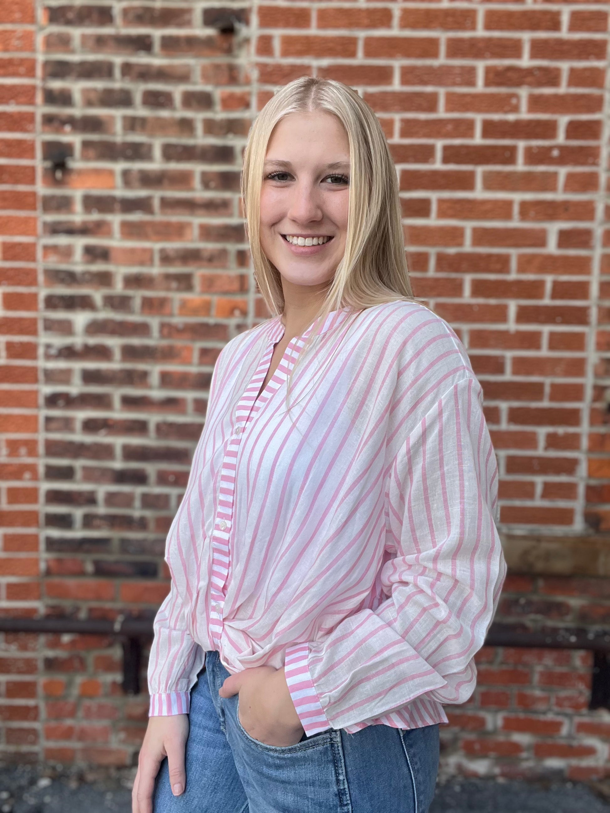 Stay effortlessly chic in this white and pink striped mix top. Made from lightweight, flowy fabric, it features a flattering high low silhouette with a shorter front and longer back. A twist detail at the front hem adds a playful, modern touch, while buttoned cuffs provide a polished finish. Perfect for pairing with jeans, shorts, or layering over your favorite tank, this top blends casual comfort with stylish detail.