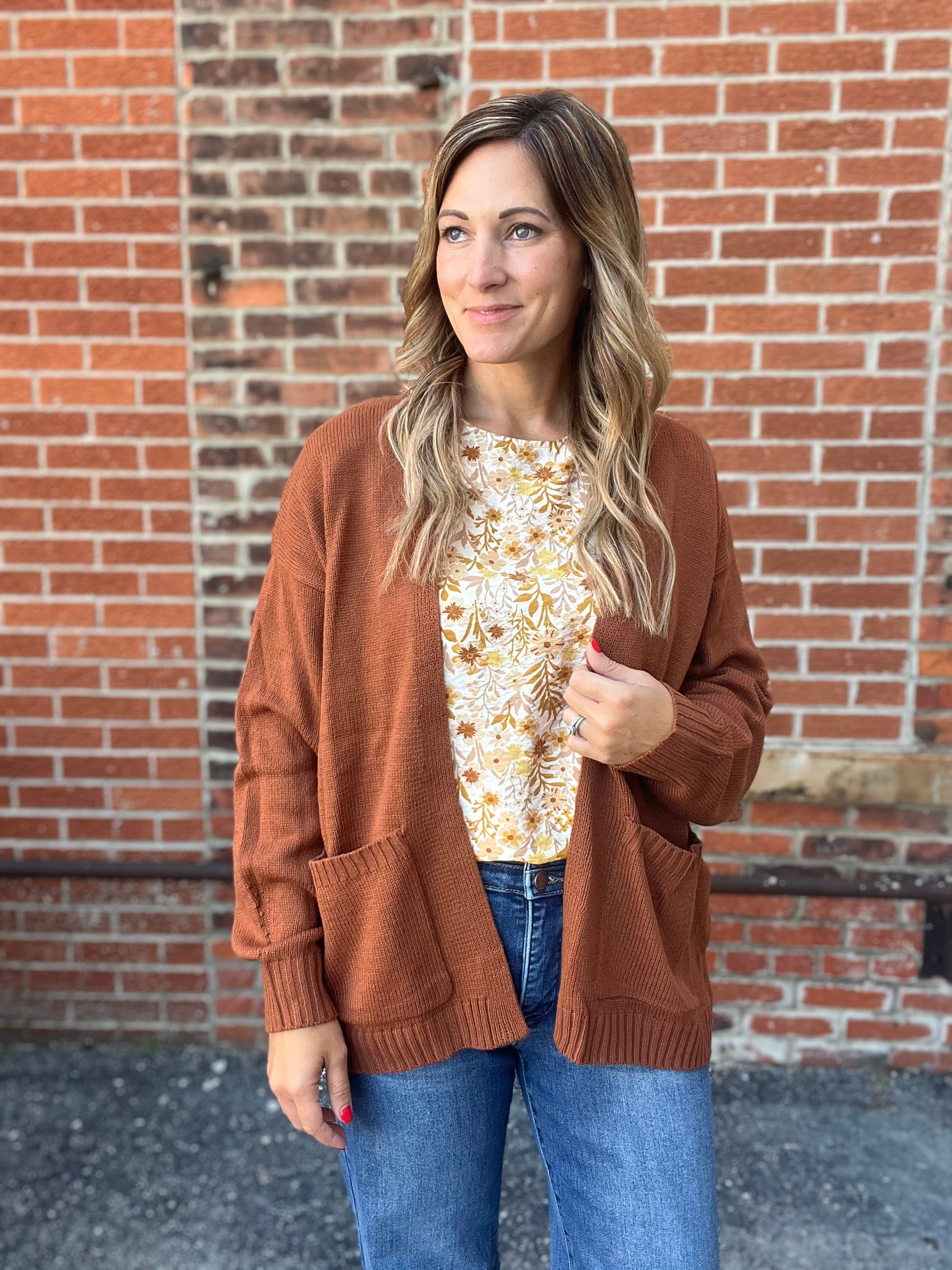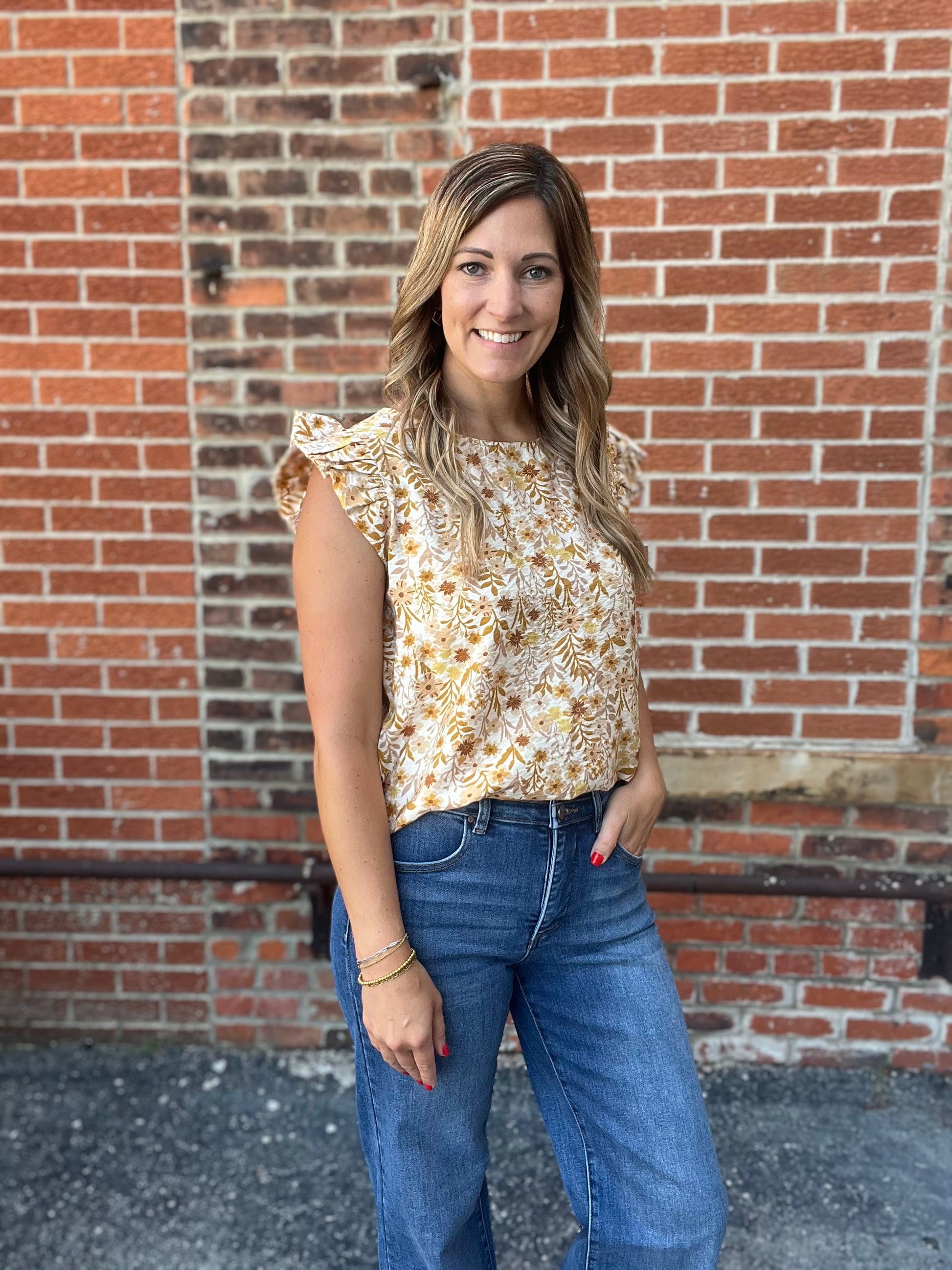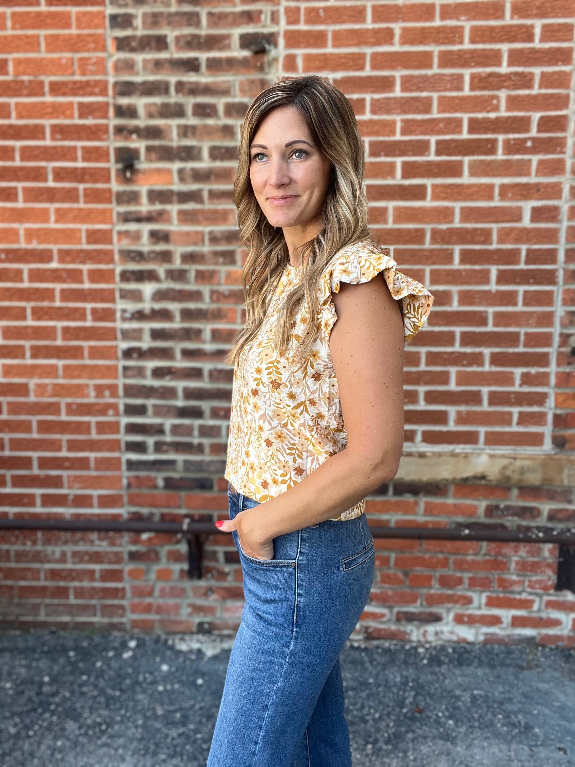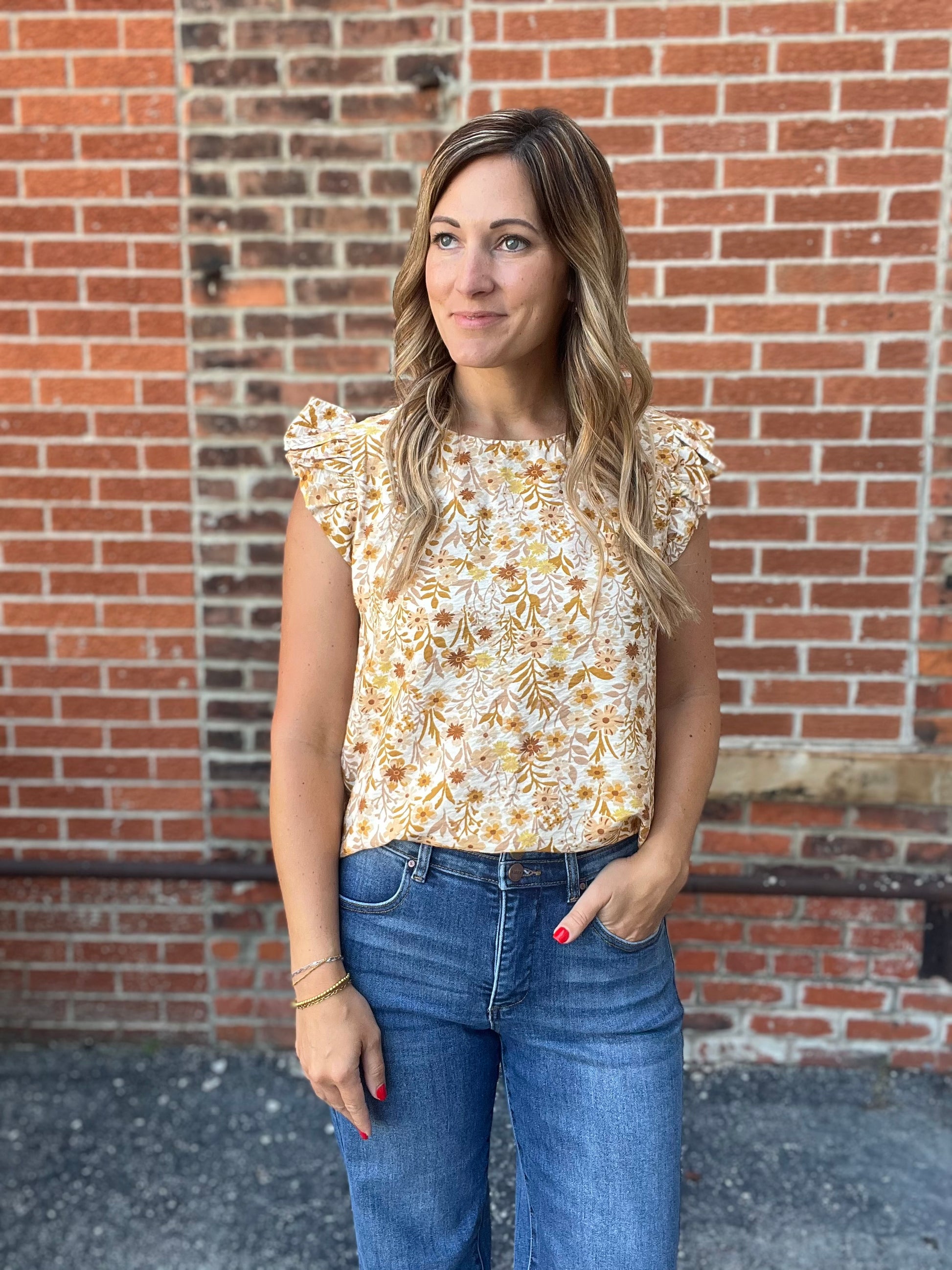 A lightweight floral top with short puff sleeves, a round neckline, and an allover warm toned mustard and rust floral print on a creamy background. Feminine and easy to wear for a casual day out.