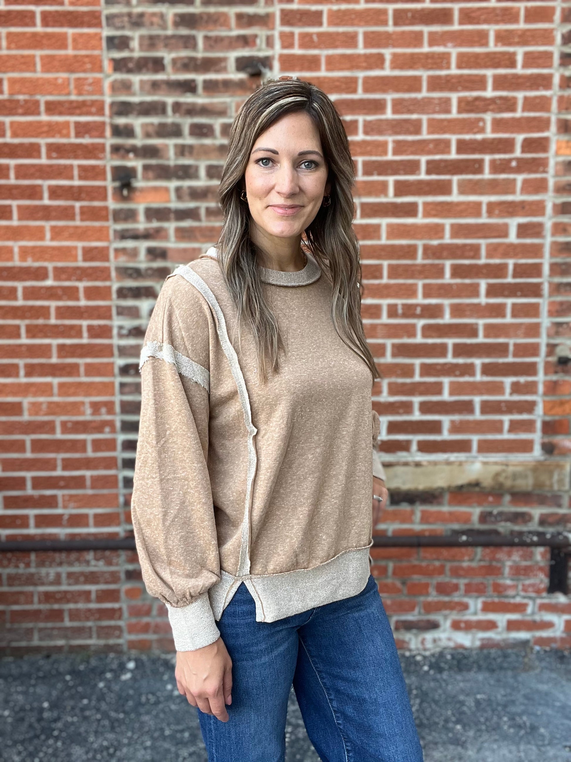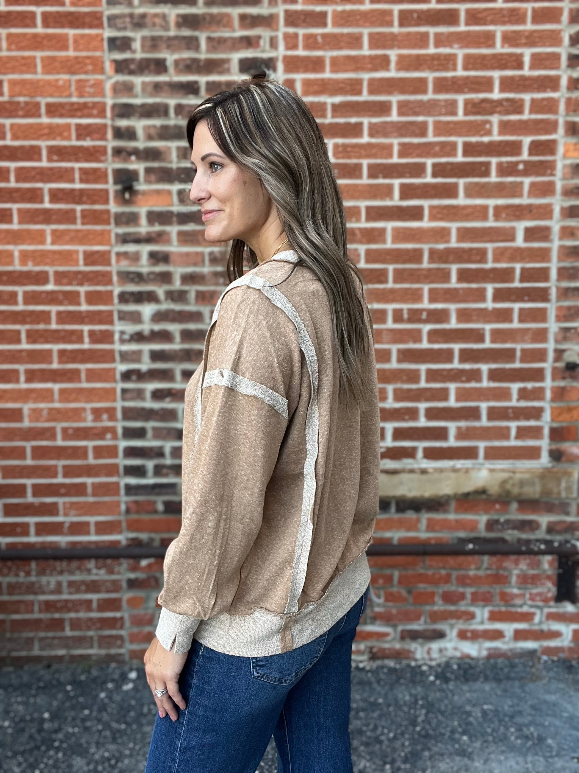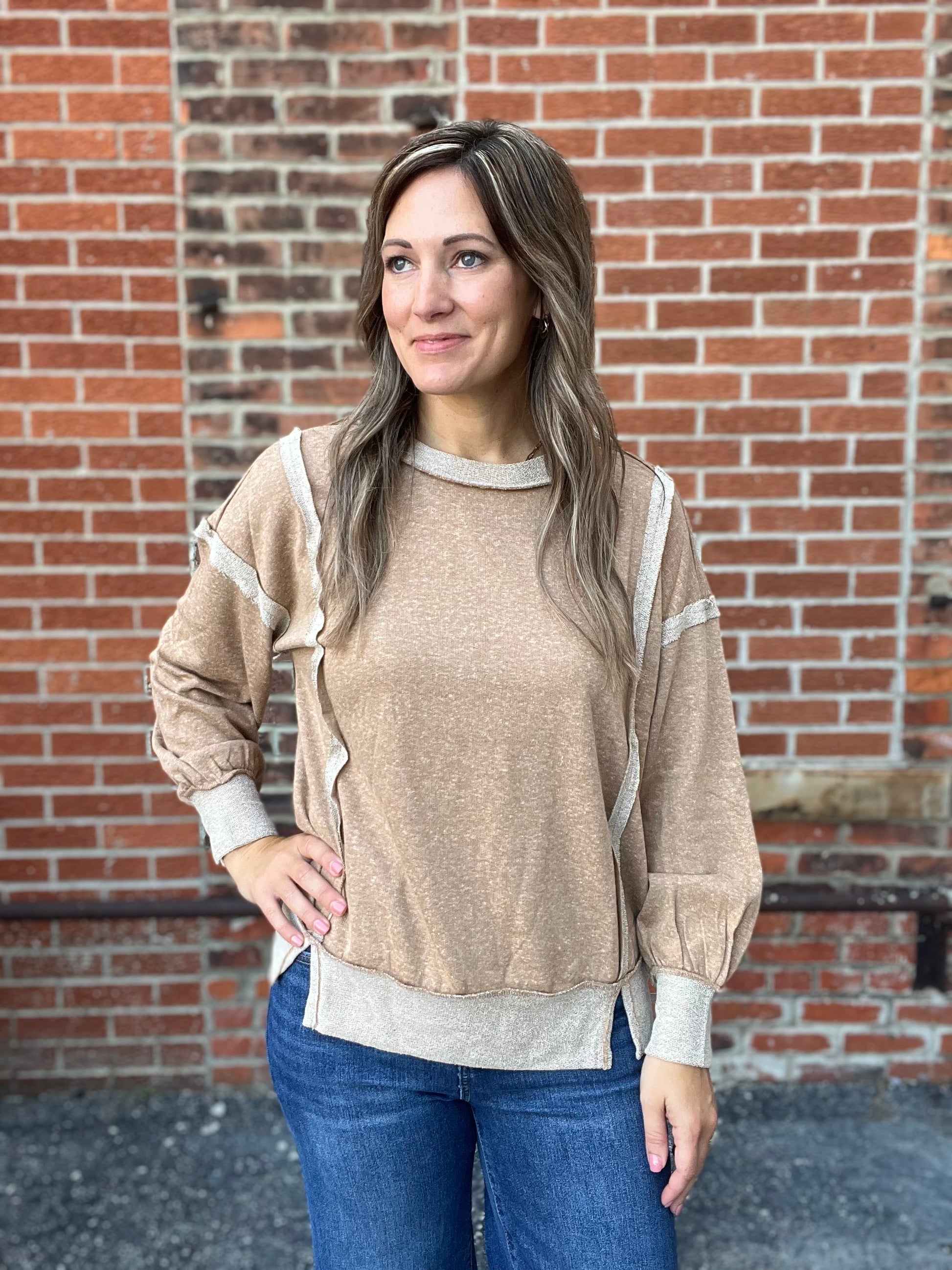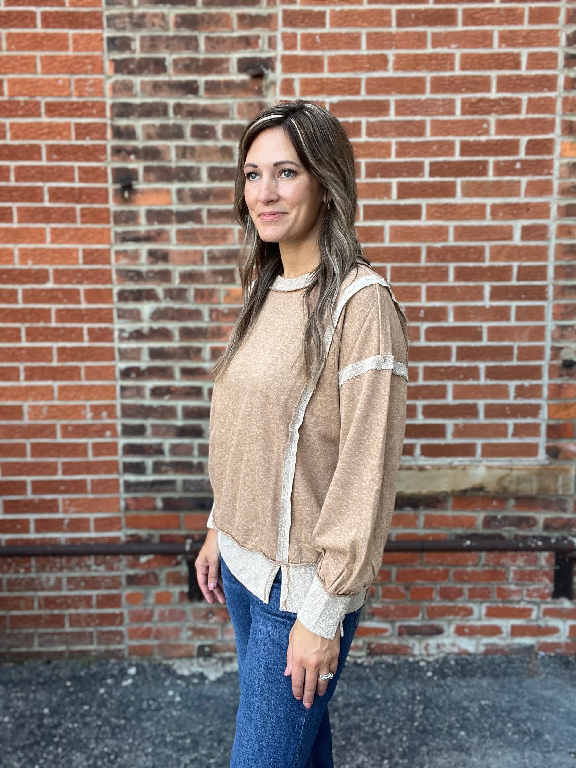 This lightweight pullover features a washed finish for that lived in look. Designed with a relaxed fit, it includes side slits for added movement and comfort. The exposed seam detailing adds just the right touch of edge, while the bottom band gives it a flattering shape. An easy go to for layering or wearing solo during those in between seasons.