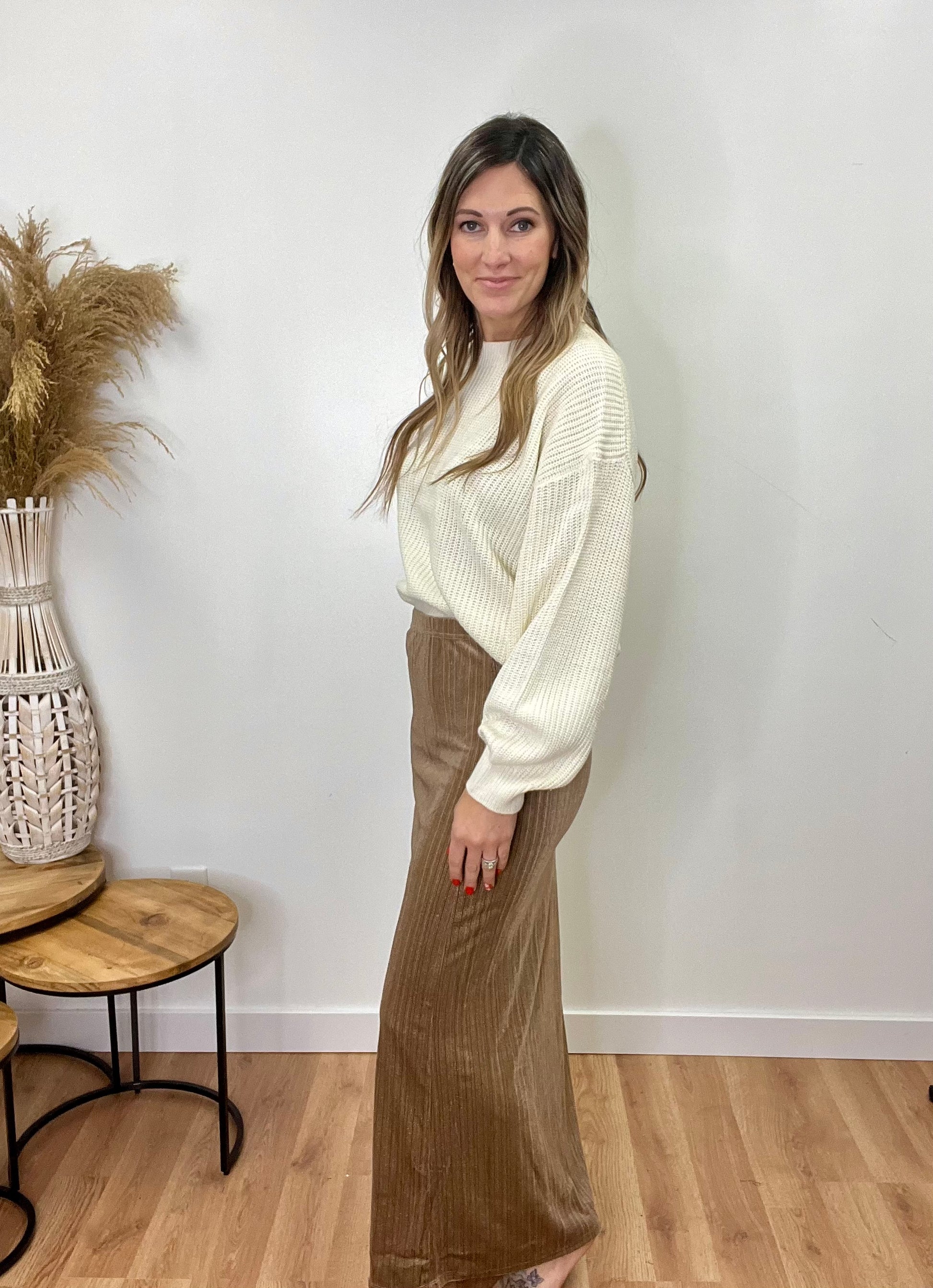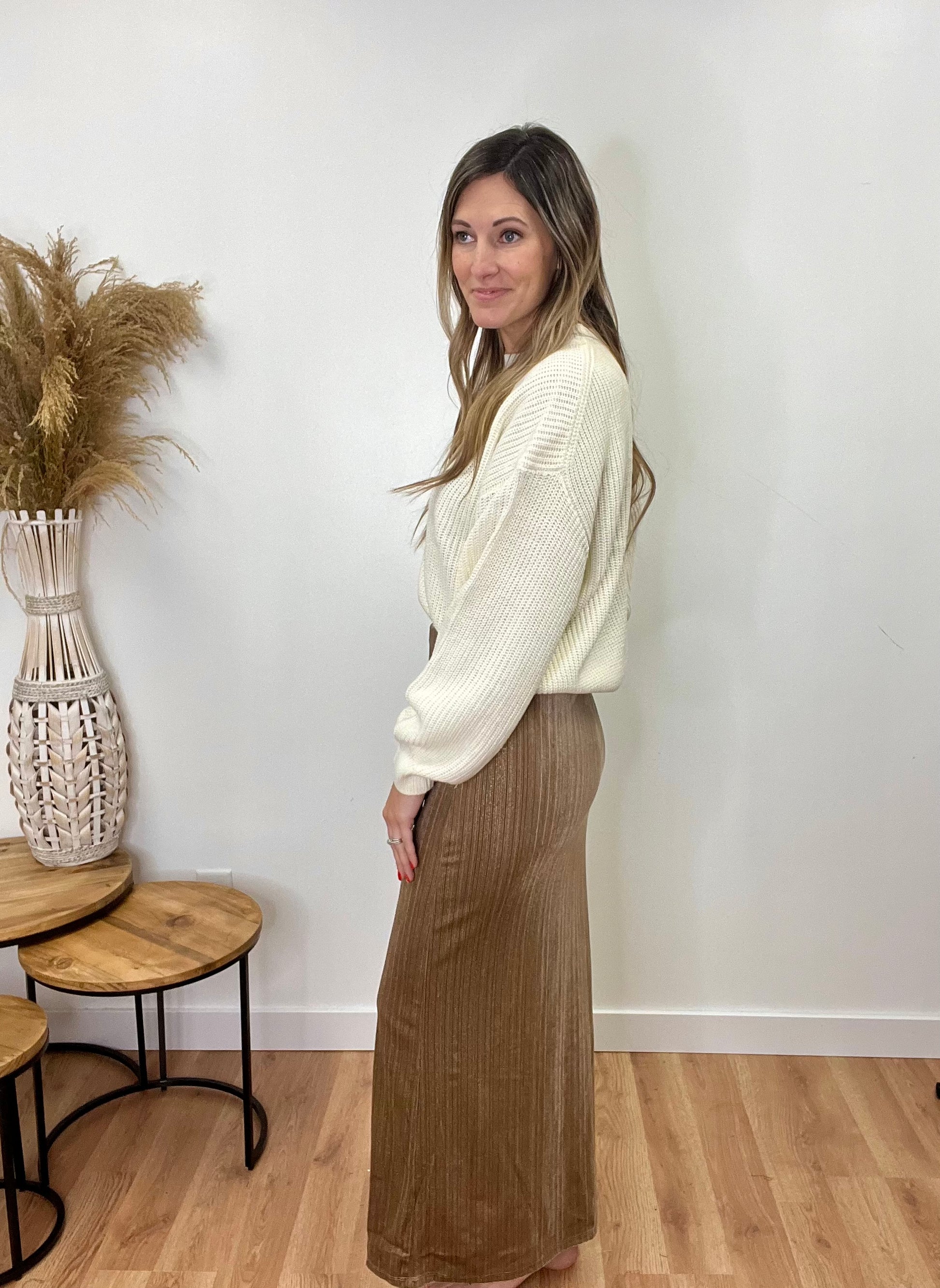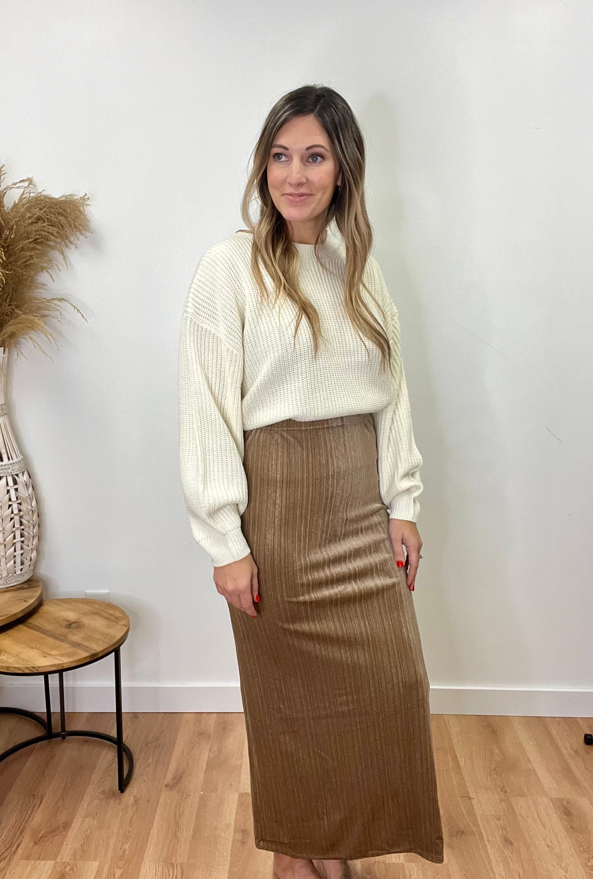Elevate your wardrobe with this sophisticated midi skirt, crafted from luxurious velvet in a rich brown hue. Featuring a high-rise waist that accentuates your silhouette, it offers a smooth texture for a sleek, polished look. The elegant straight hem adds a timeless touch, making it perfect for both formal and chic casual occasions.
