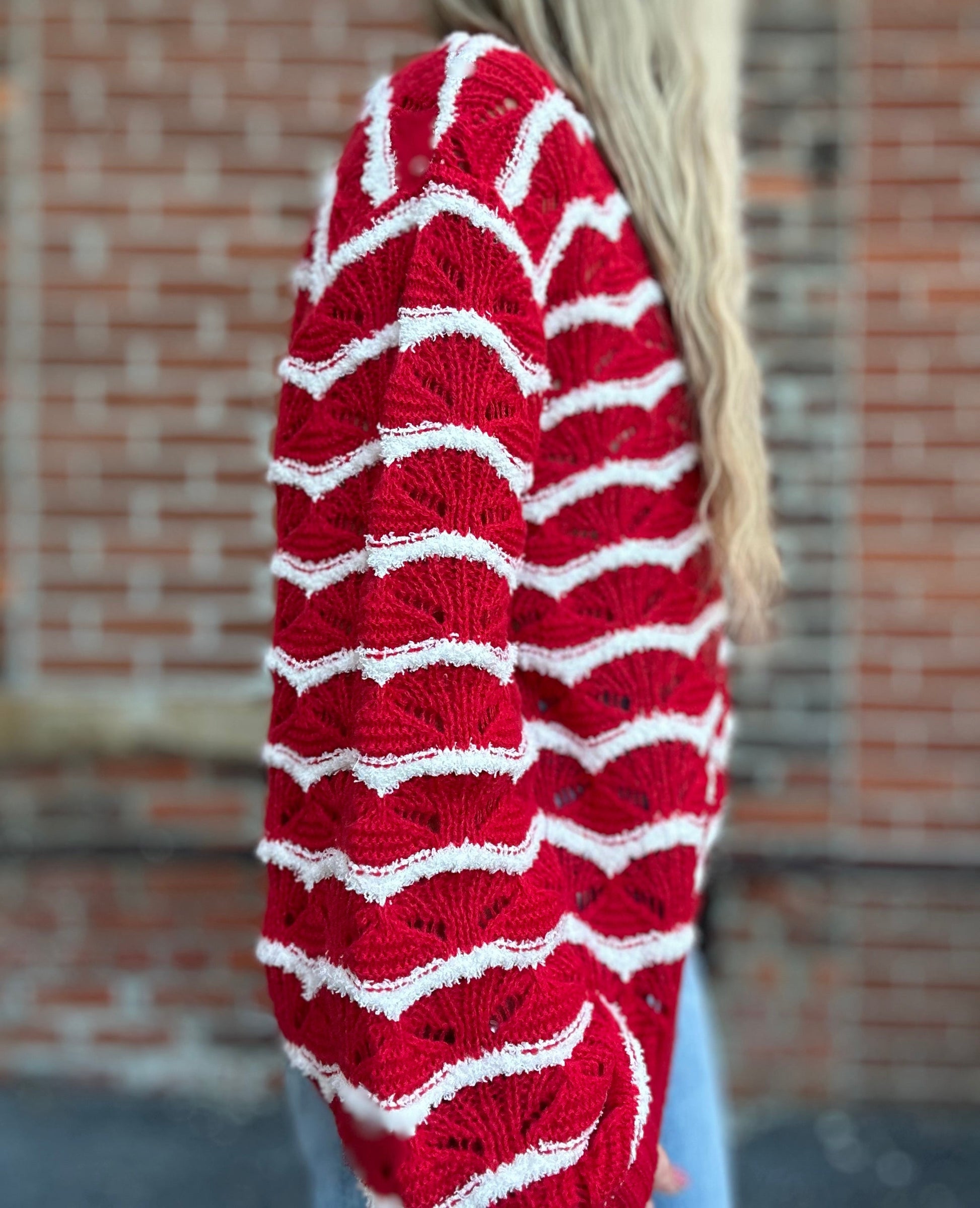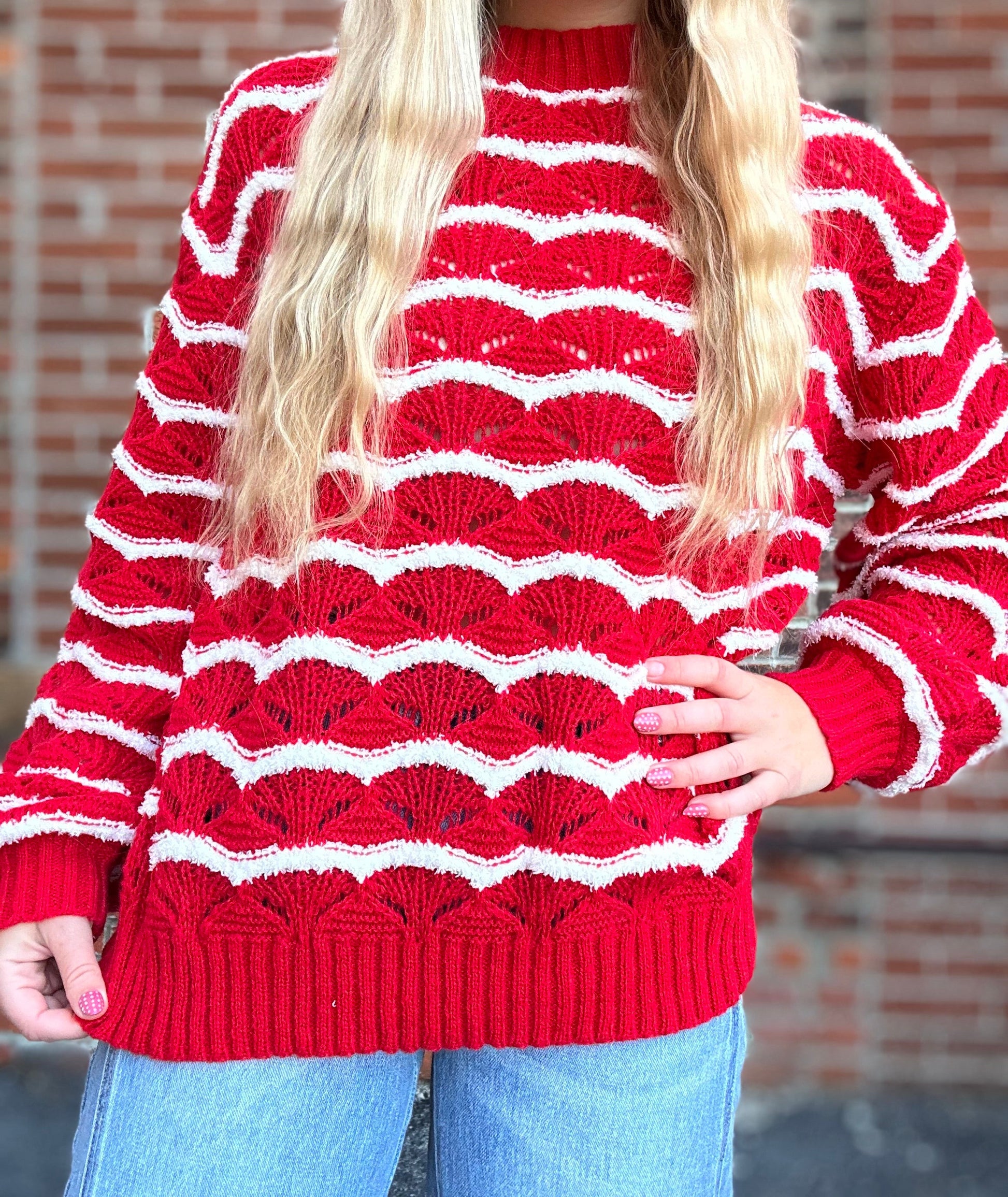 This lightweight hollow knit sweater featuring festive red and white stripes with a cozy textured feel. Designed with a classic round neckline and soft, breathable fabric, this cheerful holiday-ready piece adds a touch of warmth and charm to your seasonal style.