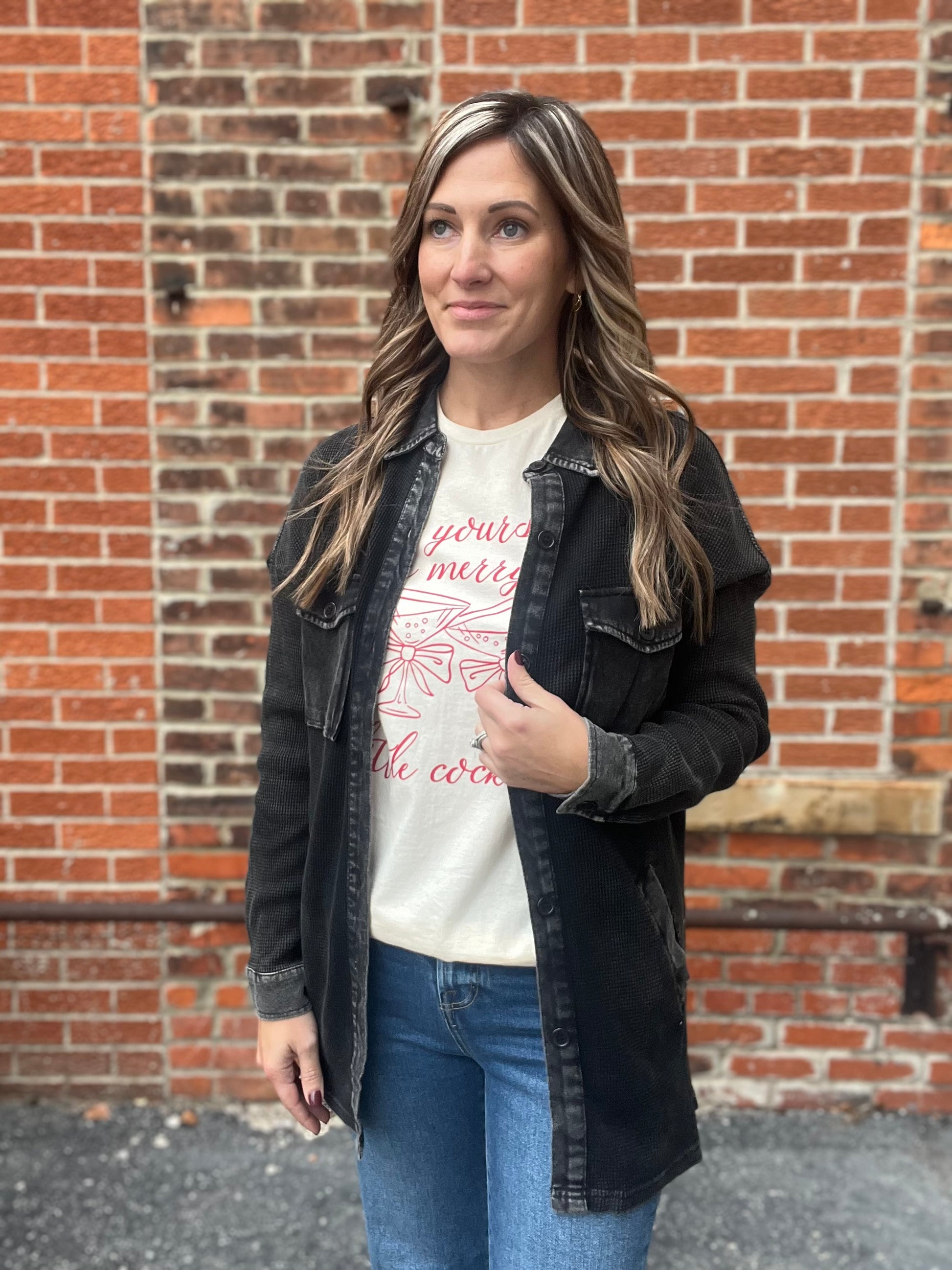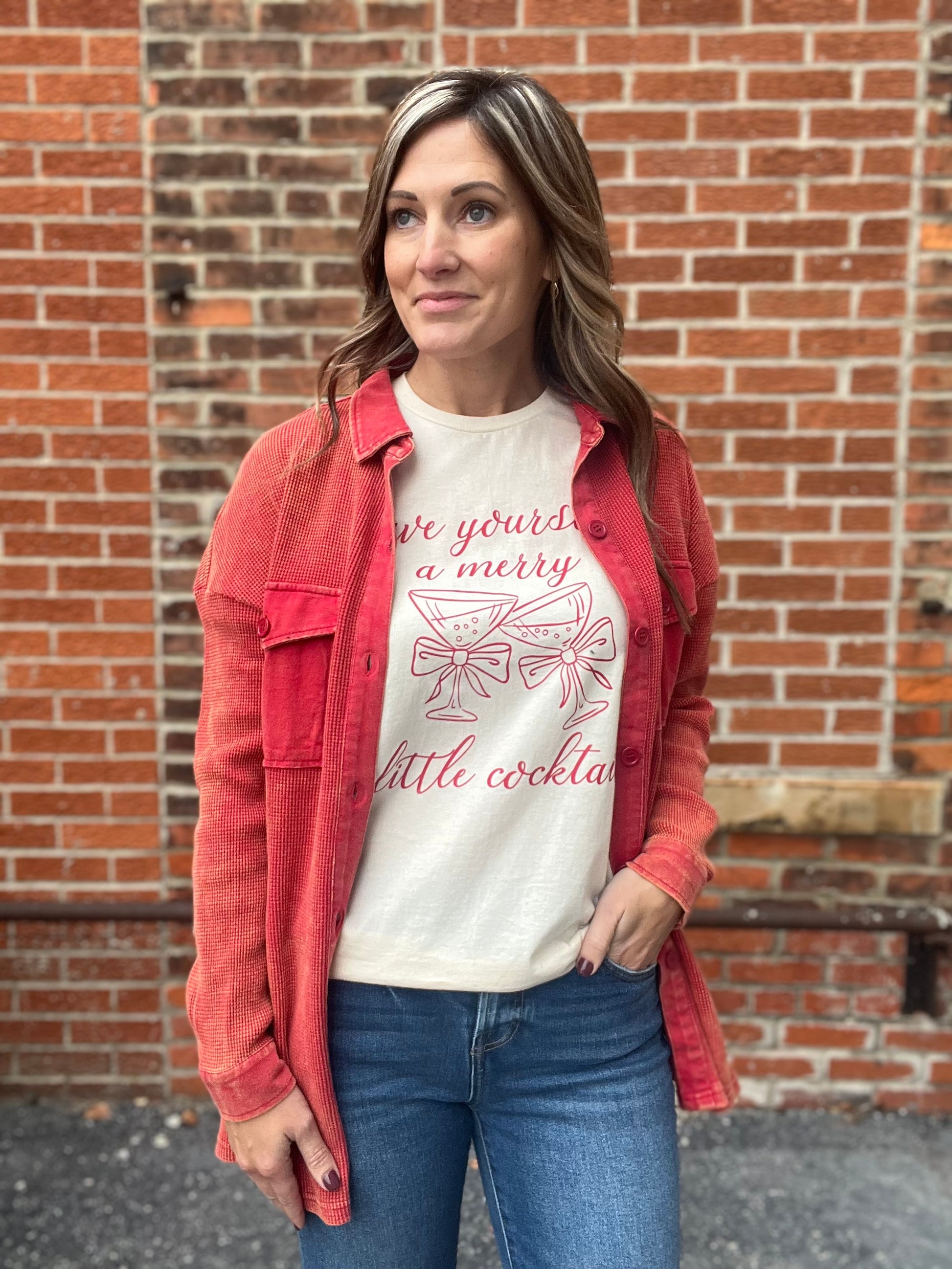 Add a pop of color to your fall layers with this oversized mineral washed red button down jacket! Crafted in a soft waffle textured mineral wash fabric, it features front button pockets and a relaxed fit for effortless style. Perfect for layering over tees, this jacket combines comfort and the perfect style all in one.