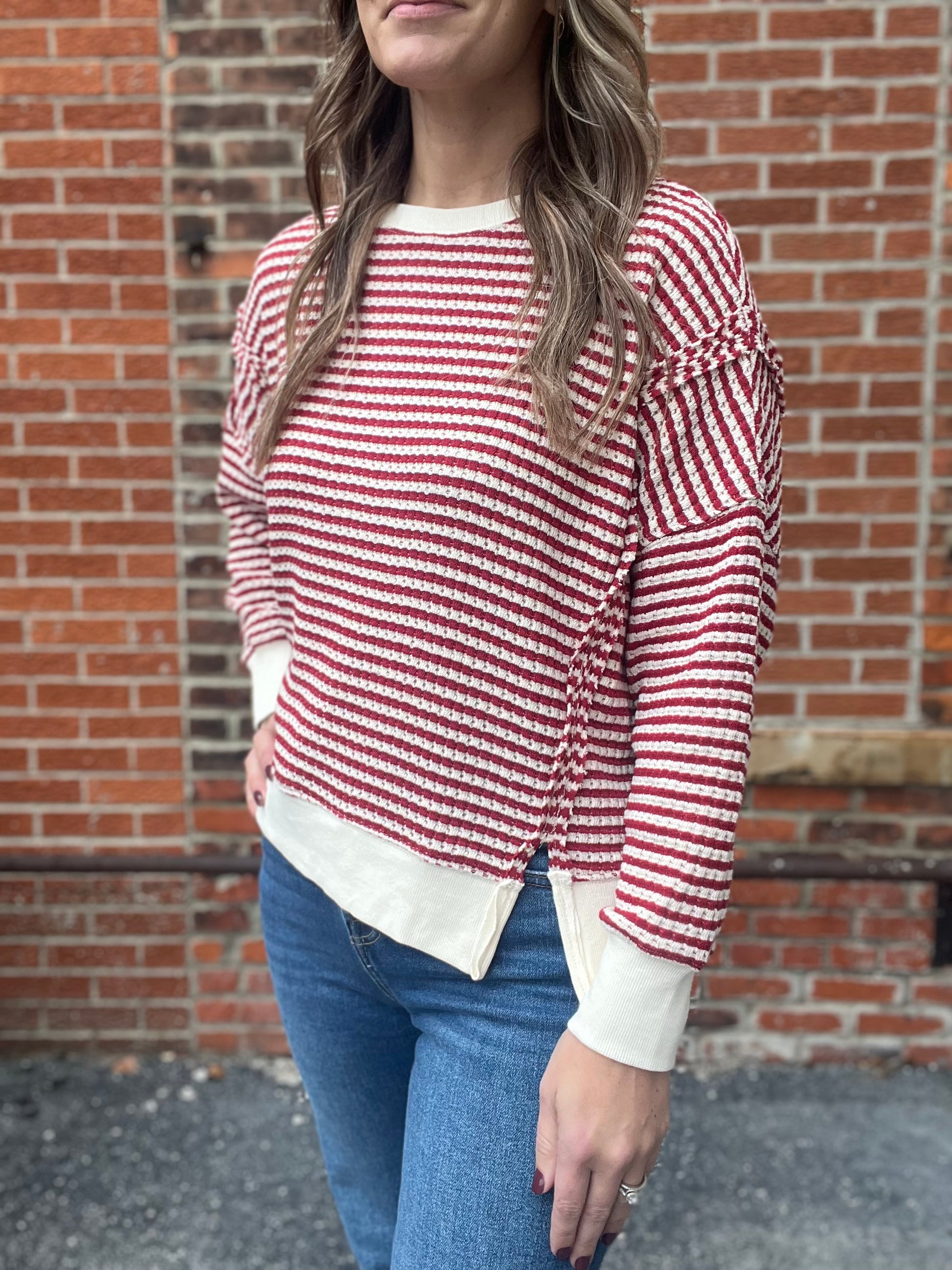 A festive and flattering favorite! This red and cream striped long sleeve top features exposed seam detailing, a cream round neckline, and a subtle split hem for an easy, relaxed fit. Perfect for effortless everyday style with a touch of charm.