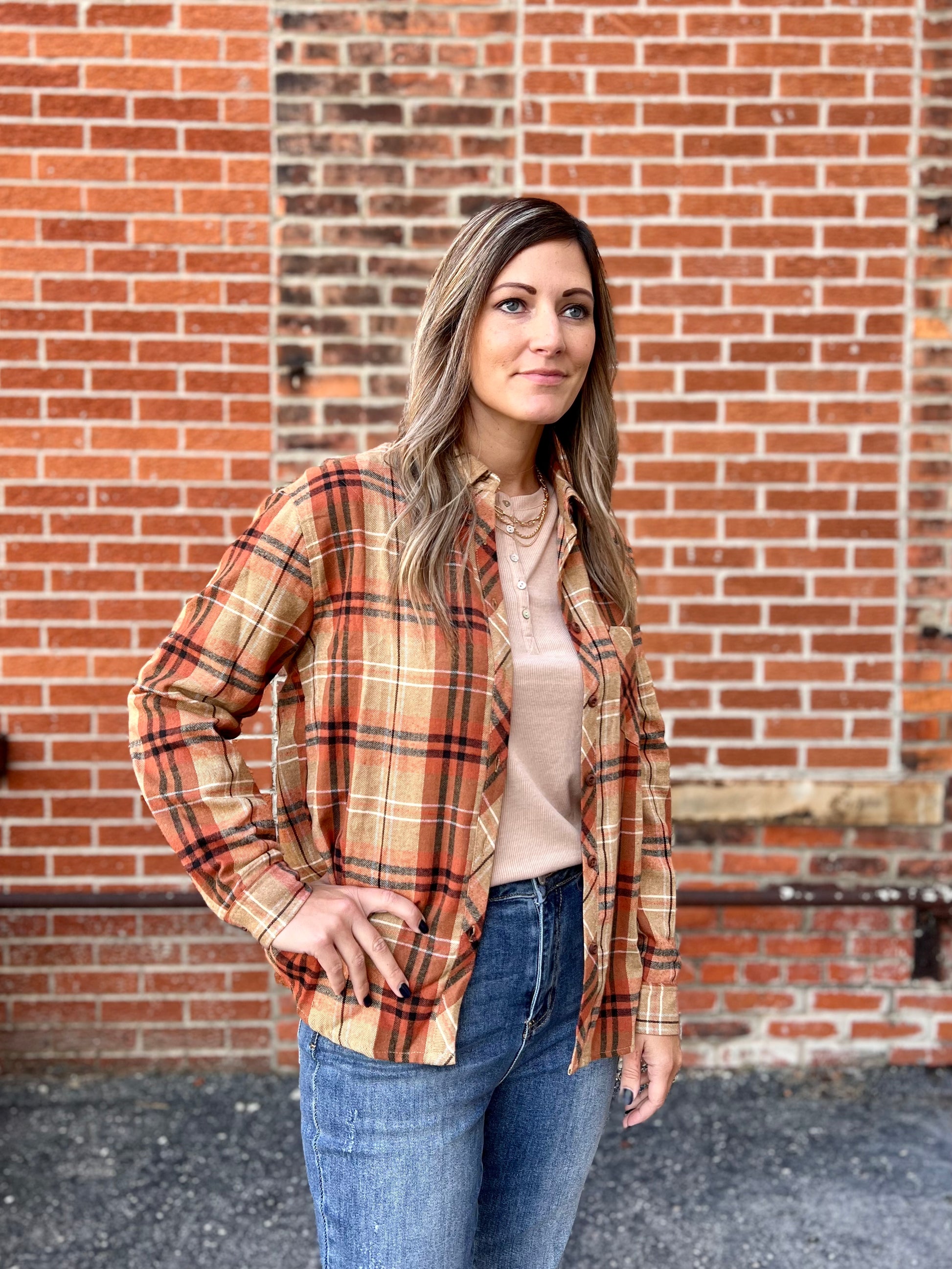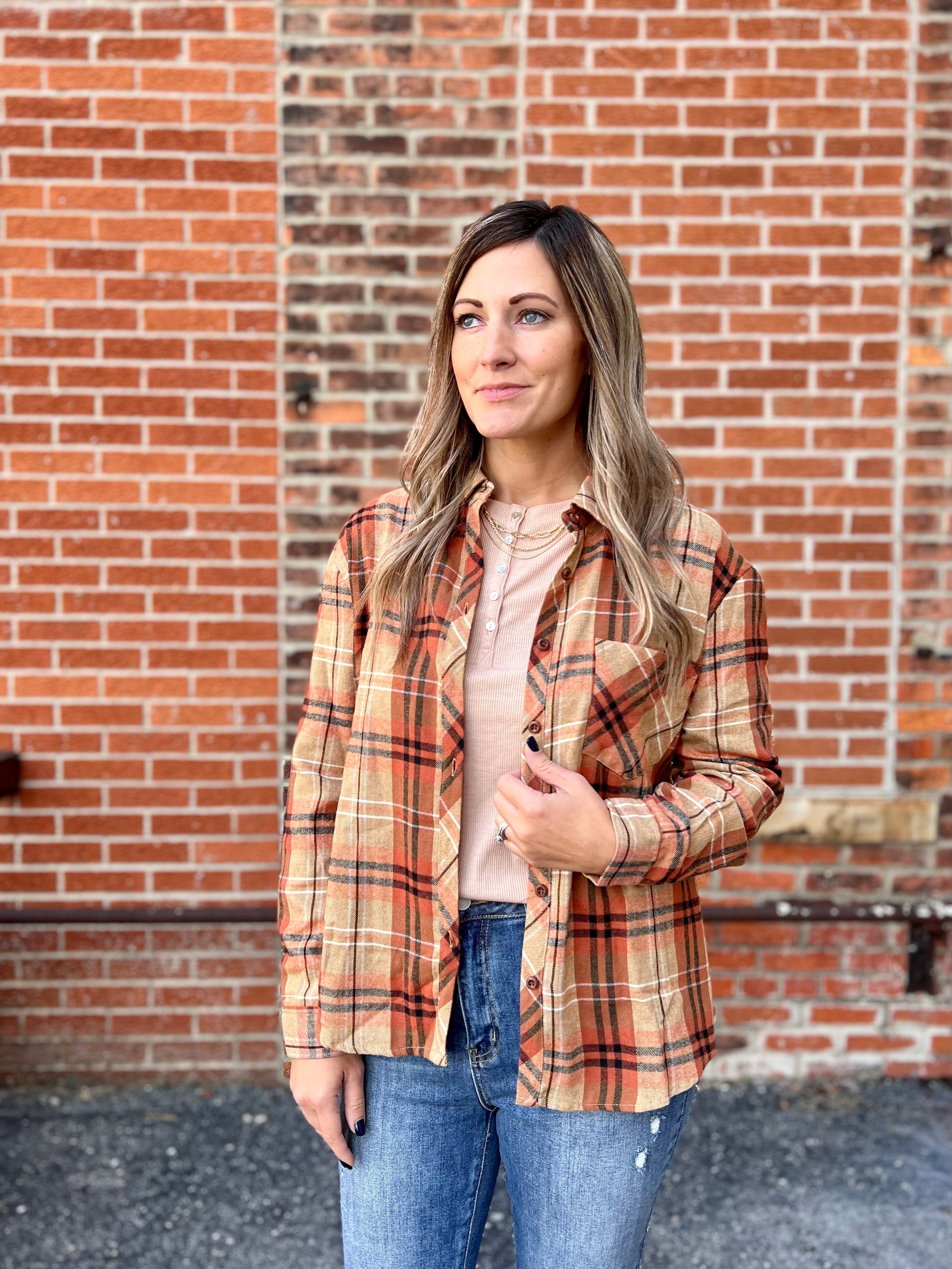 Khaki and Orange Plaid Flannel. Oversized Fit. Great for Layering on Cozy Cool Fall Days.