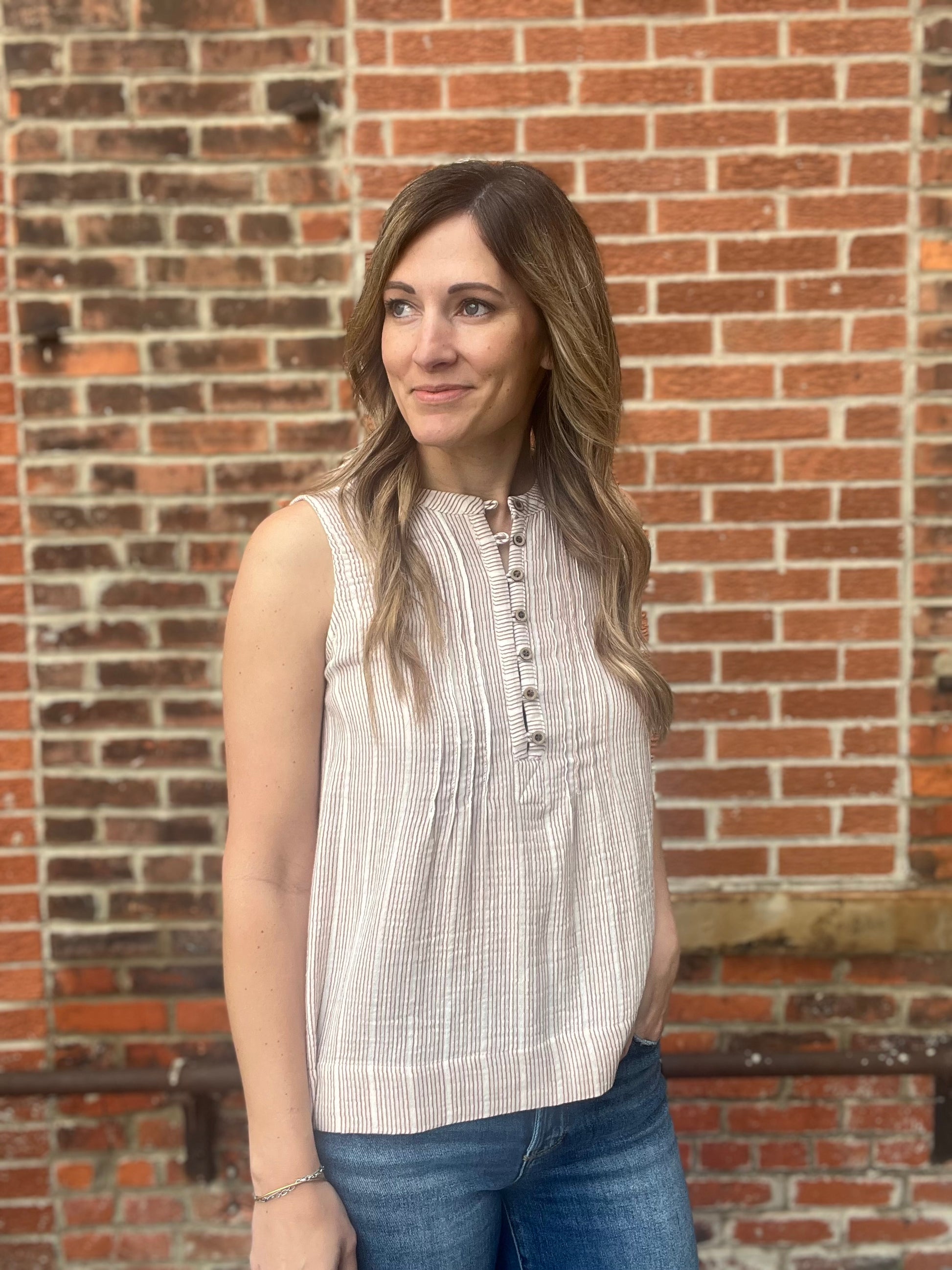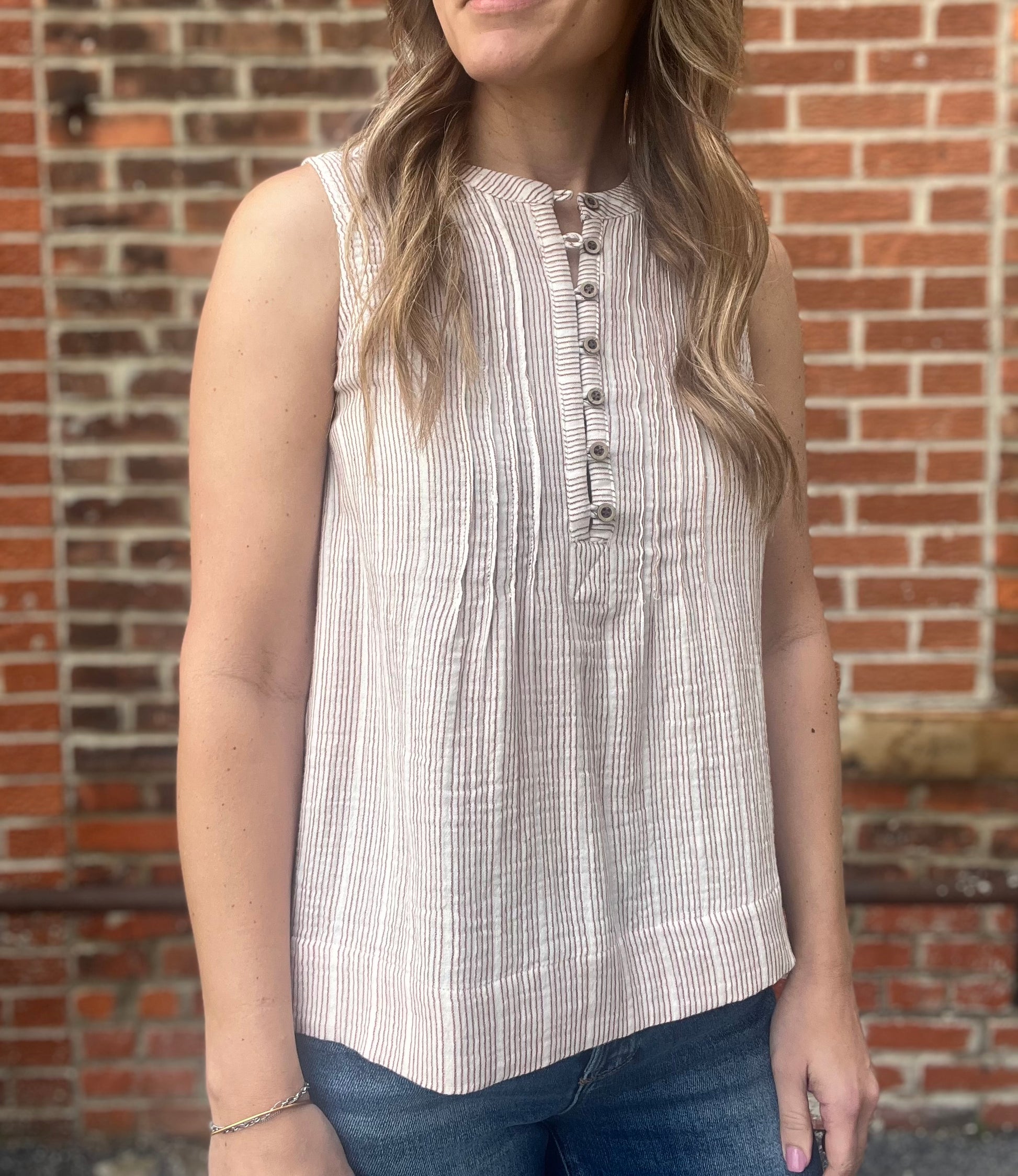 This striped relaxed fit Henley tank is crafted from soft, breathable cotton gauze for an airy feel that’s perfect for warm days. The button up front adds a laid back, lived in touch, while the relaxed silhouette drapes comfortably for an easygoing vibe. Finished with subtle stripes for a classic, coastal feel this tank is your go to for sun soaked days and casual layering.