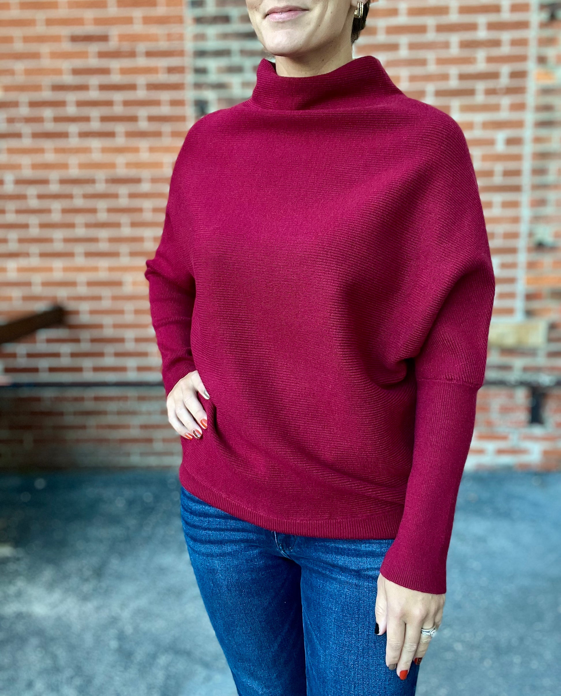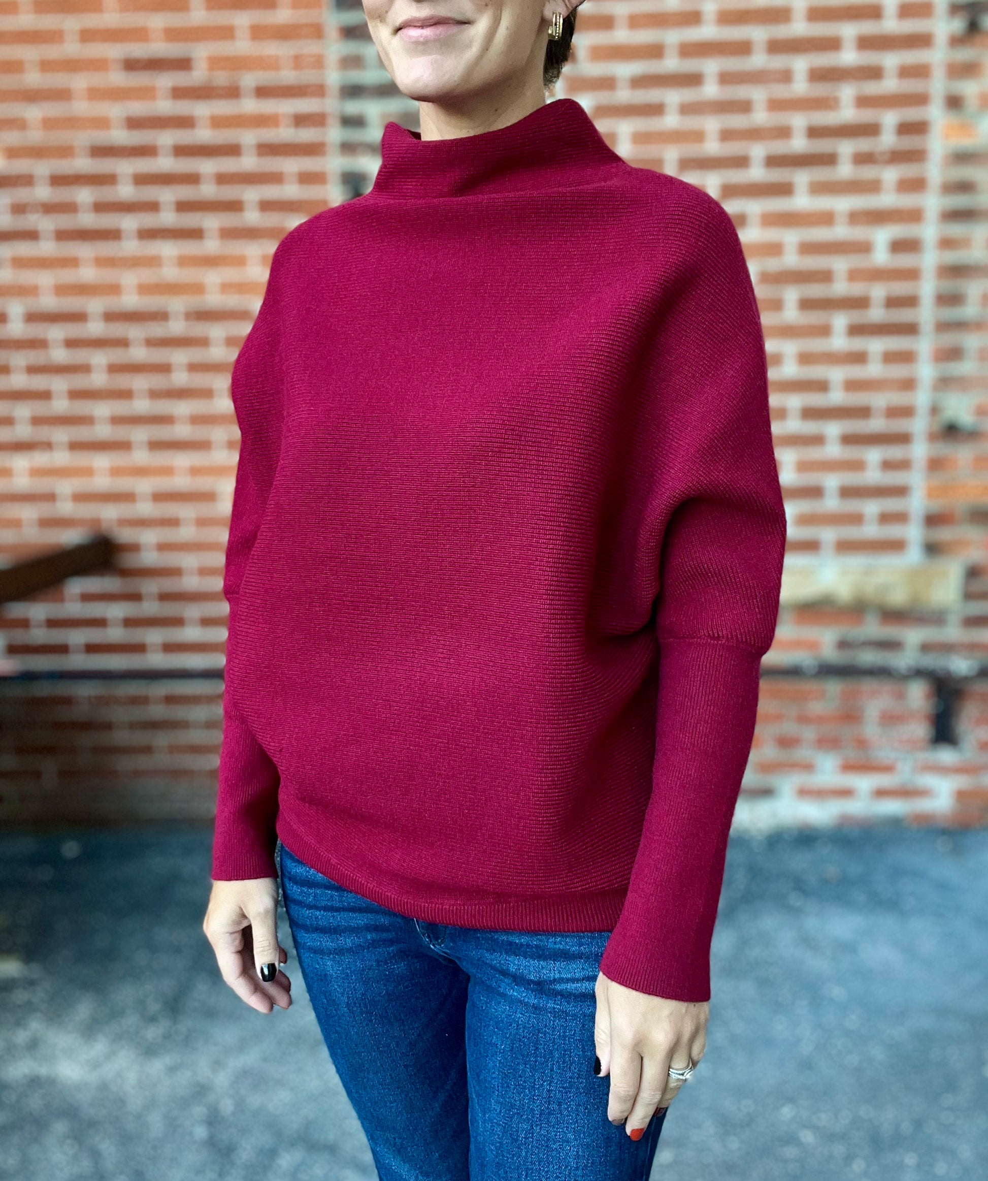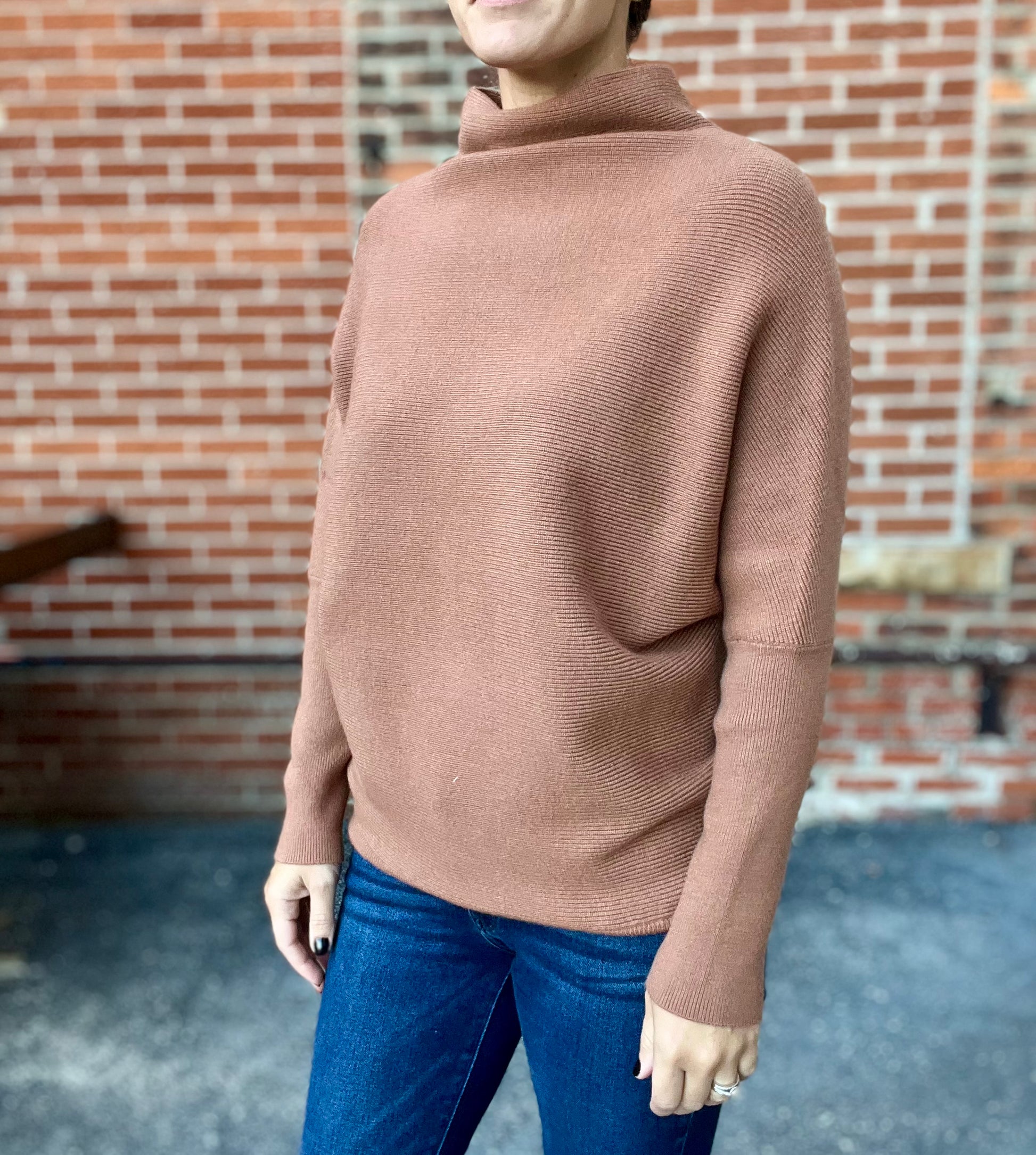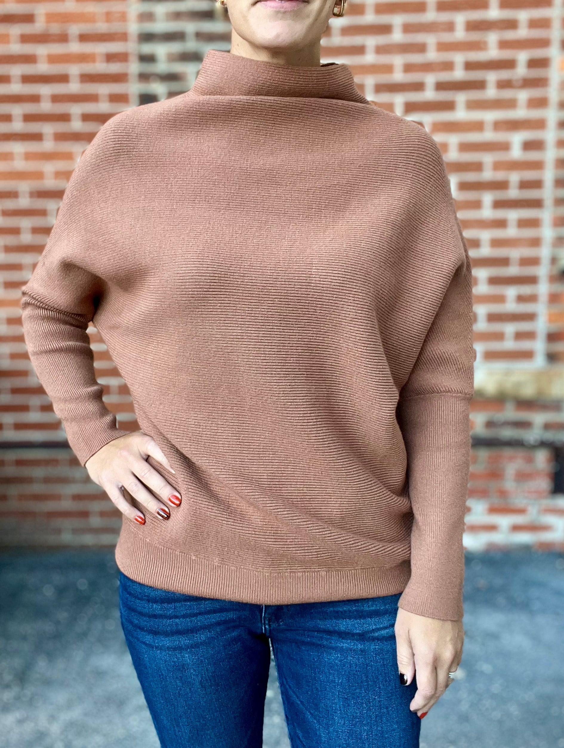 This soft mock neck sweater blends comfort with effortless style. Featuring a dolman sleeve and a dropped shoulder design, it offers a relaxed, slouchy silhouette that's both chic and comfortable. The medium-weight fabric adds just the right amount of warmth, perfect for layering in cooler weather. With its ribbed texture, the sweater has a cozy feel while also providing subtle detail and structure. The mock neck adds a modern touch, making this sweater an ideal choice for casual days or dressed-up looks alike.