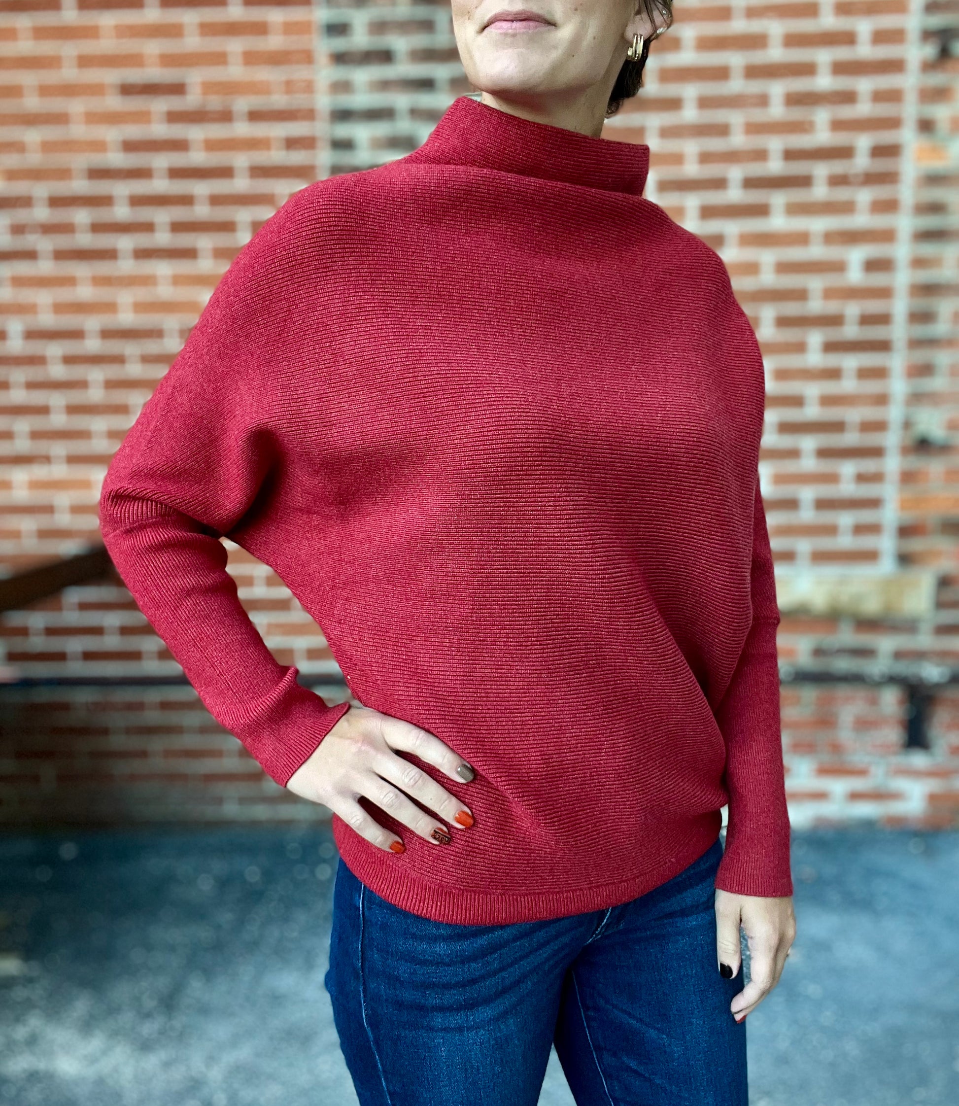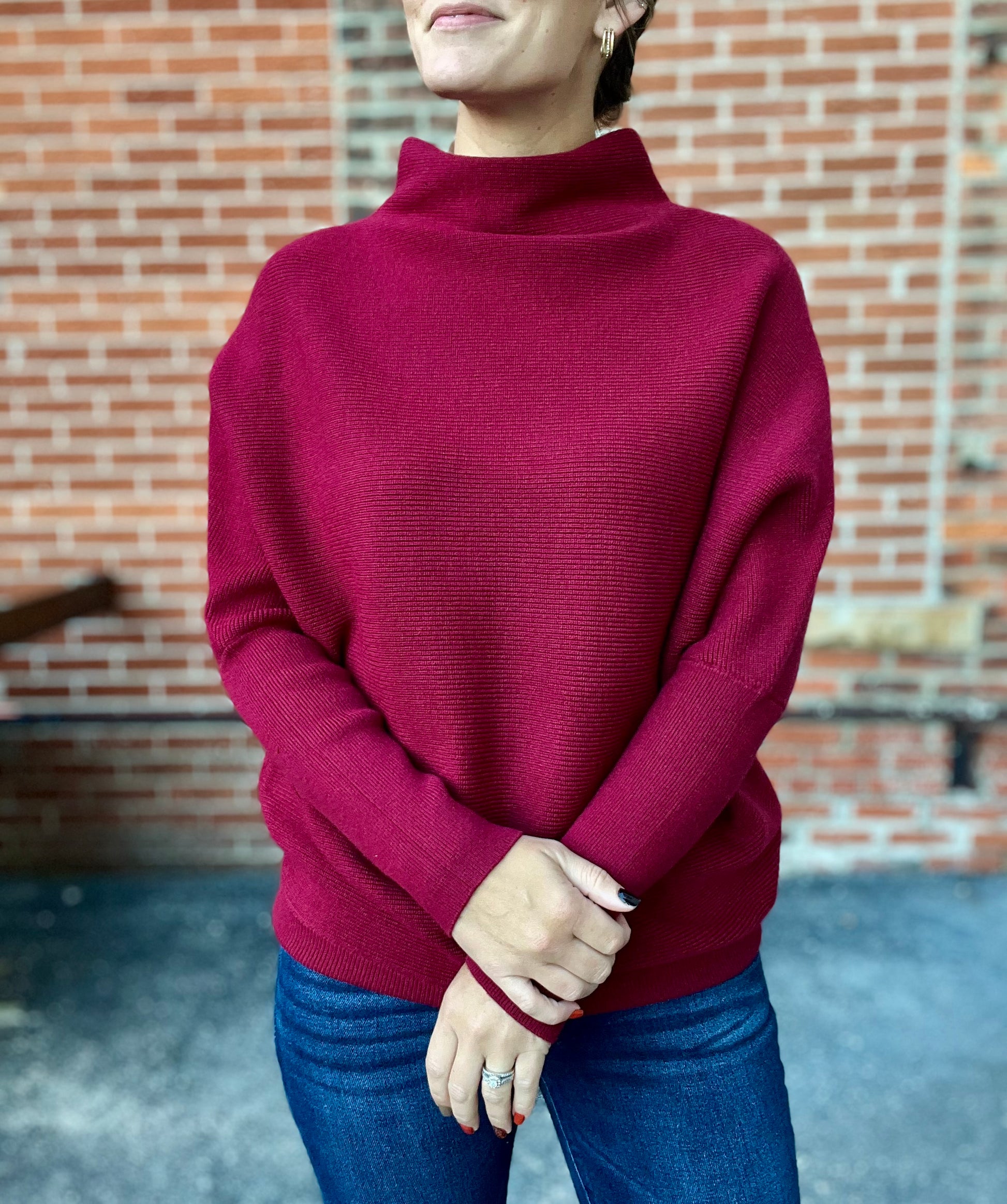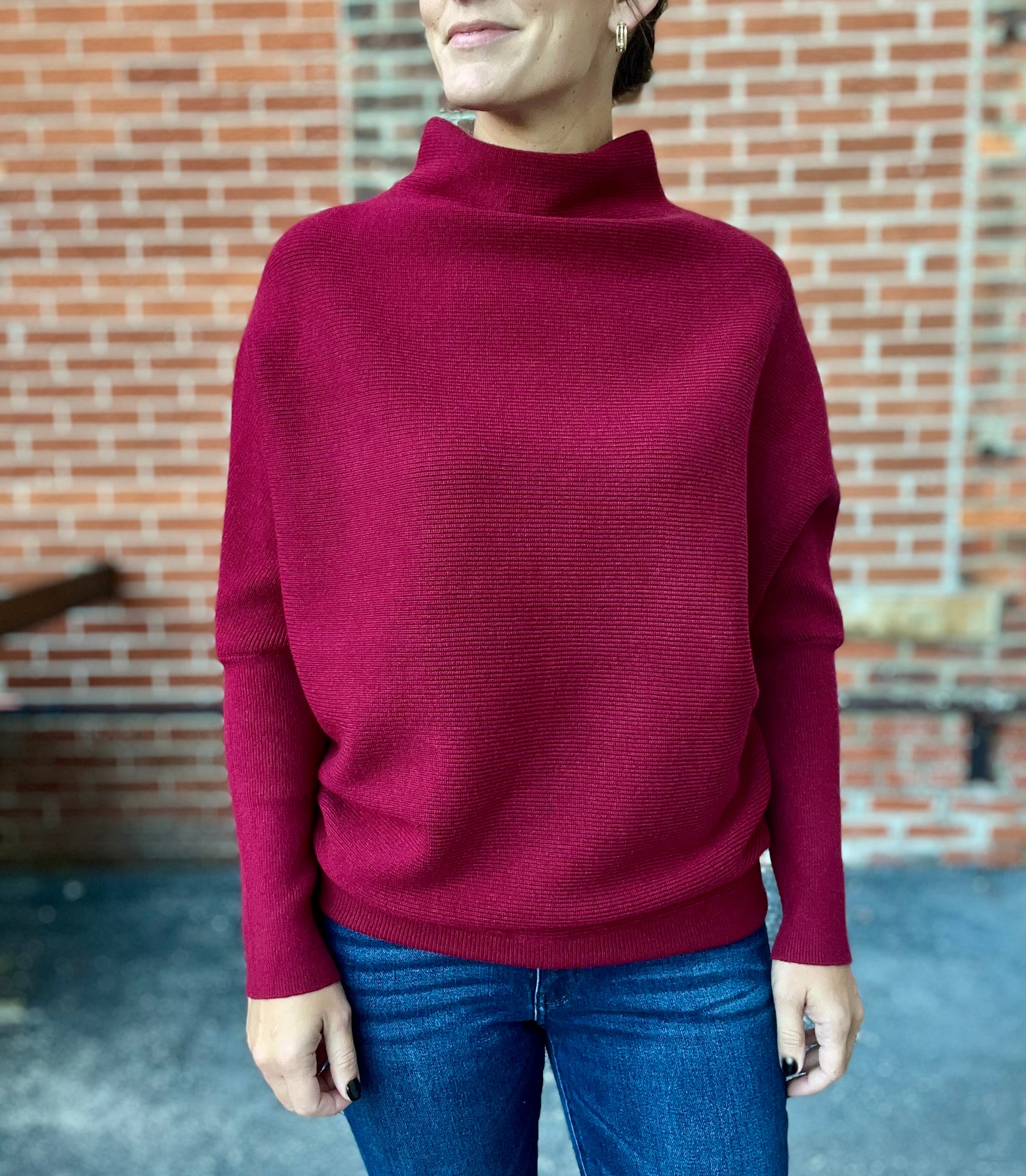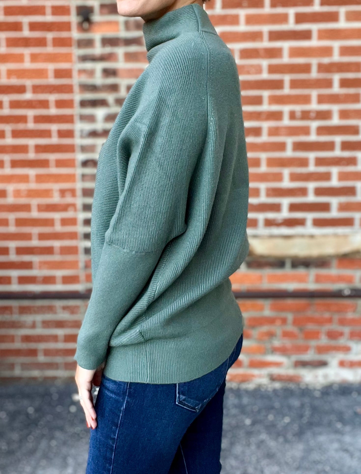 This soft mock neck sweater blends comfort with effortless style. Featuring a dolman sleeve and a dropped shoulder design, it offers a relaxed, slouchy silhouette that's both chic and comfortable. The medium-weight fabric adds just the right amount of warmth, perfect for layering in cooler weather. With its ribbed texture, the sweater has a cozy feel while also providing subtle detail and structure. The mock neck adds a modern touch, making this sweater an ideal choice for casual days or dressed-up looks alike.