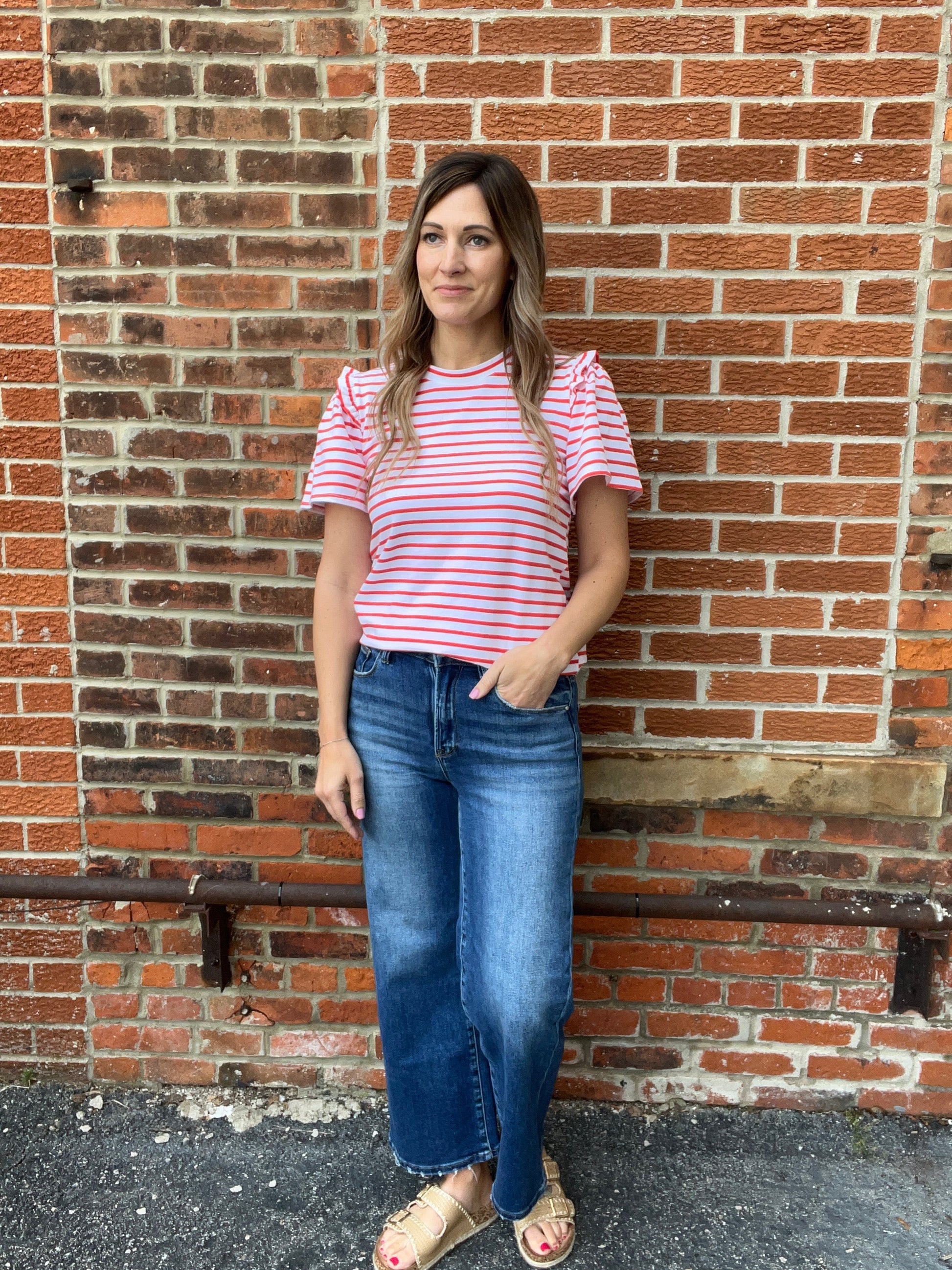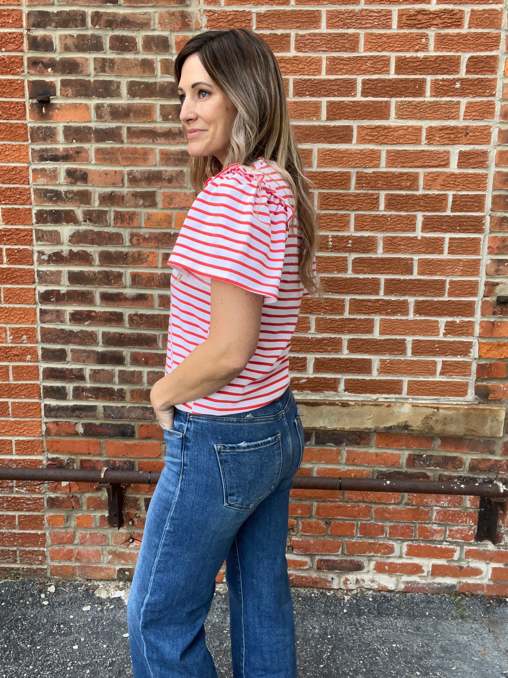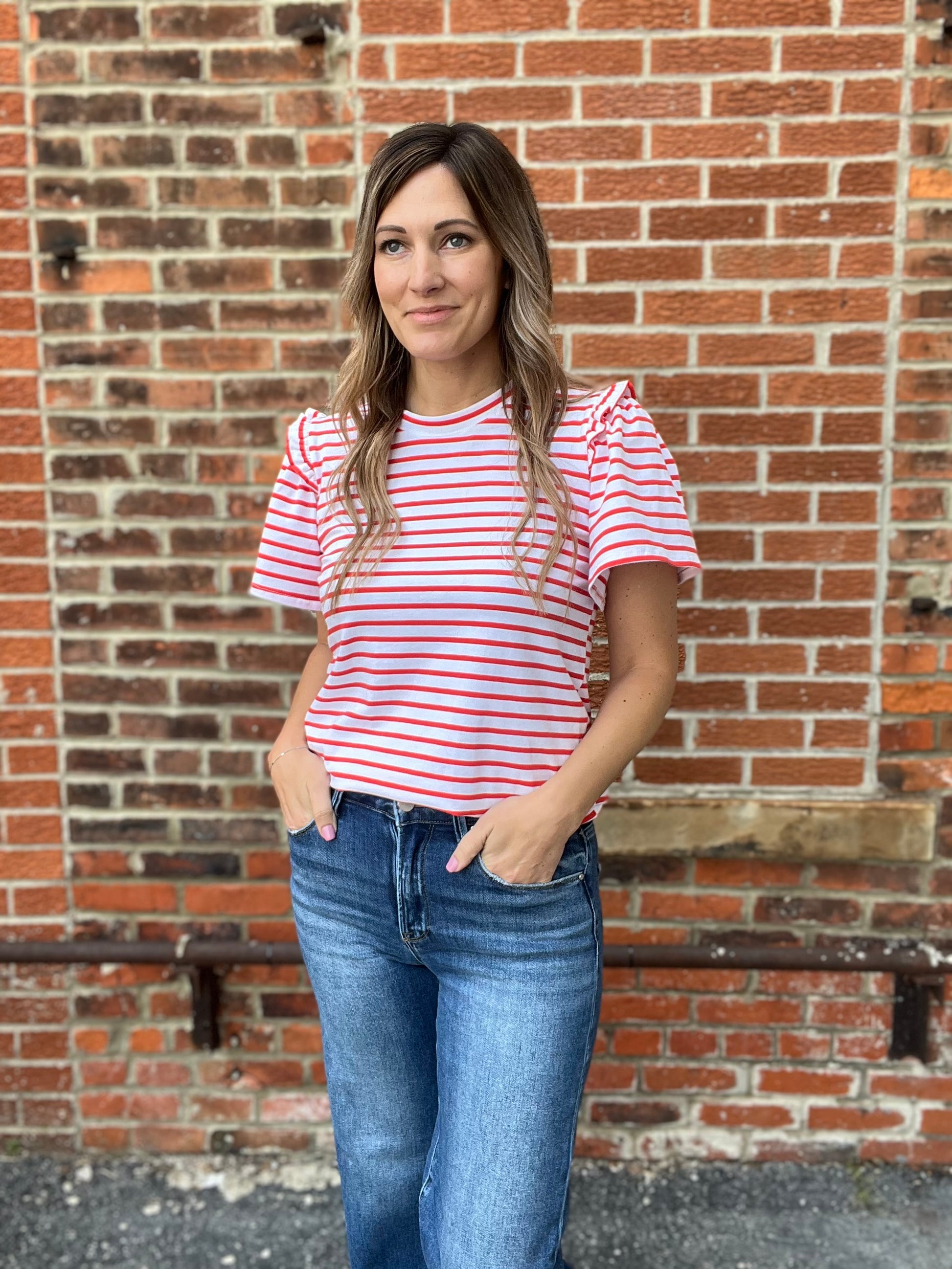 This white and coral striped top features soft ruffled short sleeves for a flirty, feminine touch. The lightweight fabric and classic stripe pattern make it a breezy go to for warm days, while the delicate ruffles add just the right amount of charm. Easy to dress up or down, it’s the perfect mix of casual and cute.