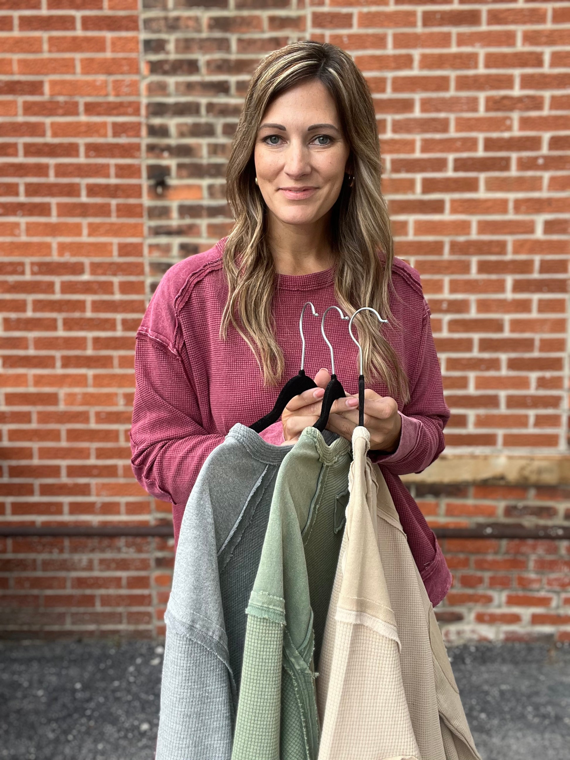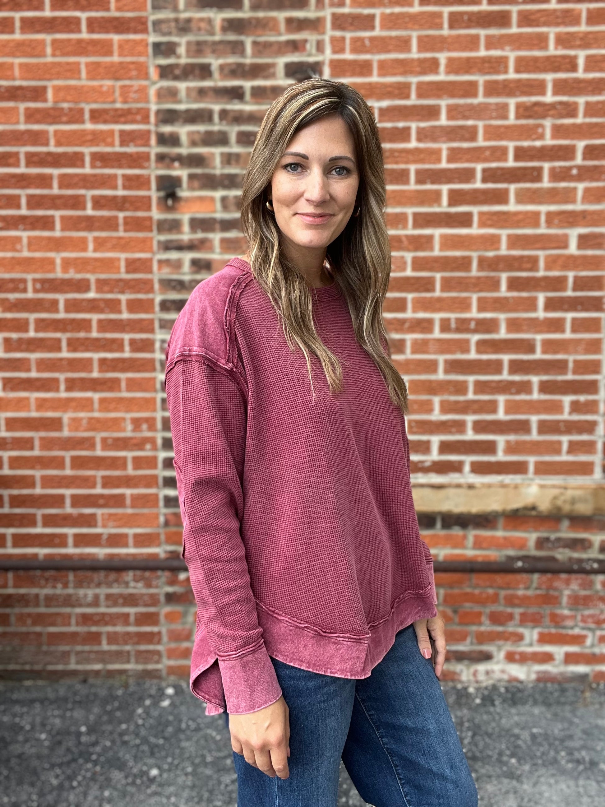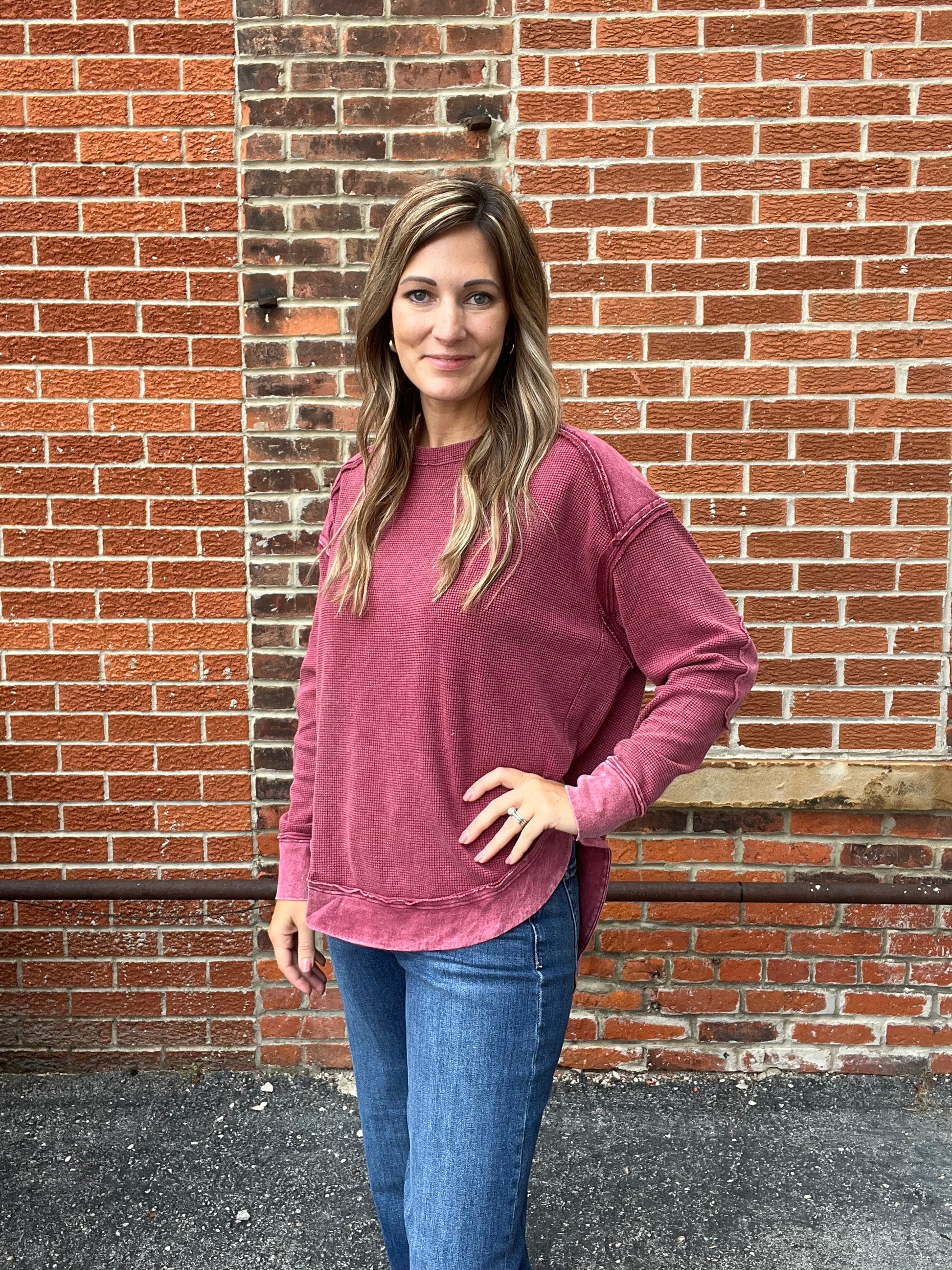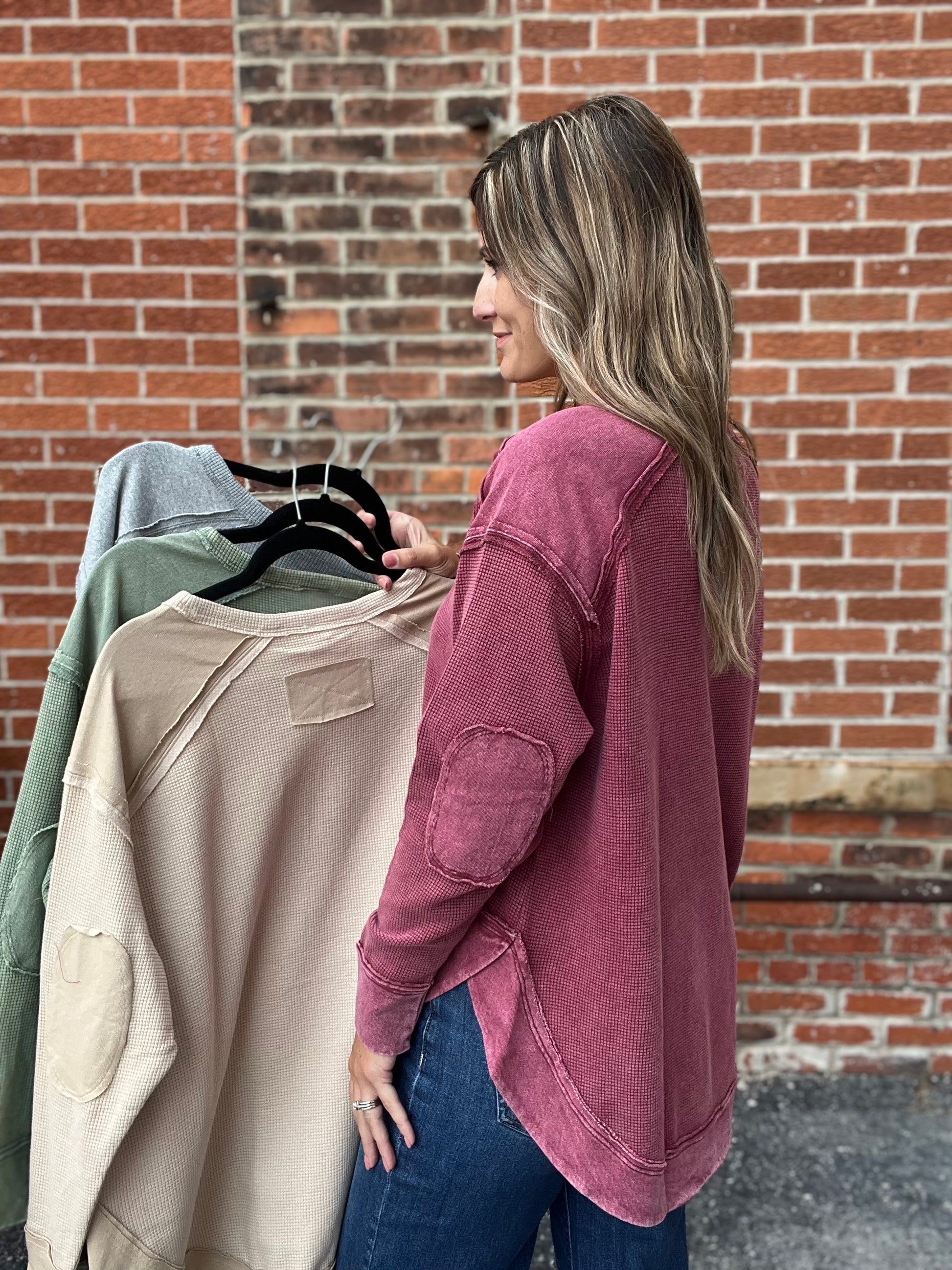A cozy waffle textured thermal top featuring an acid wash finish, raw edge details, and a rounded hem for a laid back vibe. Designed with contrast elbow patches for a stylish touch, making it an easy piece to wear on its own or layered.