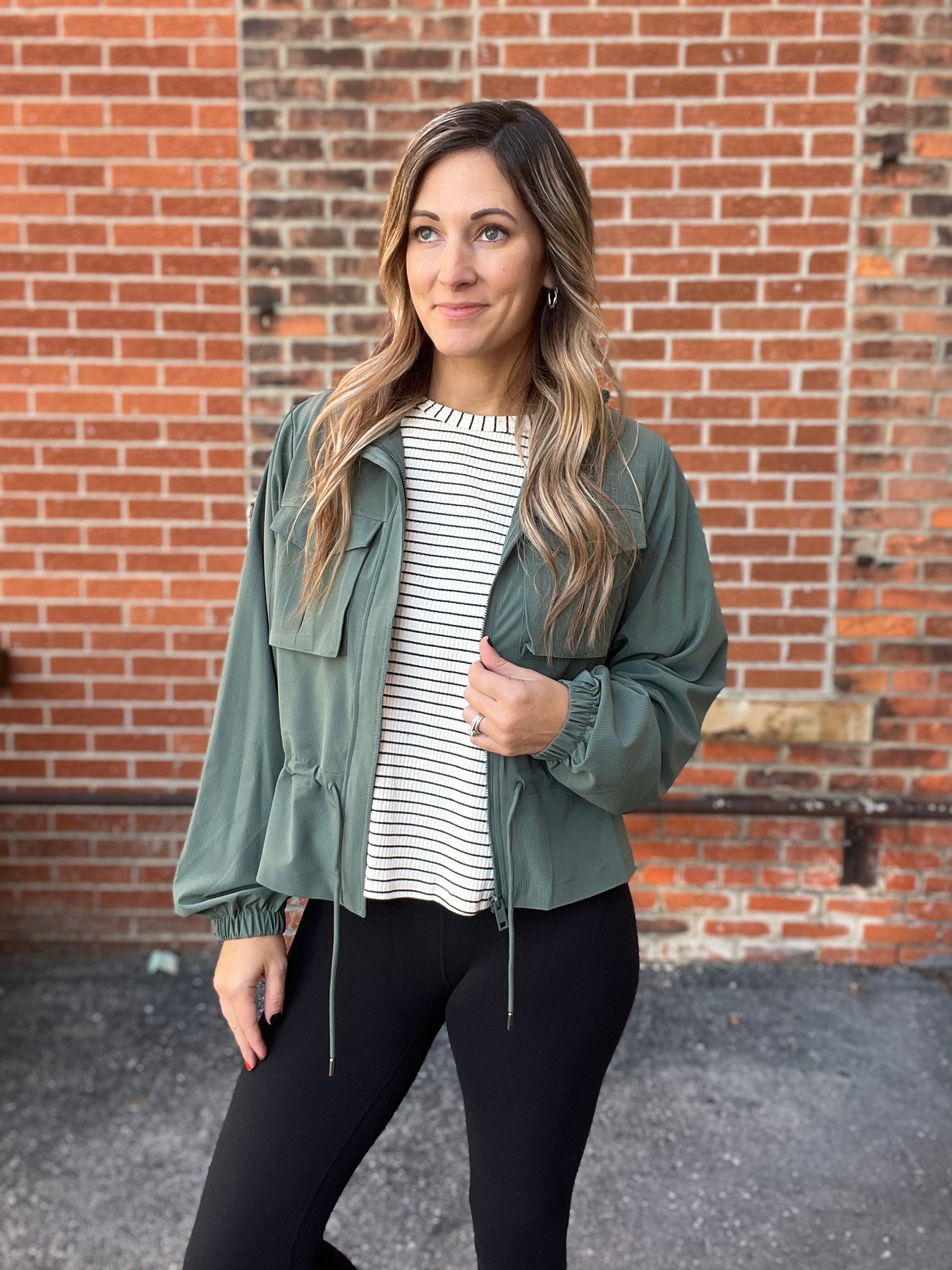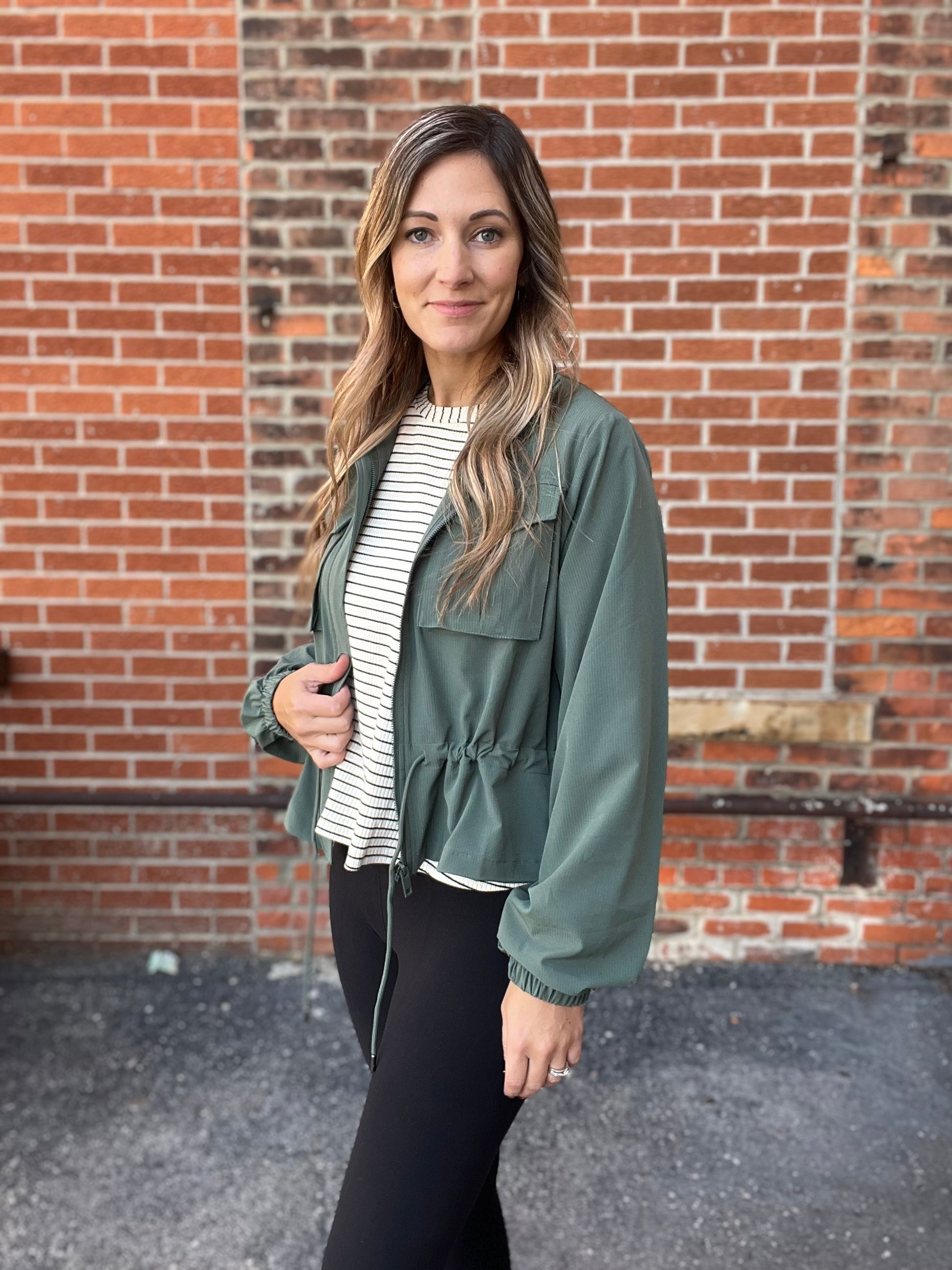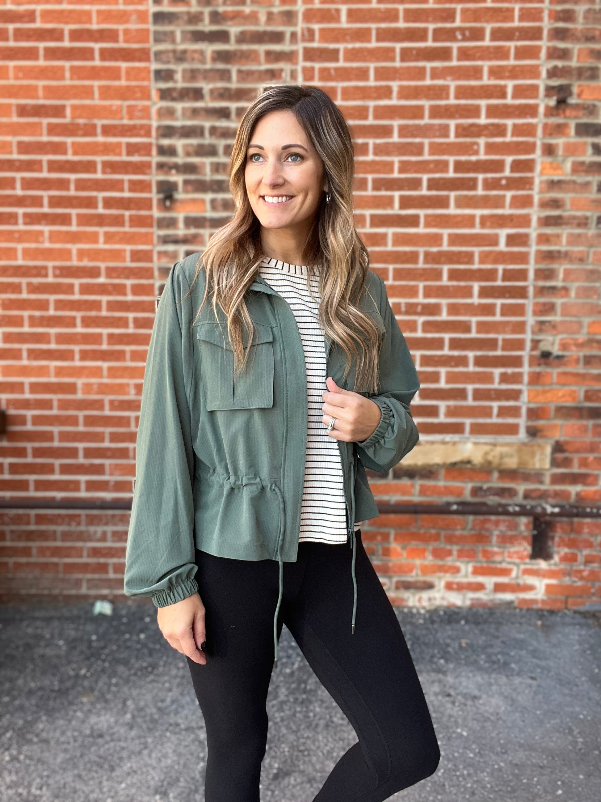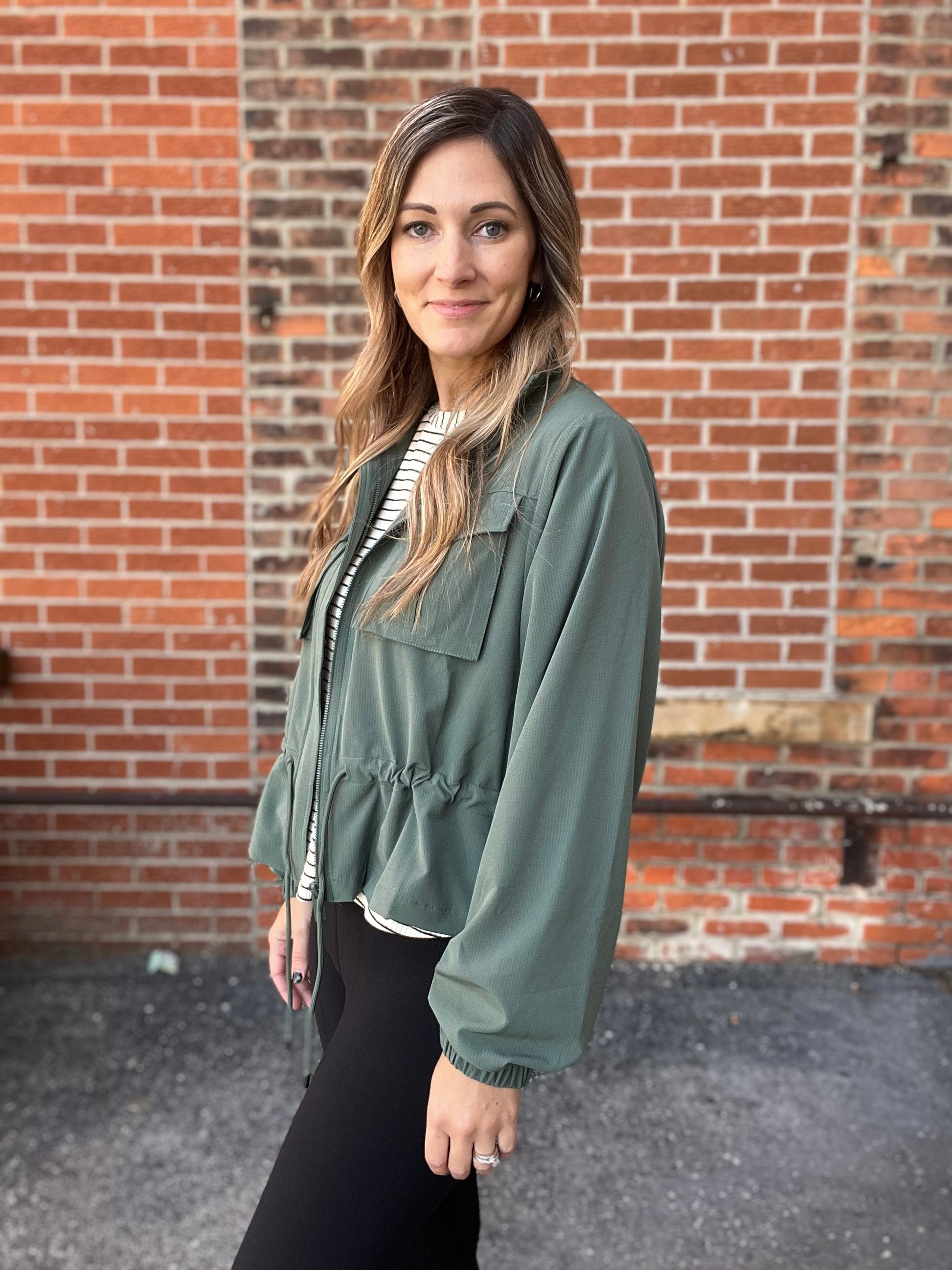 This Lightweight Jacket Gives Comfort and Style. The Beautiful Sage Green Zip Up, Features Functional Front Chest Pockets, A Draw String Cinch Waist Detail, and Zipper Closure. The Payt Jacket Is Perfect To Throw On And Go For A Cute Layered Casual Look.