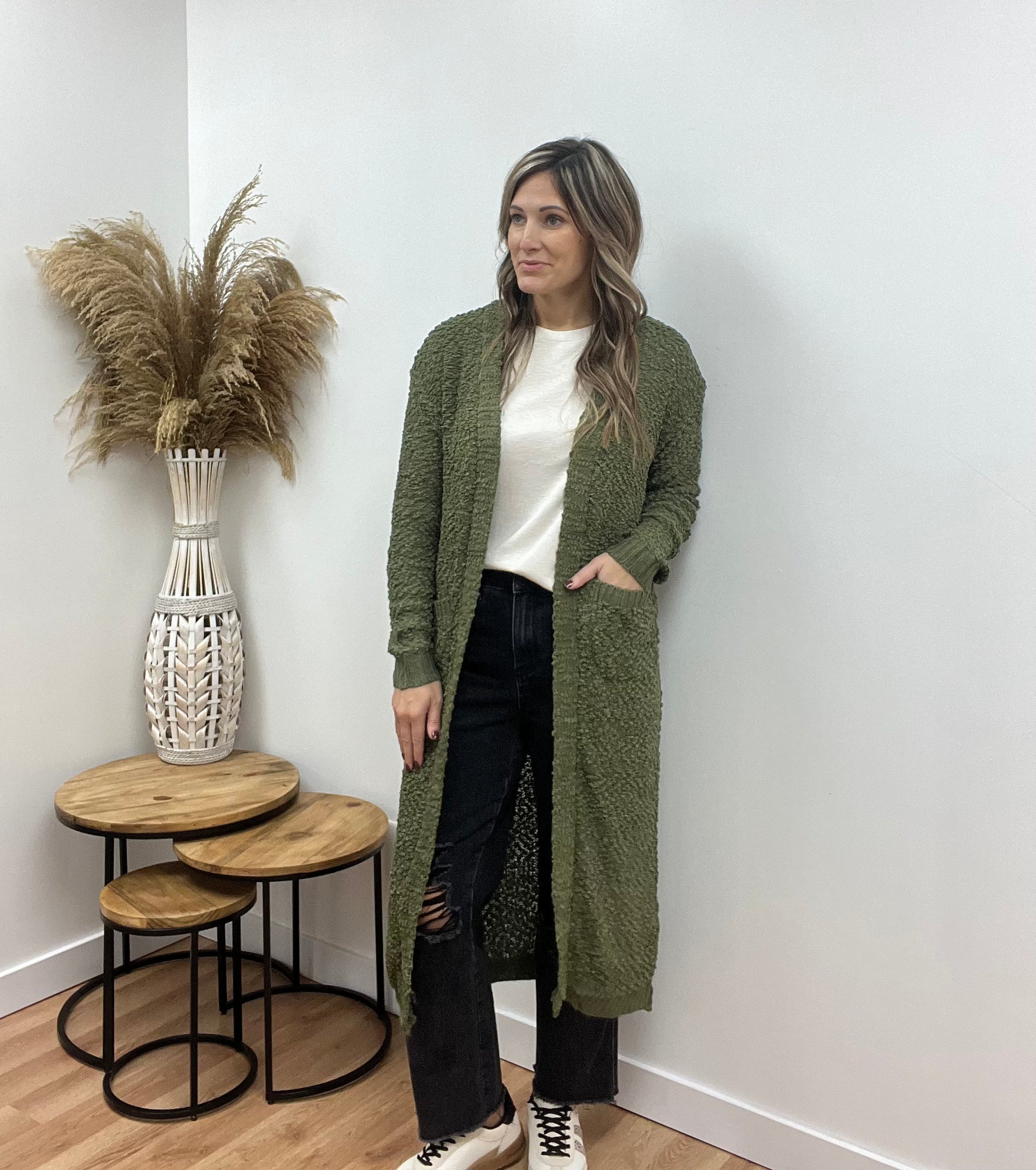 This long, cozy knit popcorn cardigan designed with a soft, textured feel and effortless drape. Finished with two front pockets for that perfect mix of comfort and everyday practicality.