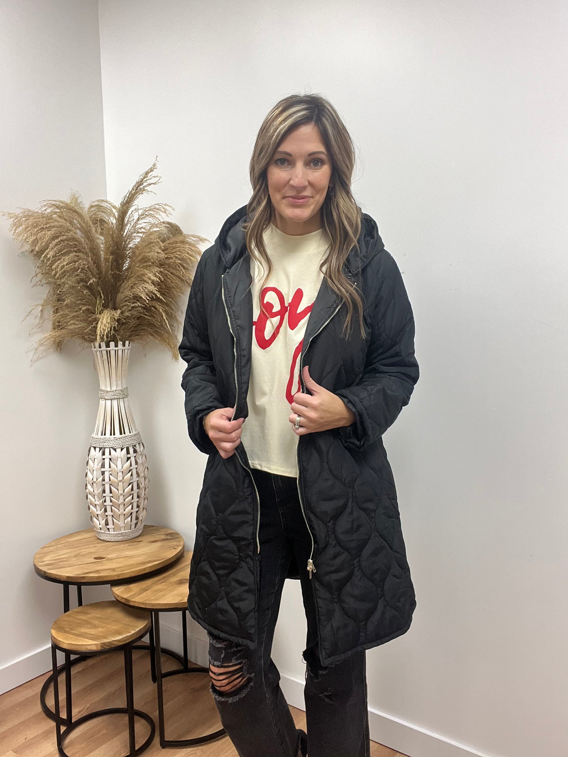 Black puffer jacket with a cozy, quilted body and functional side pockets. Designed with a removable hood so you can switch up your look. Warm, versatile, and easy to style for any winter outing.
