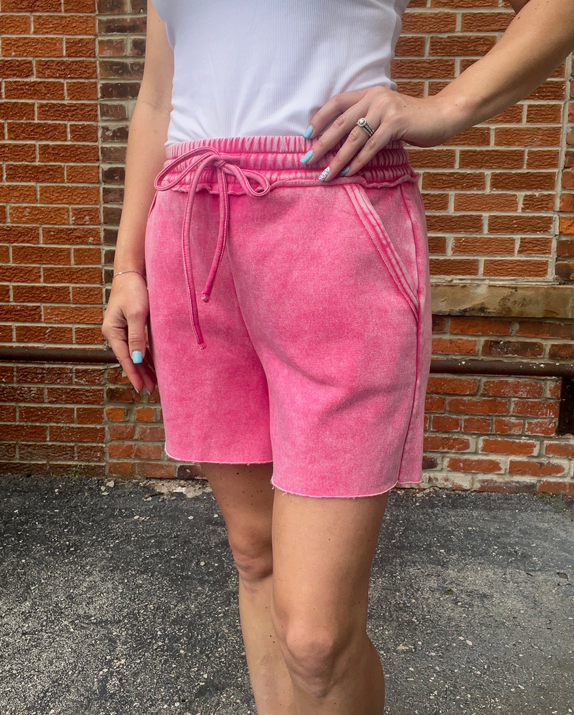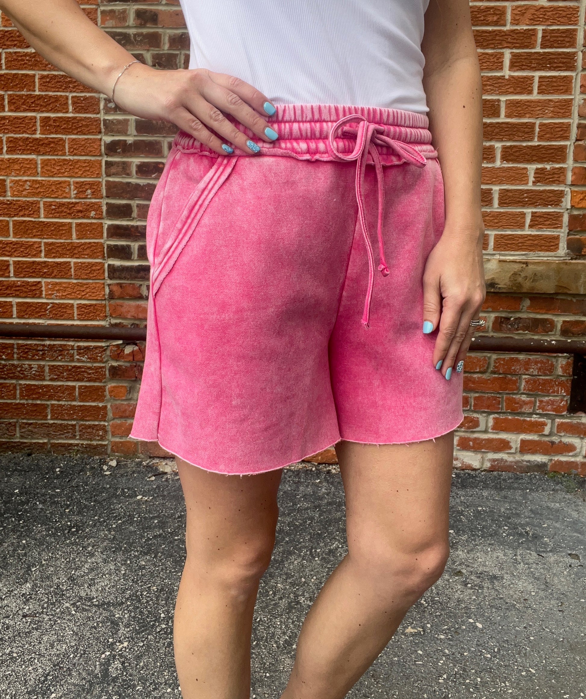 These vibrant pink shorts are all about comfort and style. Made from a soft, plush fabric with a cozy feel, they feature a high rise elastic waistband with a matching drawstring for a snug, adjustable fit. The raw edge hem and curved side seams add a trendy, sporty vibe. Perfect for lounging, casual outings, or a relaxed day at home, these shorts combine bold color with everyday ease.