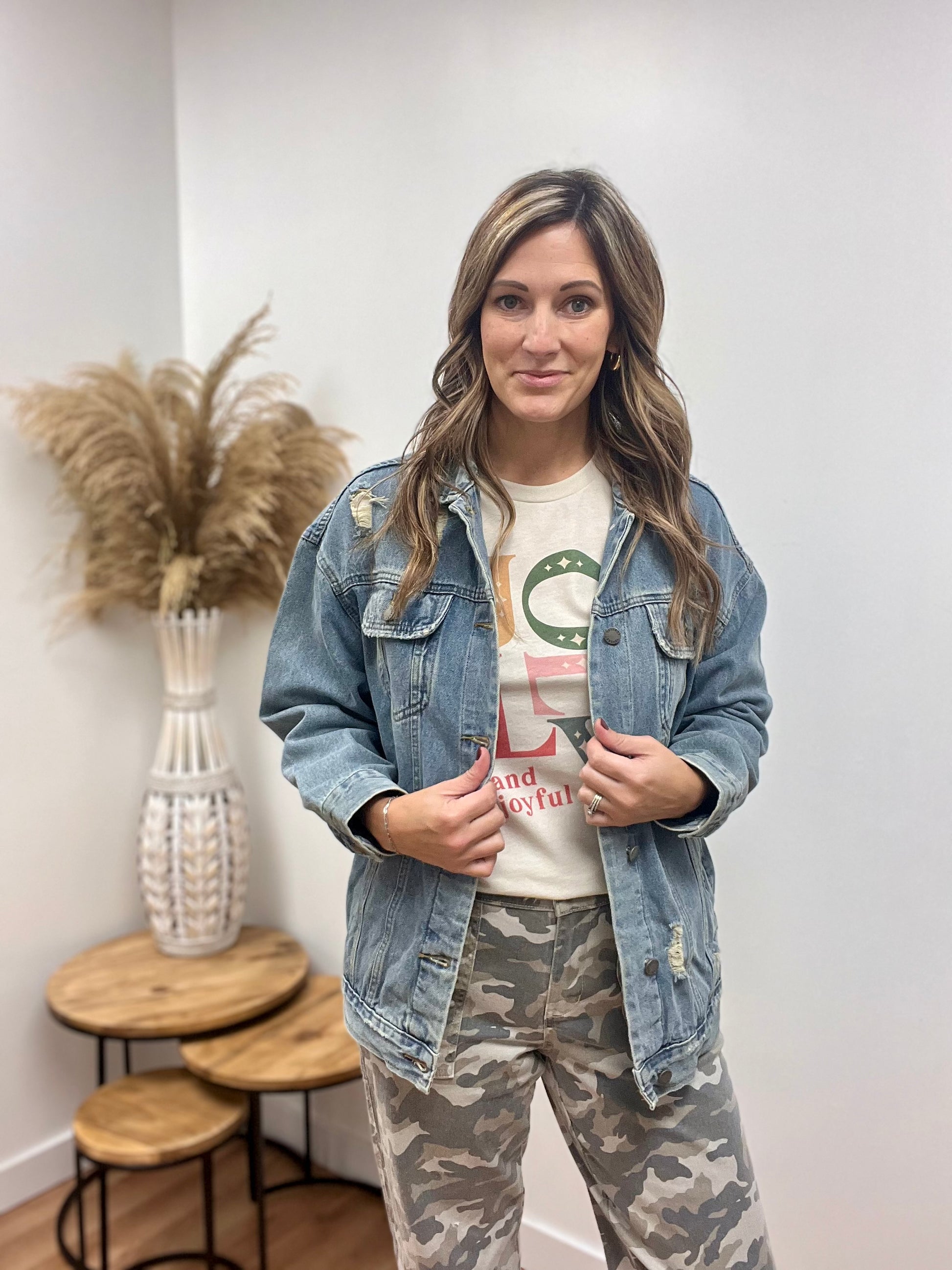 This oversized distressed denim jacket with a relaxed, throw-on fit and perfectly lived-in detailing. A timeless layer that adds an effortless edge to any look.