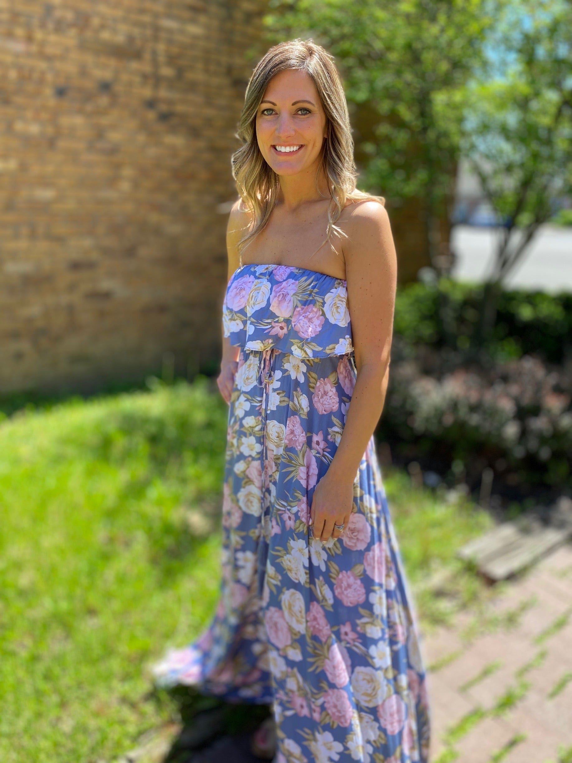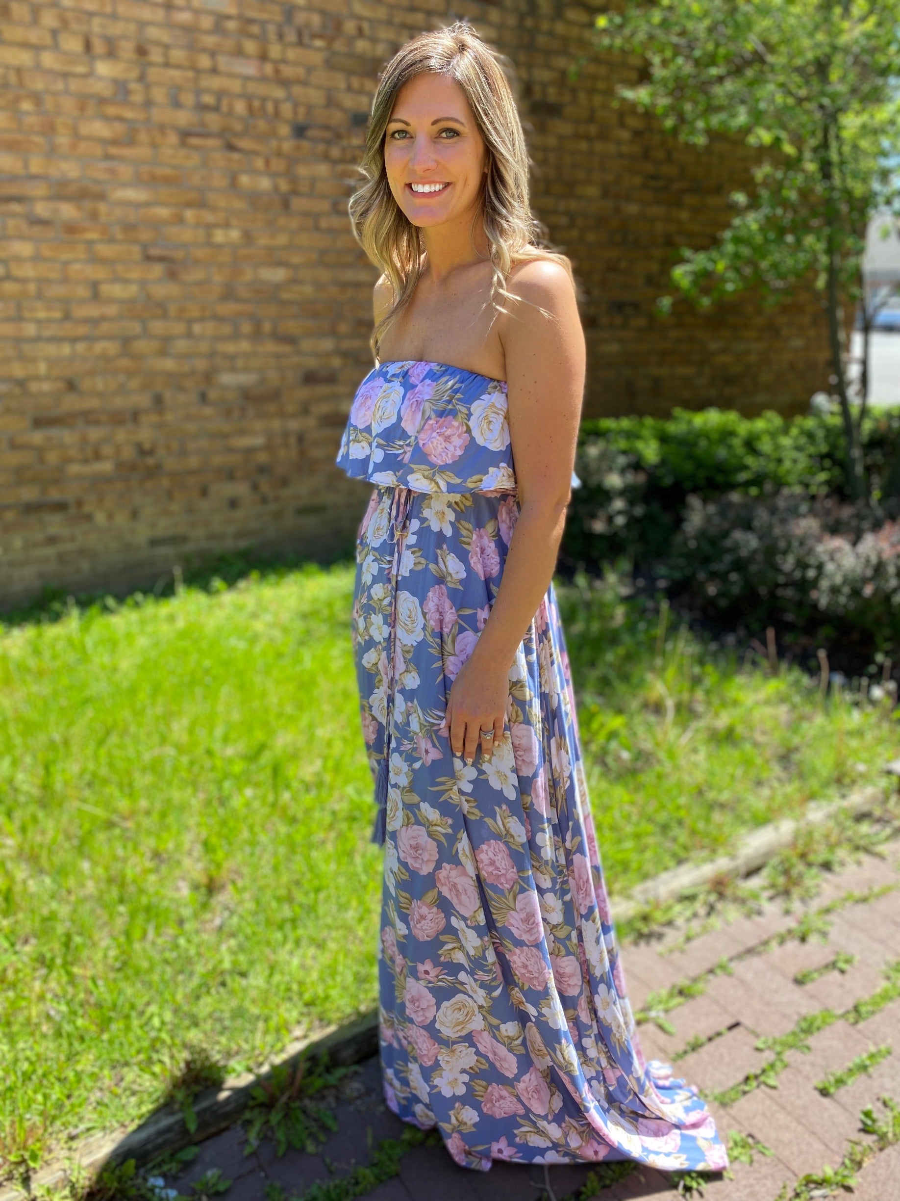 Mixed Blue Floral Maxi Dress With Tie Waist And Tassel Detail.