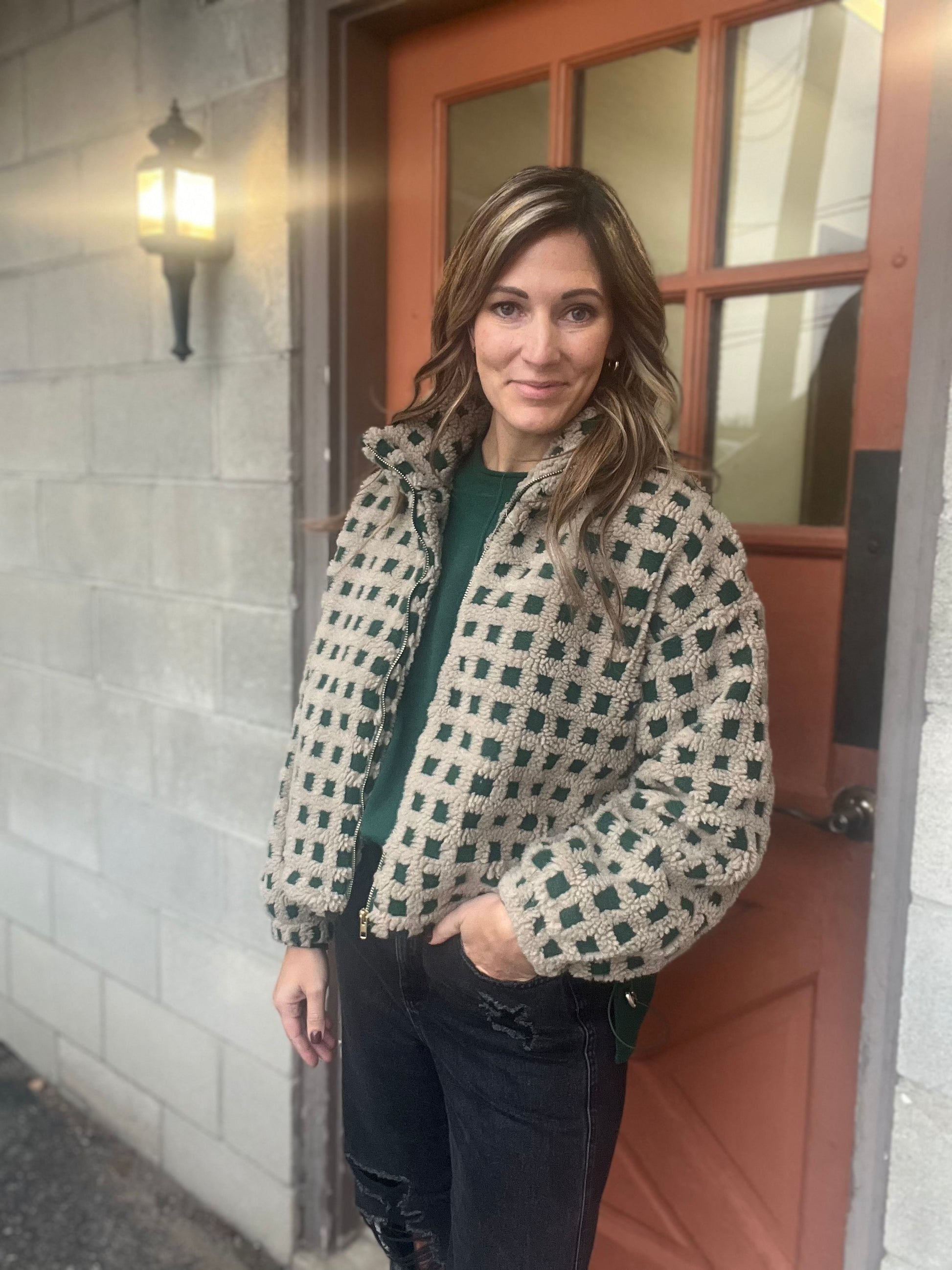 Cozy green checkered Sherpa jacket with a soft, plush texture and a striking gold zipper for a touch of shine. Perfect for layering, it combines warmth and style with a playful, standout pattern.
