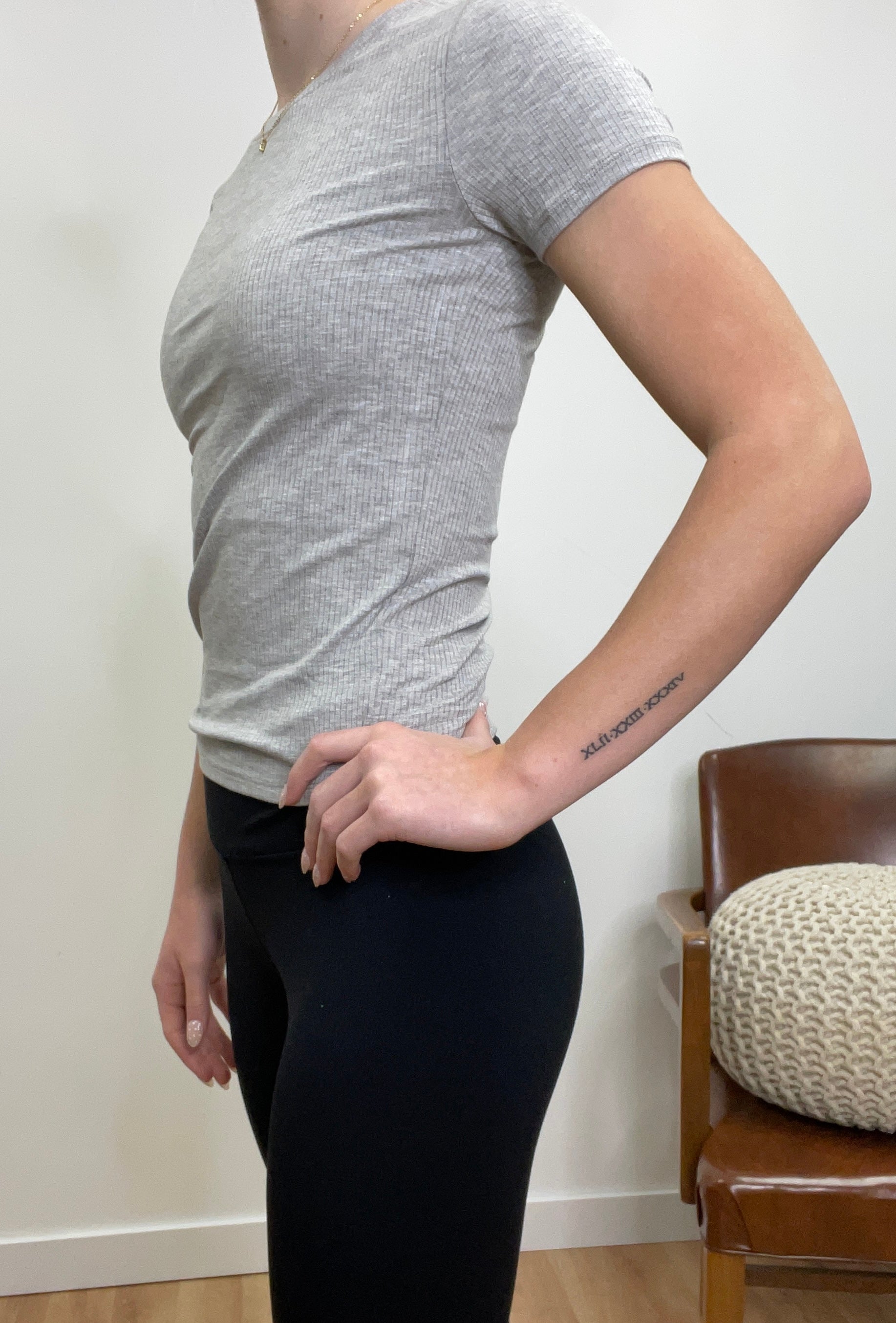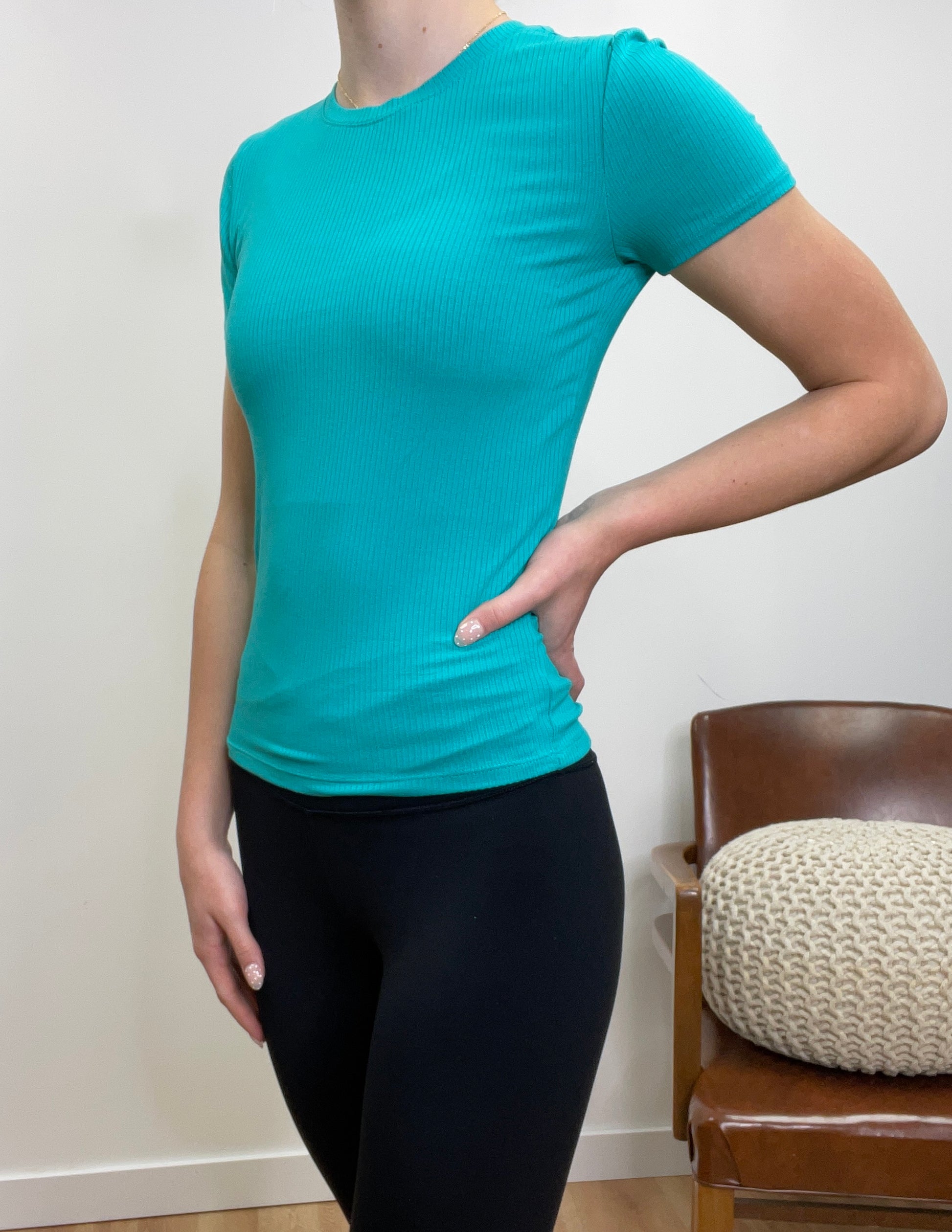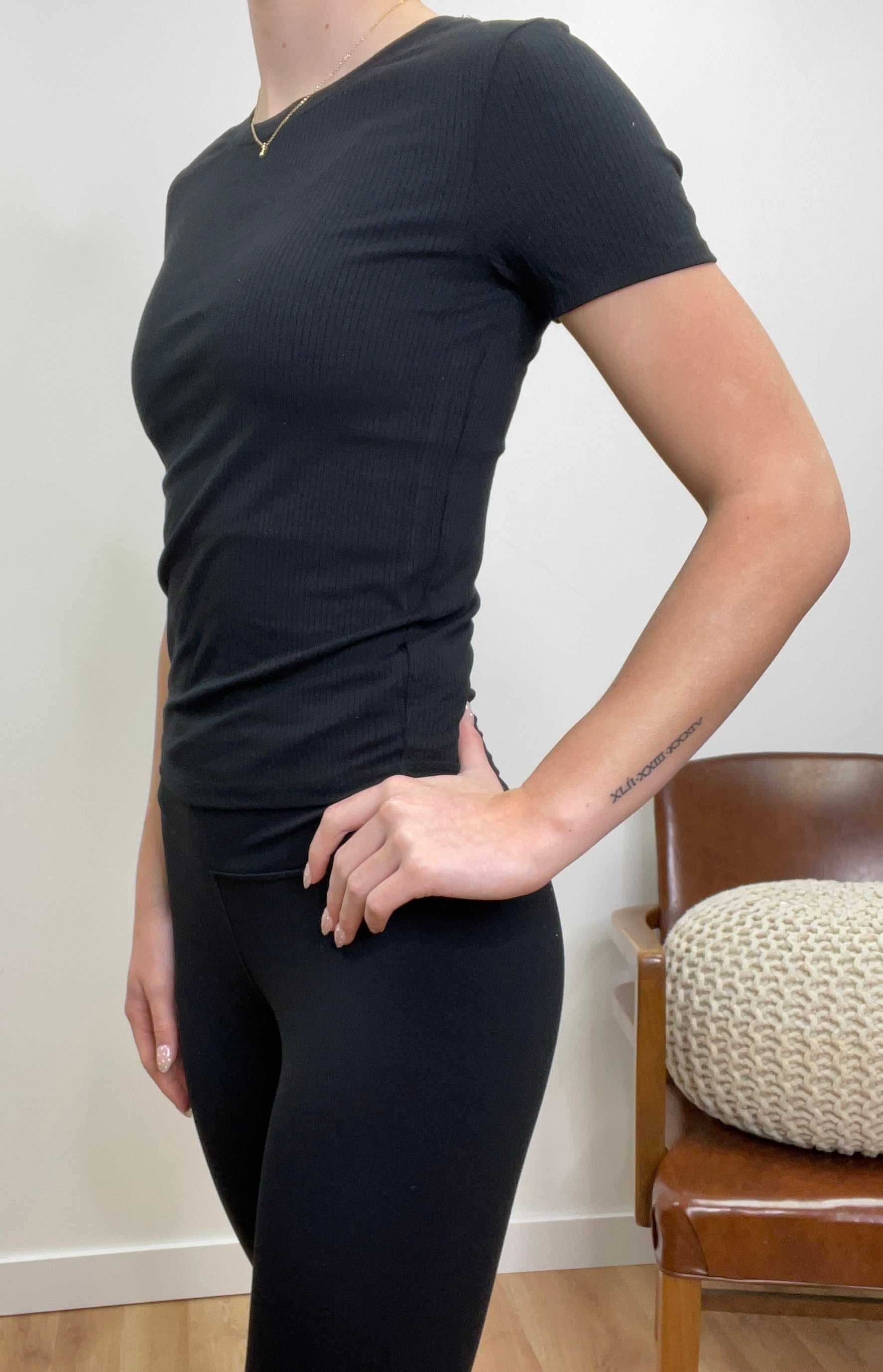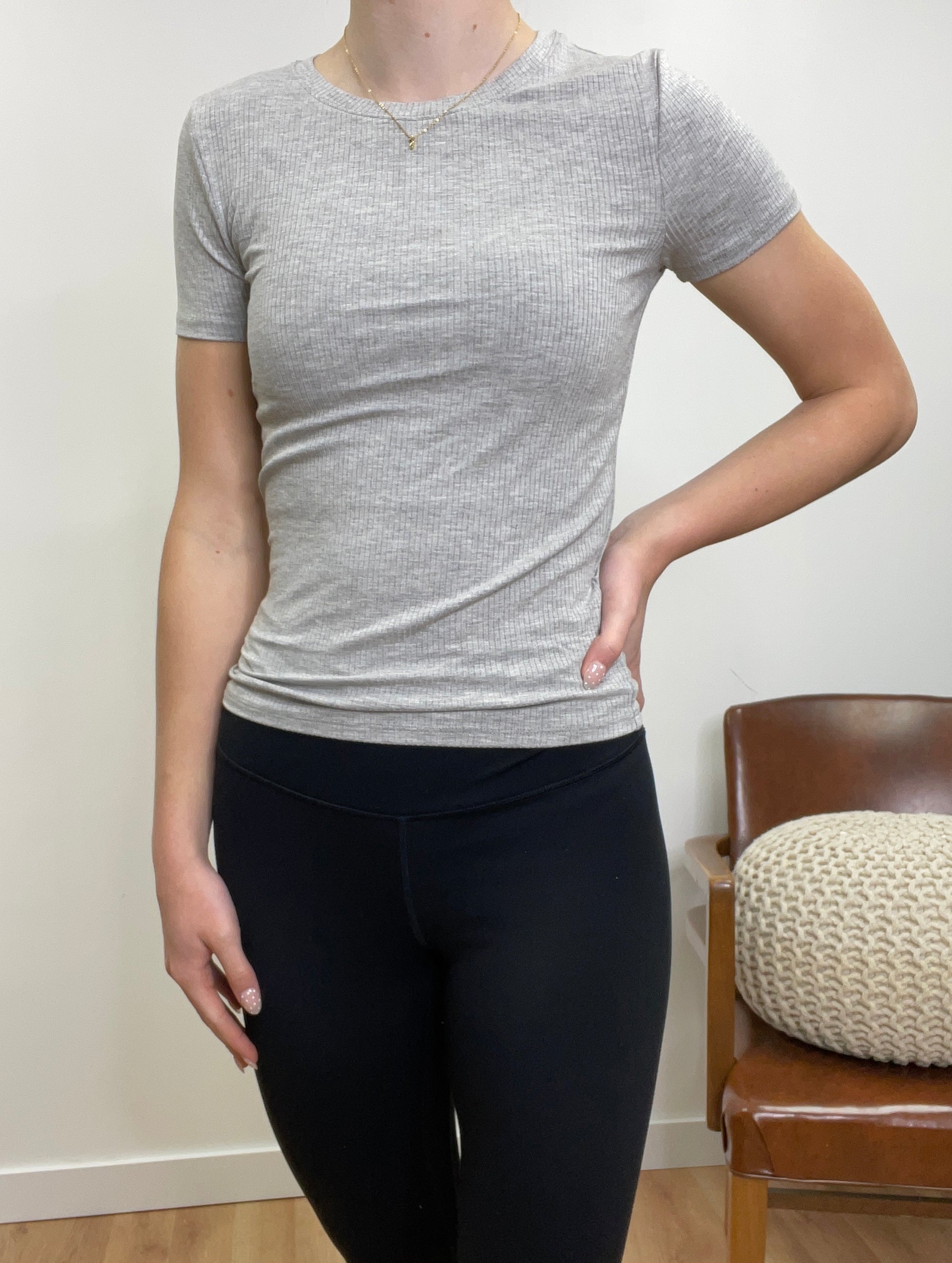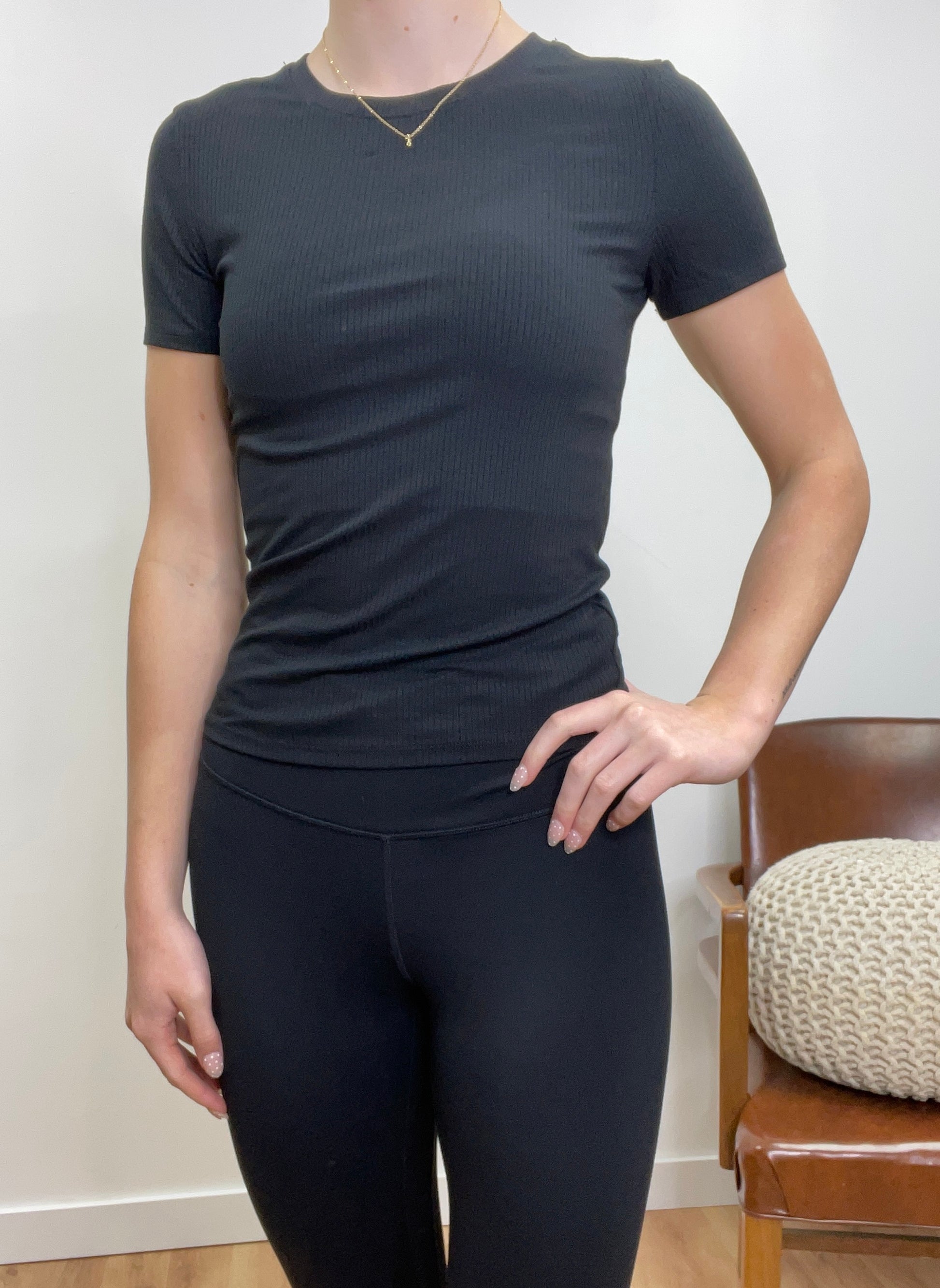 This ribbed fitted tee hugs your silhouette with just the right amount of stretch, offering a smooth, sculpted look without sacrificing comfort. With its subtle texture and clean design, it’s the perfect base layer or standalone piece—easy to dress up, down, or anywhere in between. A modern essential for effortless, everyday style.